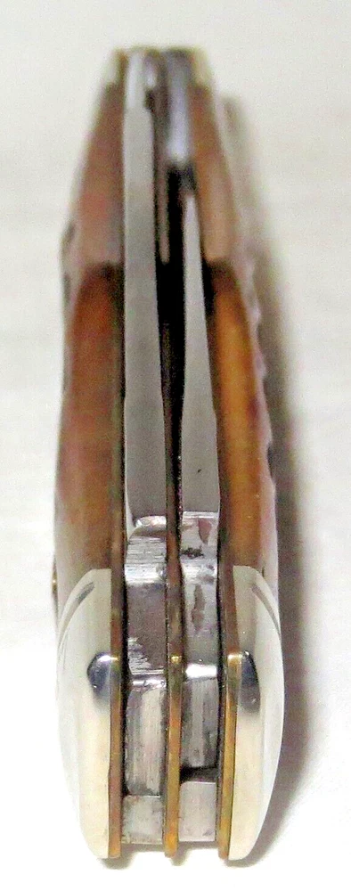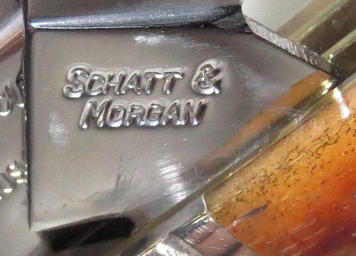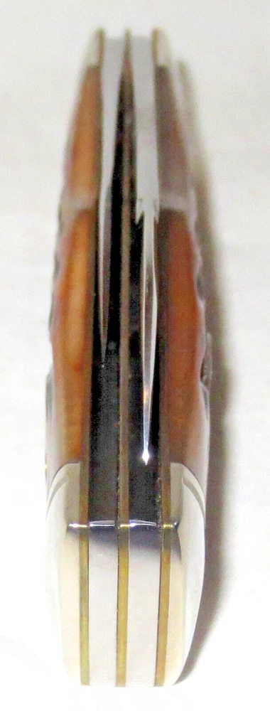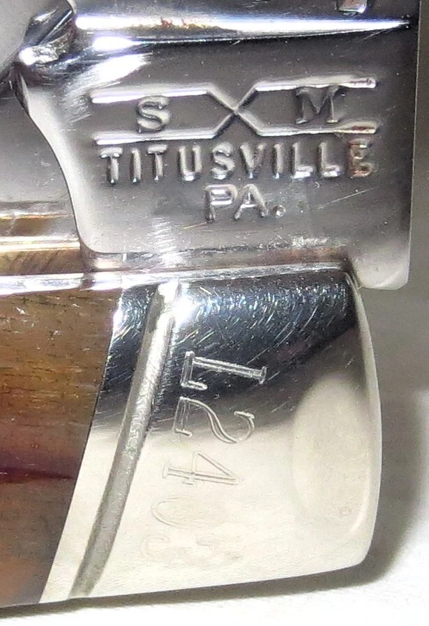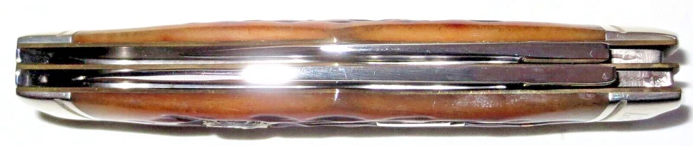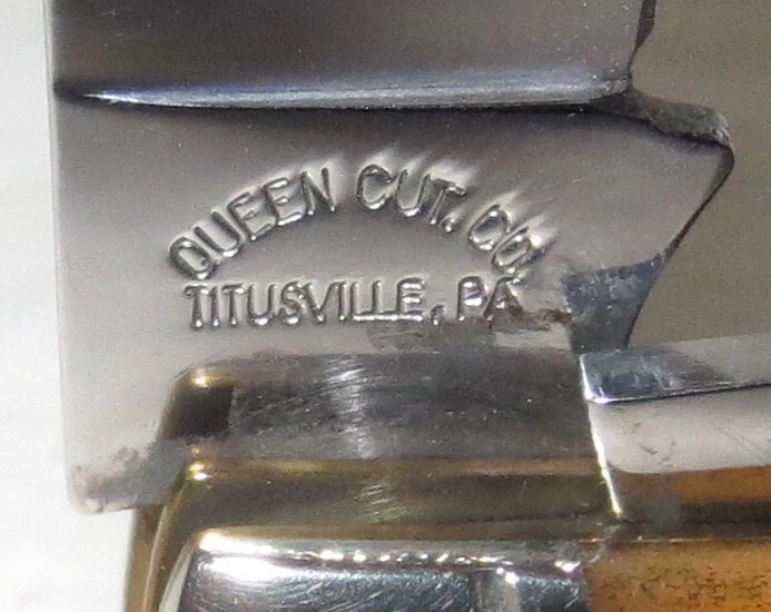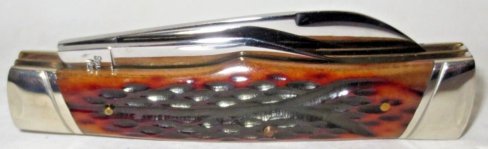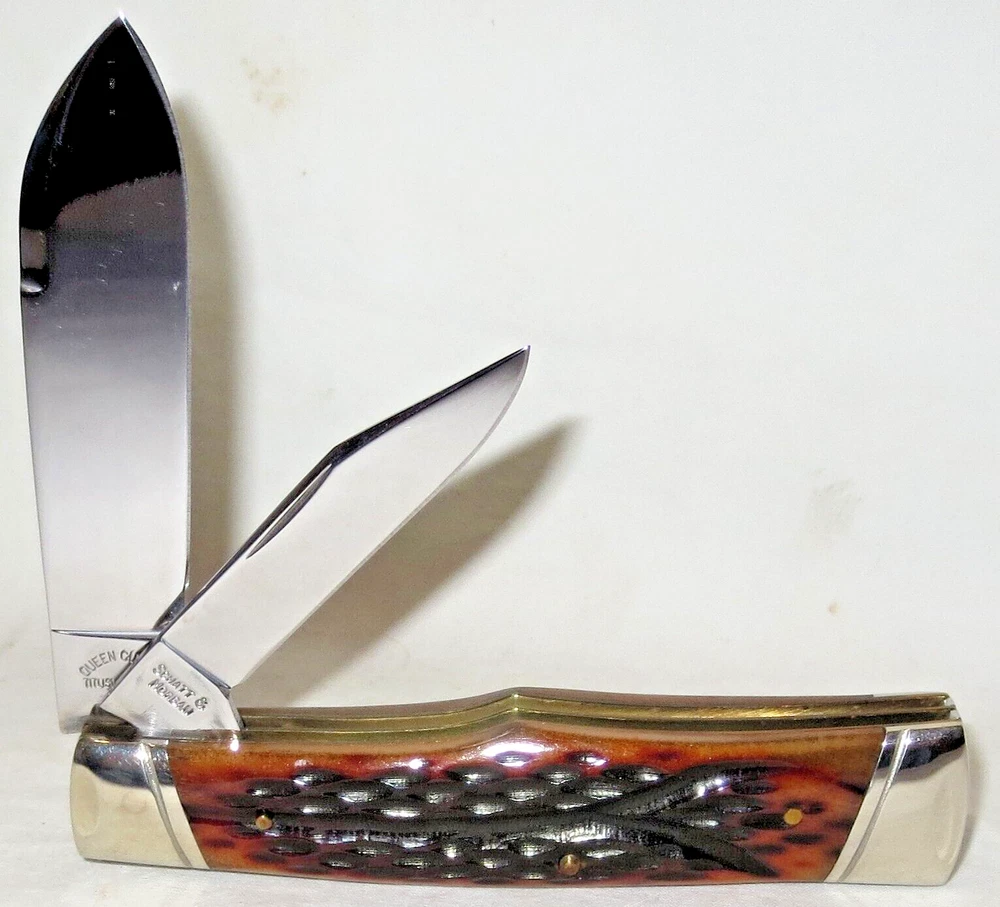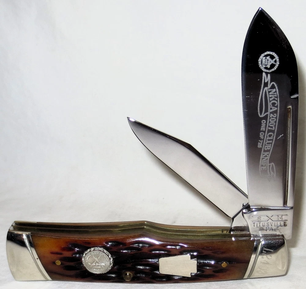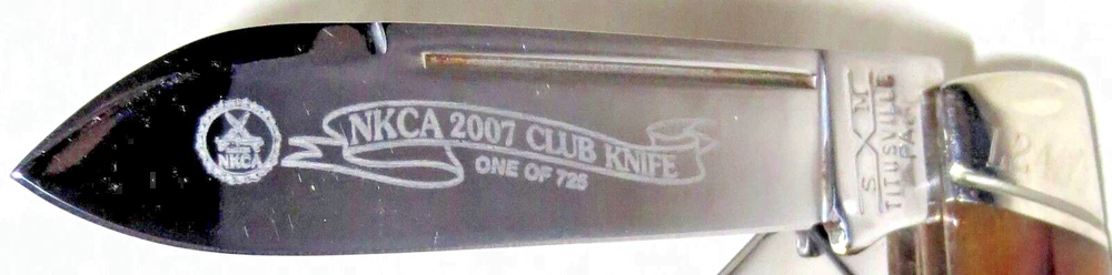 Jigged bone gunstock NKCA 2007 Club Knife marked Schatt & Morgan and Queen Cutlery Co.. New old stock but no box or papers. 3-1/2" closed, has brass liners & handle pins, nickel silver grooved slanted bolsters, "L2403" is engraved in the left front bolster, NKCA Club logo is inlaid in the left scale along with a 1/2" blank shield, and the knife weighs 3-1/4 oz. 2-3/4" spear point blade etched "NKCA 2007 CLUB KNIFE--ONE OF 725" with the NKCA trademark logo. It's tang stamped "S X M---TITUSVILLE---PA." on one side and "QUEEN CUT. CO.---TITUSVILLE, PA." on the other side. 2-1/4" clip point blade tang stamped "SCHATT & MORGAN". The knife has not been carried, used, or resharpened. Other collector knives listed.