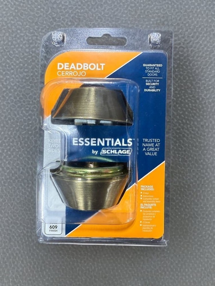 About This Product The ESSENTIALS by Schlage Satin Stainless Steel Double Cylinder Deadbolt offers strength and durability from a trusted name in security at a great value. It is guaranteed to fit all standard doors, and installs in-minutes with just a screwdriver. Plus, it is backed by our limited lifetime mechanical guarantee. Highlights Deadbolt operates with key both outside and inside Ideal for residential exterior doors where keyed entry and keyed exit security is needed Key required to unlock and exit from the inside Fits 1-3/8 in. to 1-3/4 in. thick doors Universal latch adjusts to fit 2-3/8 in. or 2-3/4 in. backset Latch features rounded corner faceplate and drive-in collar option Features limited lifetime mechanical, and limited 5-year finish warranty Includes 2 keys Mounting hardware included Product Information Model # VD62 V 609