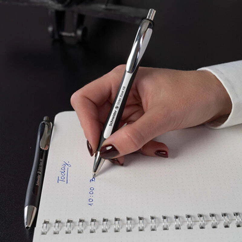Schneider Slider Rave Ballpoint Pen, White & Black Extra Broad (XB) Blue Ink Color The Schneider Slider Rave is a retractable pen with a comfortable non-slip, ergonomically-shaped barrel for relaxed writing without hand fatigue. Smoother than gel! The Slider has established itself as a top-quality ballpoint utilizing Schneider's innovative Viscoglide ink - a high-performance hybrid ink that combines the best features of traditional ballpoint ink and gel ink. Super-smooth writing action and very fast-drying, the Viscoglide technology ensures exceptionally easy, gliding writing. The ink dries quickly so that a highlighter can be used without smudging the writing. Equipped with a Slider refill - also accepts any Parker-style refill. Made in Germany. Blue ink is waterproof. XB point line width: 1.4 mm