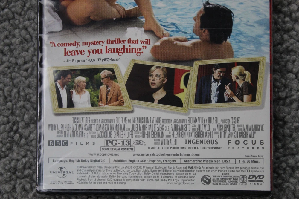Scoop Focus Features Widescreen DVD Woody Allen Huch Jackman New Sealed The DVD is brand new and sealed in the original plastic. Take a look at the photos for more details. DVD Description: In 2005, famed New York City filmmaker Woody Allen made MATCH POINT, a murder mystery set in London, starring Scarlett Johansson. Allen remains in London for the follow-up, the murder mystery SCOOP, again with Johansson, but this time he jumps in front of the camera as well. Woody plays Sid "Splendini" Waterman, a pathetic magician who somehow conjures up the ghost of Joe Strombel (Ian McShane), a recently deceased ace reporter who has been given a great scoop from beyond the grave. Strombel's spirit links onto young journalism student Sondra Pransky (Johansson), demanding that she get the story--and get it right. Pretending to be father and daughter, Sid and Sondra get into the good graces of Peter Lyman (Hugh Jackman), a wealthy British lord who just might be the Tarot Card Killer, a madman who has been terrifying London by brutally murdering prostitutes. Against her better judgment, Pransky starts falling for the charming playboy even as she gathers more and more evidence that points to him as the probable killer. Jackman and Johansson have an intoxicating on-screen romantic chemistry that is a terrific counterpoint to the manic energy she shares with Allen. While MATCH POINT was an homage to Alfred Hitchcock's STRANGERS ON A TRAIN, the comedy-thriller SCOOP pays tribute to the master director's FRENZY and NOTORIOUS. Allen also manages to get one of his favorite characters--Death (Peter Mastin) into the film. The score includes works by Tchaikovsky, Strauss, and Grieg as well as swinging numbers by Xavier Cugat and Lester Lanin. All items are shipped with Tracking Information 100% AUTHENTIC PRODUCT Please view all photos, descriptions, and details We offer the best in sporting goods, sneakers and more! Feel free to contact us about bundles and with any questions, we do consider ALL offers!