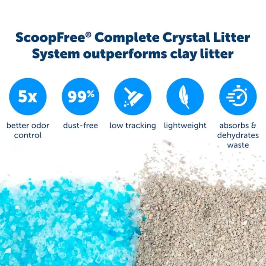 ScoopFree Crystal Classic Self-Cleaning Litter Box Overview: Say goodbye to the hassle of scooping litter! The ScoopFree Crystal Classic Self-Cleaning Litter Box allows you to forget about scooping, cleaning, or refilling your cat's litter box for weeks at a time. This innovative litter box utilizes crystal litter, which offers five times better odor control compared to traditional clumping litter. The crystal litter effectively absorbs urine and dehydrates solid waste, keeping your home smelling fresh. Key Features: Effortless Maintenance: Enjoy weeks without the need for scooping, cleaning, or refilling your cat's litter box. Exceptional Odor Control: The crystal litter neutralizes odors by absorbing urine and dehydrating waste. Each unit comes with one disposable ScoopFree Complete litter tray pre-filled with crystal litter. Mess-Free Floors: The low-tracking crystal litter is 99% dust-free and doesn't cling to your cat's paws, helping to keep your floors clean. Leak Protection: Disposable trays feature a plastic lining to prevent leaks, ensuring your floors stay spotless. Simple Cleanup: When it's time to clean, just remove the tray and toss it away. Each tray includes a lid for convenient disposal. Safety Warning: This product may expose you to chemicals, including Amorphous Silica, which is known to the State of California to cause cancer. With the ScoopFree Crystal Classic Self-Cleaning Litter Box, you and your cat can enjoy a cleaner, more pleasant environment with minimal effort!