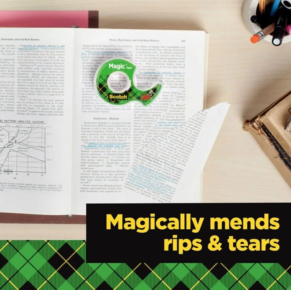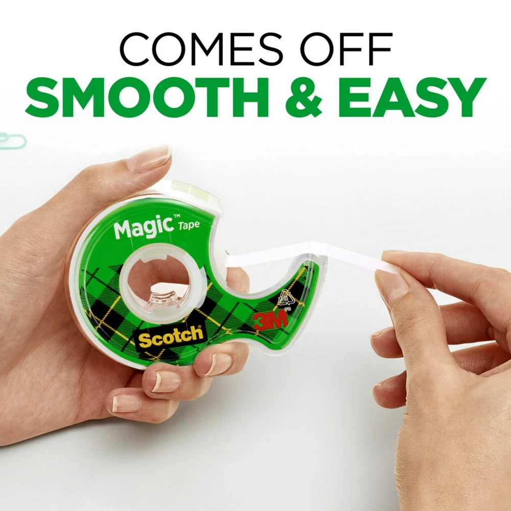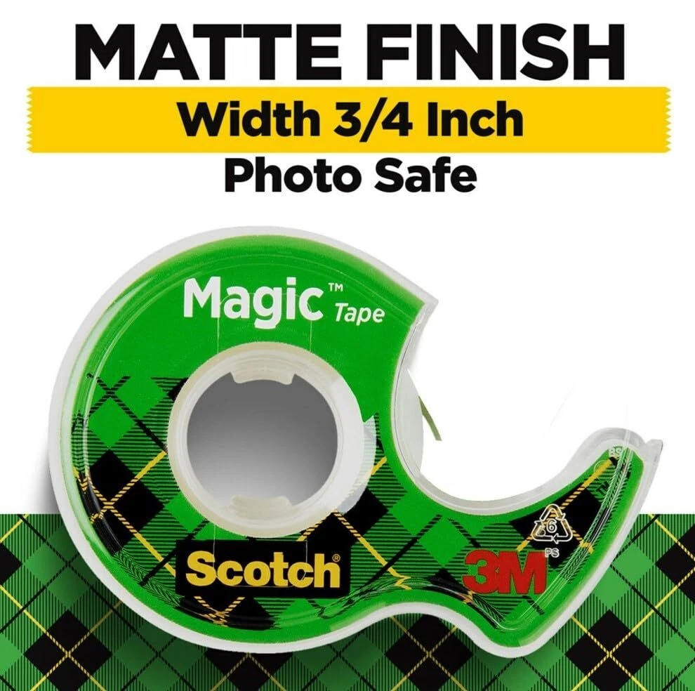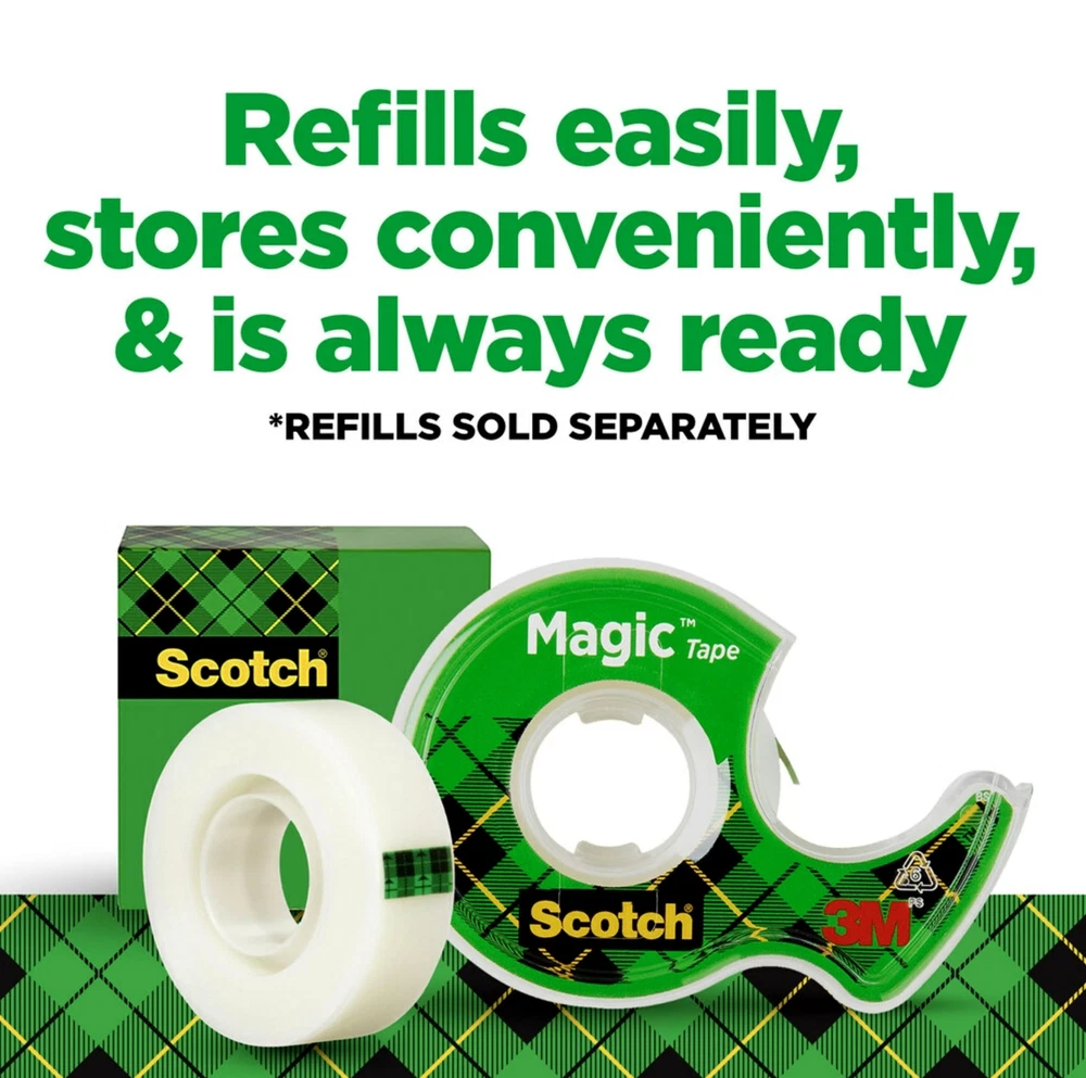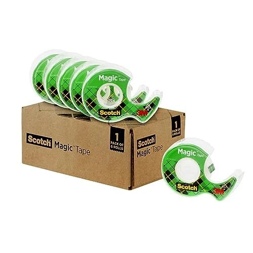 Scotch Magic Tape lets you magically mend the many rips and tears of life - securely, permanently and invisibly. The original matte-finish invisible tape uses unique 3M adhesive technology to bond tightly with paper and disappear without a trace. It's the ideal matte tape for permanent, secure paper mending, whether you need to make a quick fix or an addition to your project. This clear tape is also perfect for fixing torn or ripped originals, like birth certificates or library book pages. Easy to apply, this office tape is photo-safe for worry-free mounting or mending of special photos. You can even write on this adhesive tape with a pen, pencil or marker, making it easy to label items. With the easy-to-use Scotch tape dispenser (included), Scotch Magic Tape rolls out smoothly and cuts easily with no time, energy or tape wasted. These dispensers are a convenient addition to school, classroom supplies or office supplies. Make an eco-conscious choice: refill and reuse the included hand-held office tape dispenser with Scotch Brand Tape. The best projects start with Scotch home and office tape. INVISIBLE TAPE: 6 rolls of Scotch Magic Tape with dispenser mends rips and tears securely, permanently and invisibly BONDS SECURELY: Clear tape that gives you a strong, secure and permanent seal using trusted 3M adhesive technology BLENDS IN: Matte finish and invisible, this tape blends in with paper, making it a great addition to your back to school supplies IDEAL FOR: Use this office tape for permanent, secure paper mending, including mounting, quick fixes, project additions and repairing original documents and photos REFILLABLE TAPE DISPENSERS INCLUDED: Tape glides off easy-to-use Scotch tape dispensers (included) smoothly and cuts easily ADDITIONAL BENEFITS: This photo-safe tape is easy to apply; Plus, you can write on it with a pen, pencil or marker for easy labeling PACKAGE CONTENTS: One package with six dispensers containing six tape rolls that are 0.75 in. x 650 in., with a 1-in. core SCOTCH BRAND: The best projects start with Scotch home and office tape