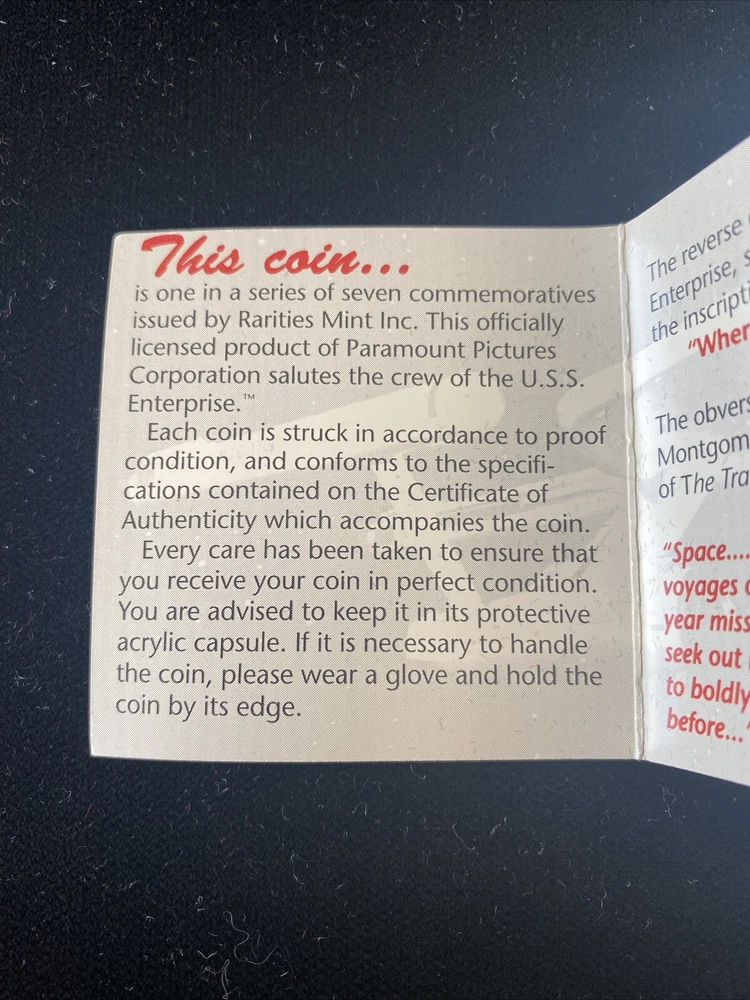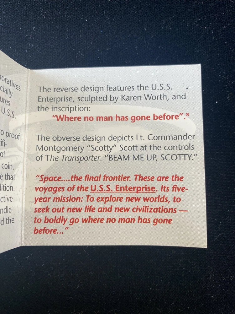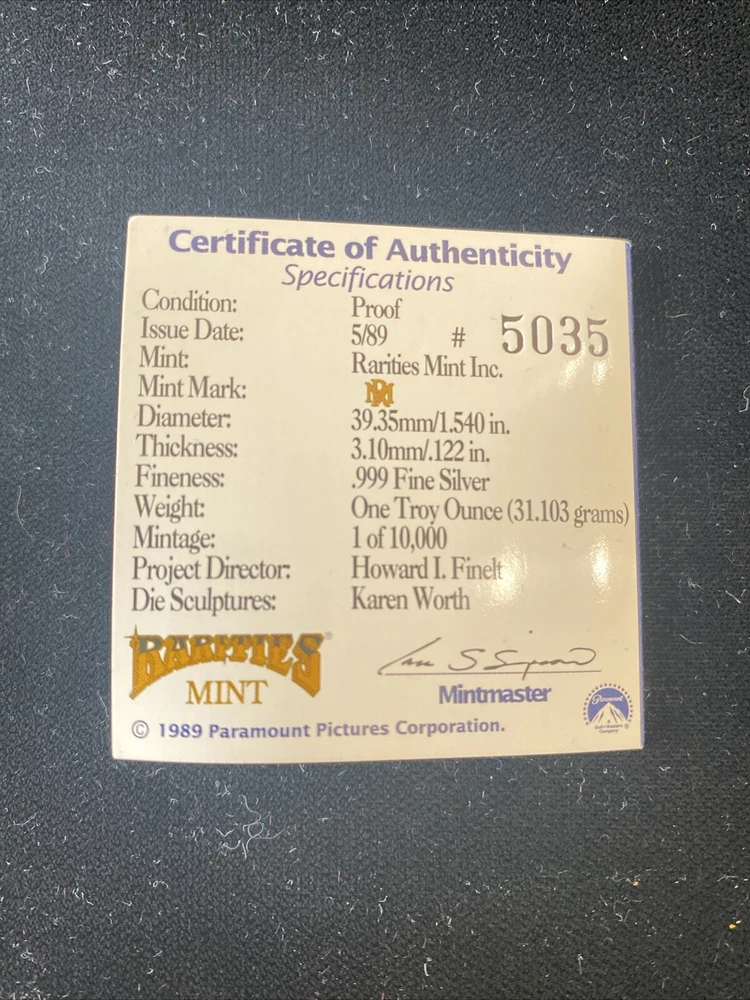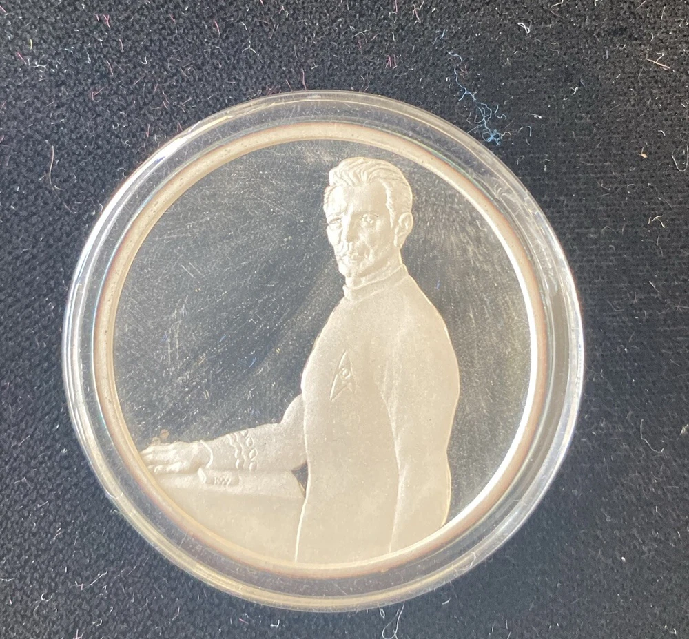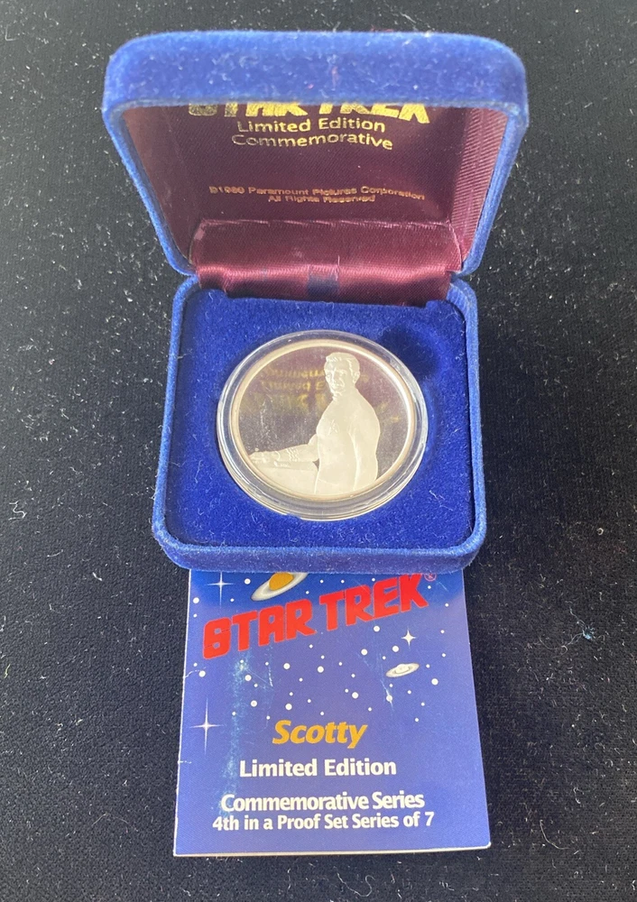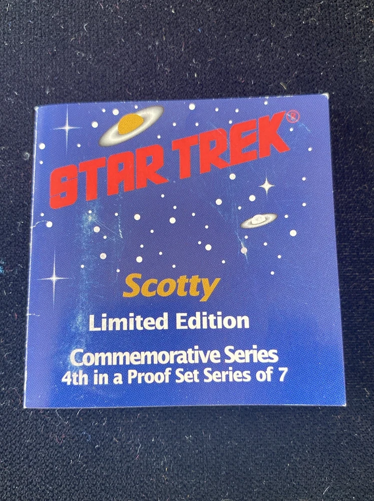 This limited edition Scotty 1989 Star Trek Commemorative Proof Coin is a must-have for any Star Trek fan. Made of .999 fine silver, it features a beautiful design of Scotty, the beloved character from the Star Trek franchise. The coin comes with a Certificate of Authenticity, ensuring its quality and rarity. This coin is a perfect addition to any collection of Star Trek collectibles or science fiction and horror memorabilia. It is a rare find, and its intricate design and high-quality materials make it a true treasure. Don't miss your chance to own this unique piece of Star Trek history.