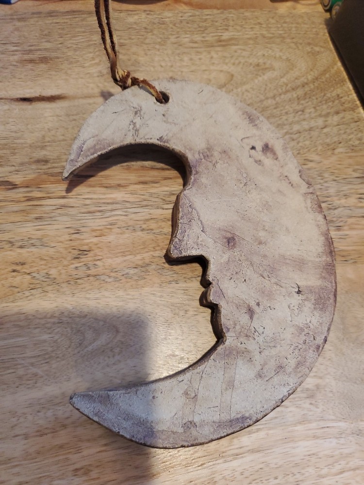 Add a touch of bohemian charm to your home decor with this beautifully crafted wall art plaque. The piece features a sculpted clay crescent moon with a face. Measuring 7.75 inches in height, 5.5 inches in length, and 1 inch in width, this original piece is perfect for adding a unique touch to any room. The wall hanging is perfect for those who appreciate art and want to make a statement with their decor. The plaque is made from high-quality clay material, ensuring durability and longevity. It is a great addition to any art collection or as a standalone piece. Transform your space with this one-of-a-kind Sculpted Clay Crescent Moon Face Man In The Moon Wall Art Plaque. The piece is in excellent condition with no chips or cracks. Shelf F