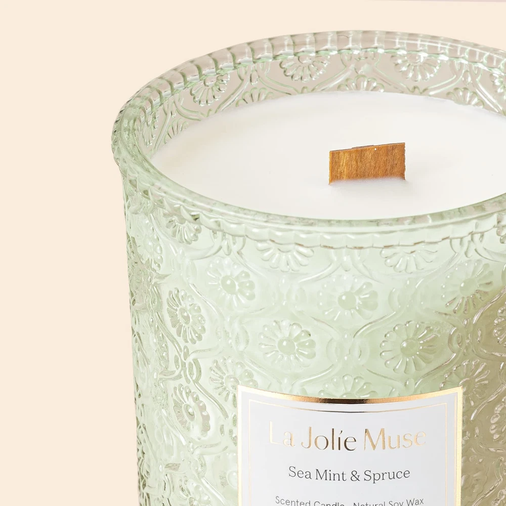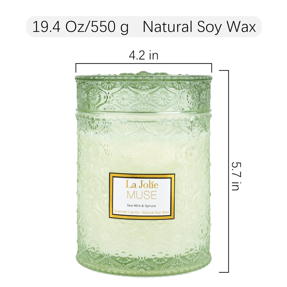 MARINE WORLD - When refreshing Eucalyptus and Peppermint muddled with rustic Cedarwood and Fir Balsam, this gratifying aroma is promised to offer full sensory experiences like strolling along the breezy coast. DECORATIVE JAR CANDLE - Embossed delicate daisy patterns adorn a thick, luxury glass jar. The jar itself is a statement home décor piece. A perfect gift idea that soothes and beautifies any space. LARGE CANDLE - 19oz/539g. This large natural soy wax candle offers in-depth relaxation for approximately 90 hours and is vegan, cruelty and paraben-free and biodegradable. WOOD WICK DESIGN - Designed with a natural, non-toxic wood wick, this candle gives off a soft, nostalgic, crackling sound with minimal soot when burning. A WELL-LOVED LUXURY - Part of our most beloved series with lots of love from repeat customers, there are 10 unique colors and scents. Find your signature scent now.