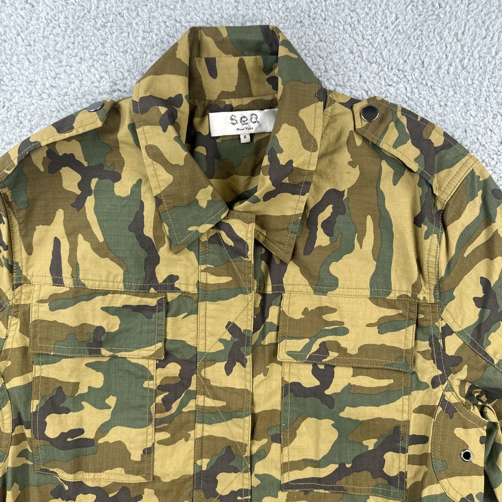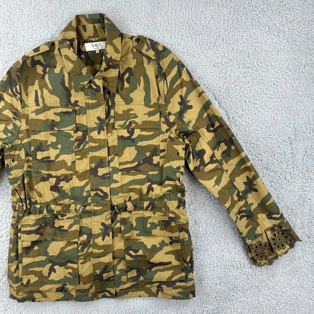 This Sea New York women's jacket in size S features a unique camouflage pattern with eyelet lace trim. The mid-length military-style jacket is made of comfortable cotton material, perfect for casual occasions. The multicolor design adds a pop of color to any outfit, making it a great addition to any wardrobe. Ideal for those who love colorful and unique fashion, this jacket is sure to make a statement.