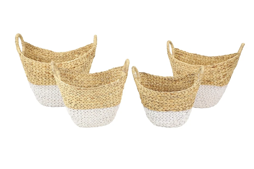 Use in your living room as home storage for throw blankets and pillows, bathroom for towels, or anywhere in the house as decorative baskets. This item ships in 1 carton. Due to the handmade nature of these, there will be slight color, shape, and size variations, as well as loose fibers. Suitable for indoor use only. This item ships fully assembled in one piece. Maximum weight limit is 5 lbs. Made in Vietnam. This brown colored basket organizer comes as a set of 4. Contemporary style. CONTEMPORARY THEME Embrace artistic expression with a style that highlights bold designs with sleek lines, neutral elements, and a minimalist aesthetic MADE OF SEAGRASS These wicker storage baskets are woven using dried water hyacinth fibers BROWN AND WHITE UNFINISHED FINISH Natural light beige water hyacinth rattan is braided into staggered oval shapes with curved silhouettes and circular handles FEATURES OVAL STORAGE BASKET Four nesting, oval, natural wicker baskets with white color blocking and easy-carry handles 4 PIECES CONVENIENTLY SIZED This item measures 17L x 15W x 17H, 15L x 14W x 15H, 13L x 13W x 14H, 12L x 11W x 13H inches, and weighs 6 lbs
