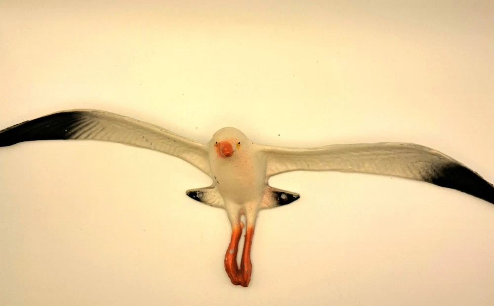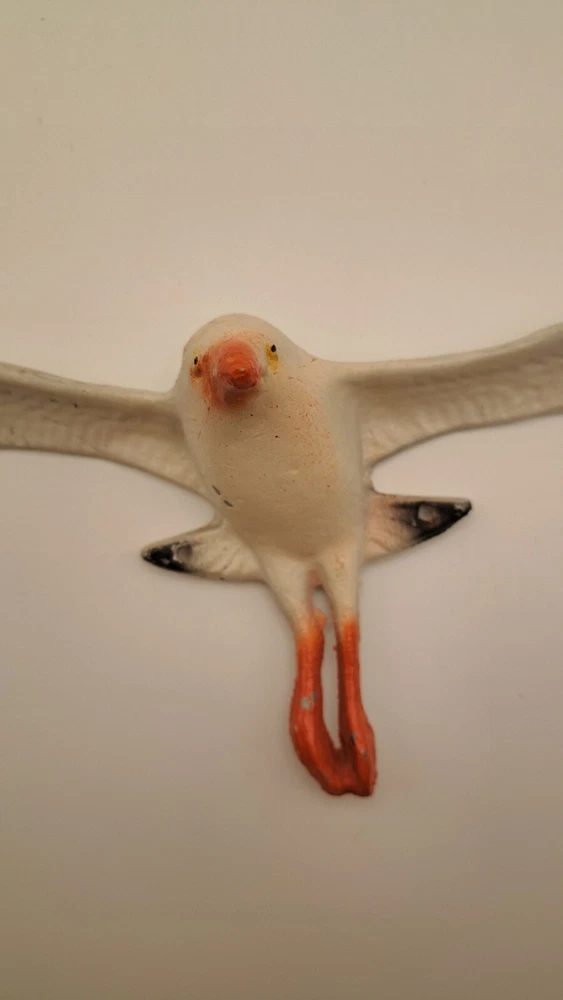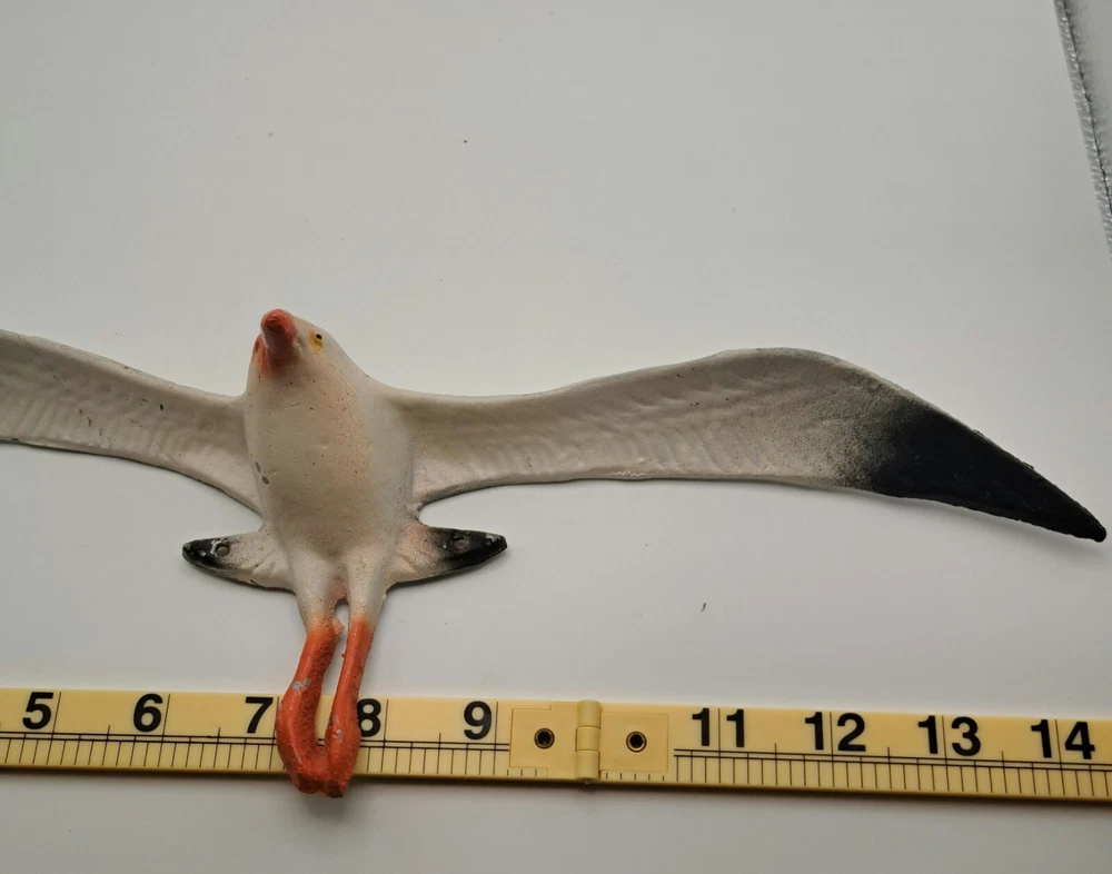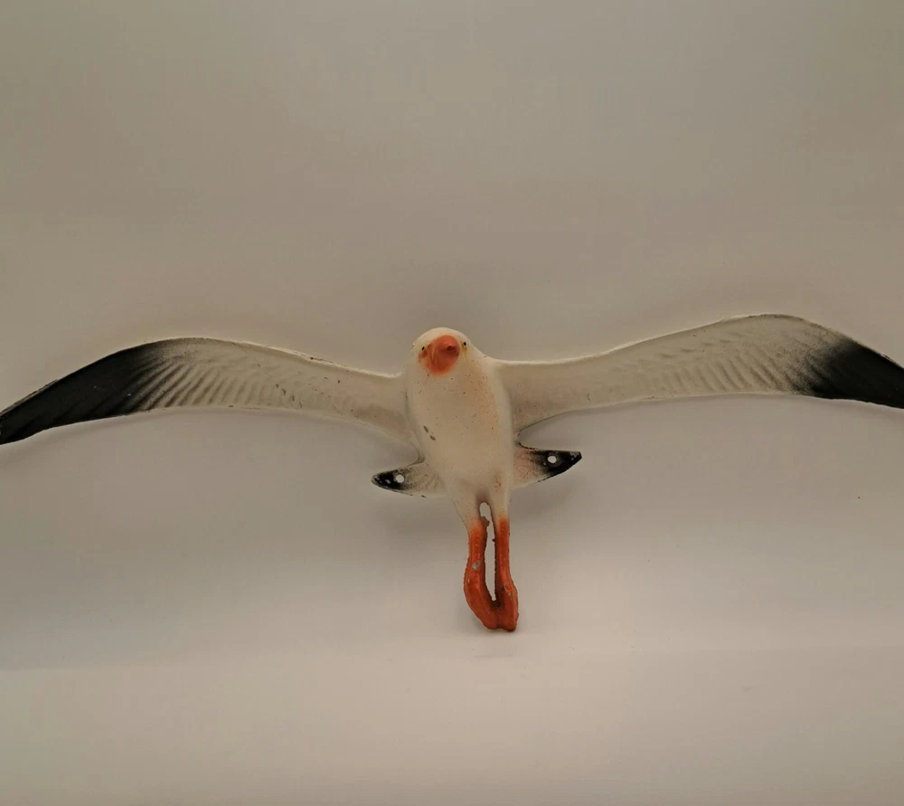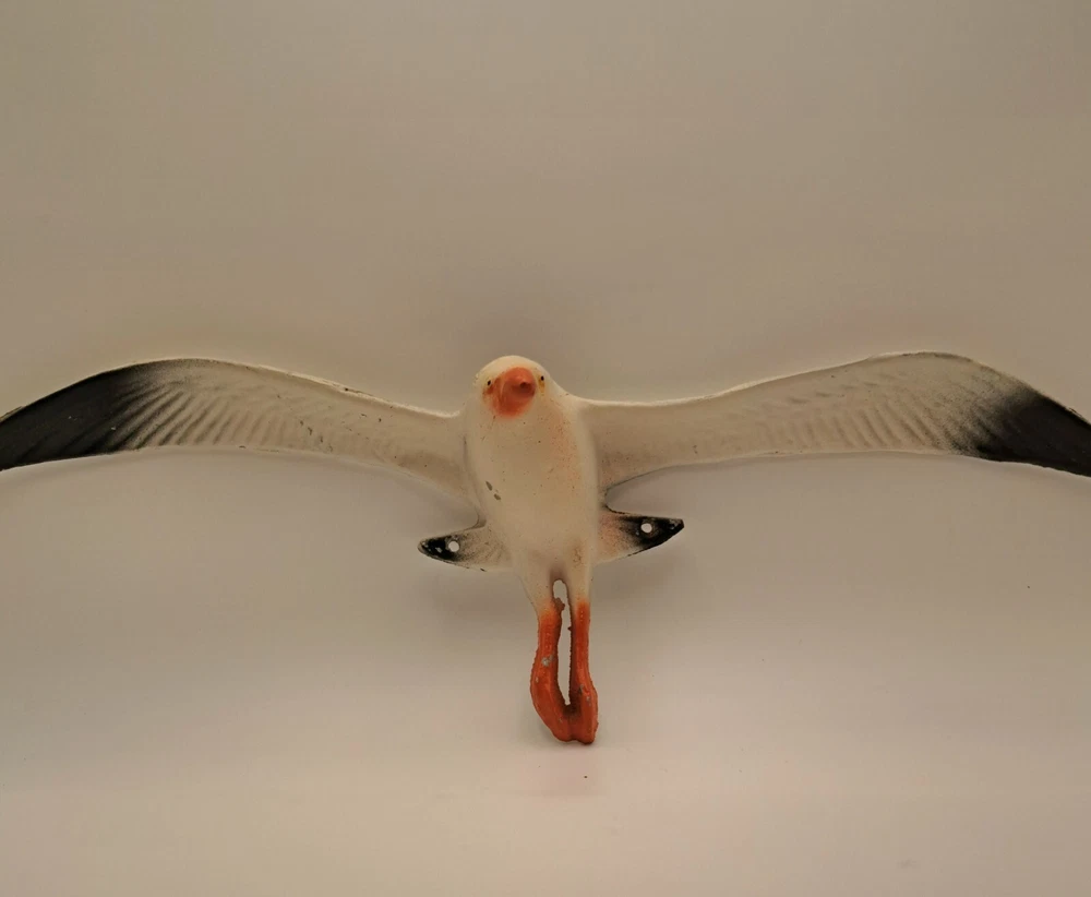 Add a touch of coastal charm to your home decor with this beautiful seagull wall hanging. Made from durable and lightweight aluminum, with a 14 inches wing span and about 4 inches height at the body. The item is vintage from the 70's so some paint loss in a few spots. Pre-made holes for mounting.