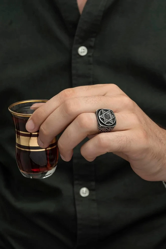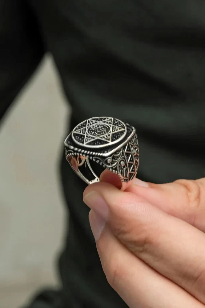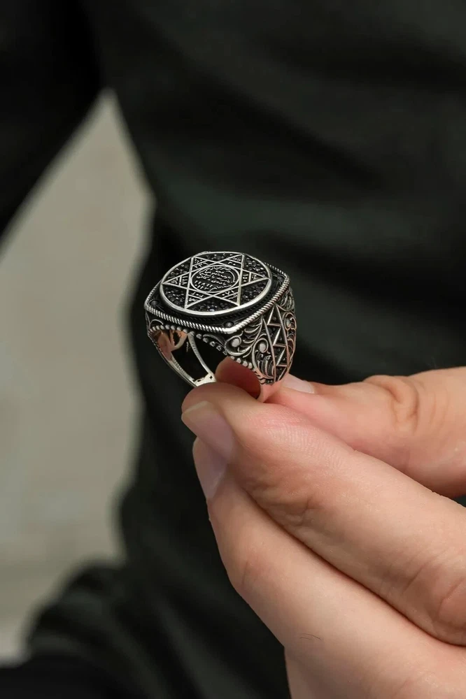 The Seal of Solomon Ring is made of 925 sterling silver and features a black agate stone, creating an elegant and mystical design. This unisex adult ring serves as an amulet and talisman, believed to bring protection and positive energy to the wearer. The intricate Seal of Solomon design adds a touch of symbolism and spirituality to the piece, making it a unique and meaningful accessory for men.