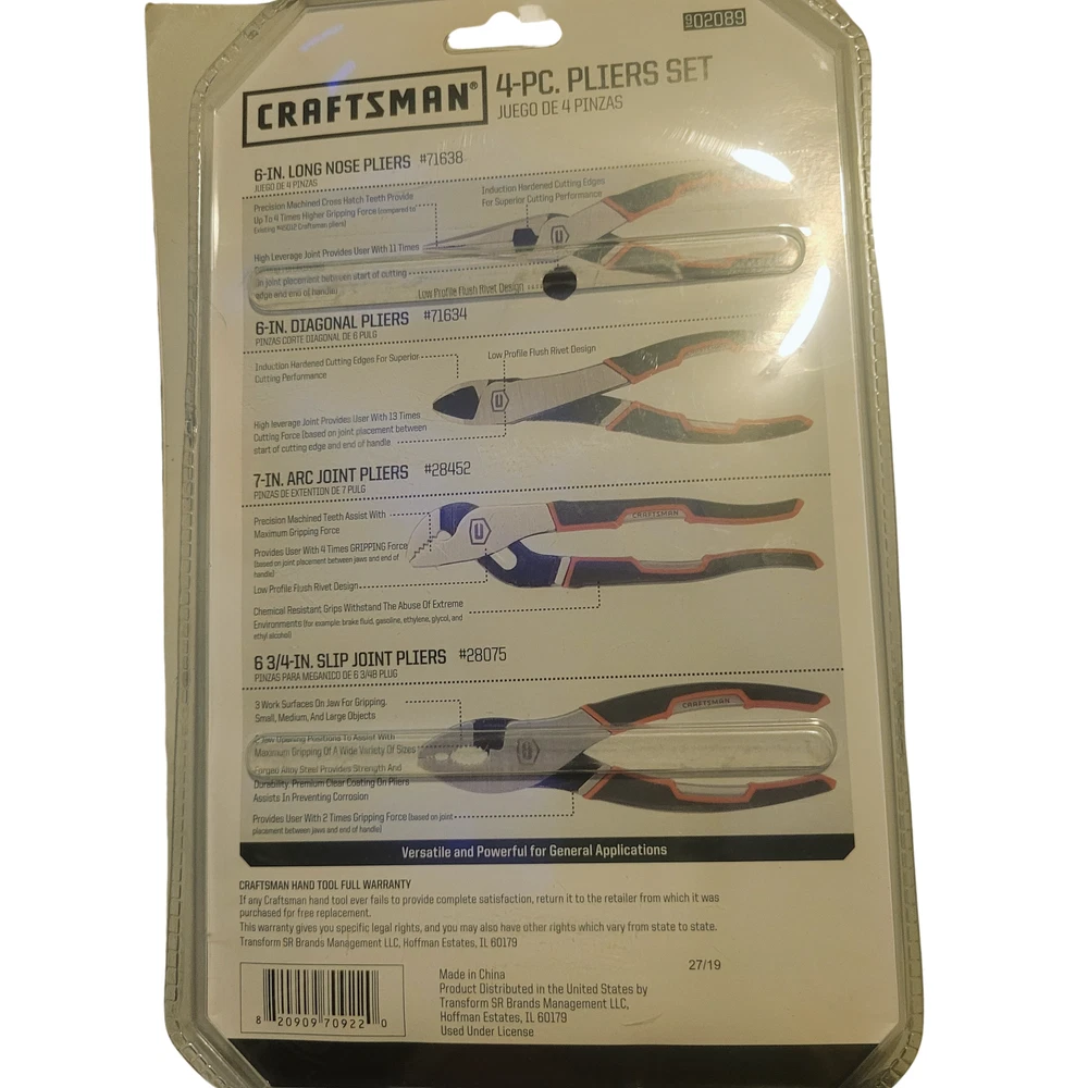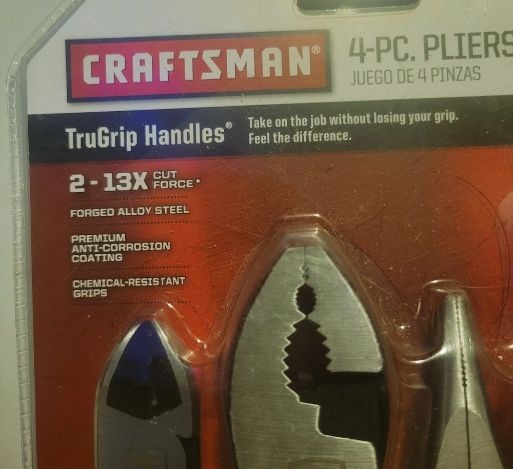 6-in Long Nose Pliers #71638 (Needle Nose) - See pics for specs 6-in Diagonal Pliers #71634 - See pics for specs 7-in Arc Joint Pliers #28452 - See pics for specs 6 3/4-in Slip Joint Pliers #28075 - See pics for specs 2-13X Cut force Forged Alloy Steel Premium Anti-corrosion Coating Chemical Resistant Grips Lifetime Warranty Still in factory sealed packaging