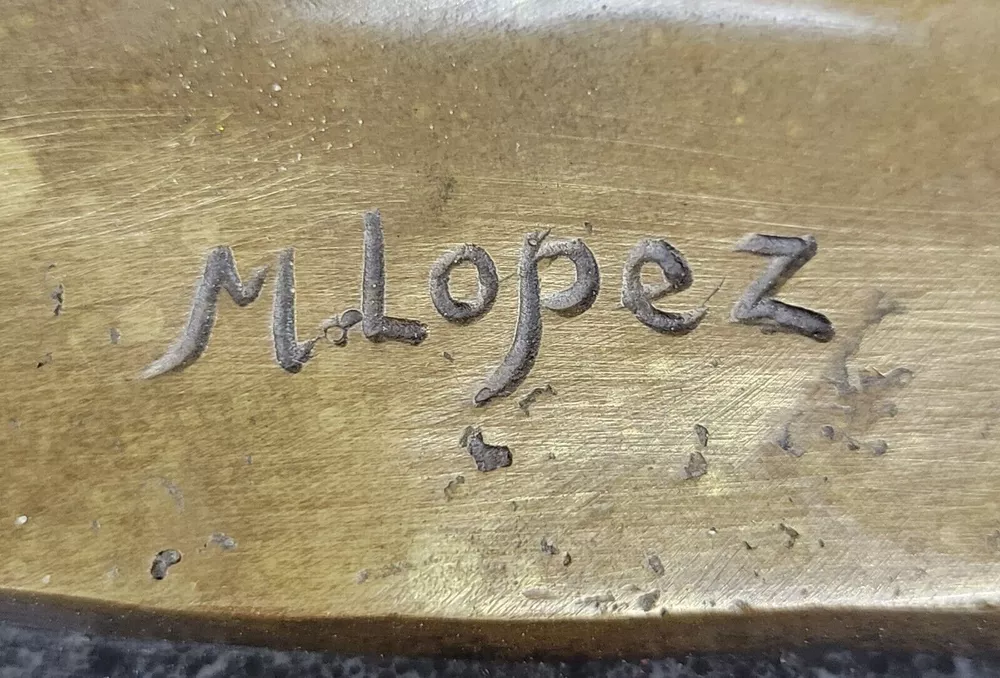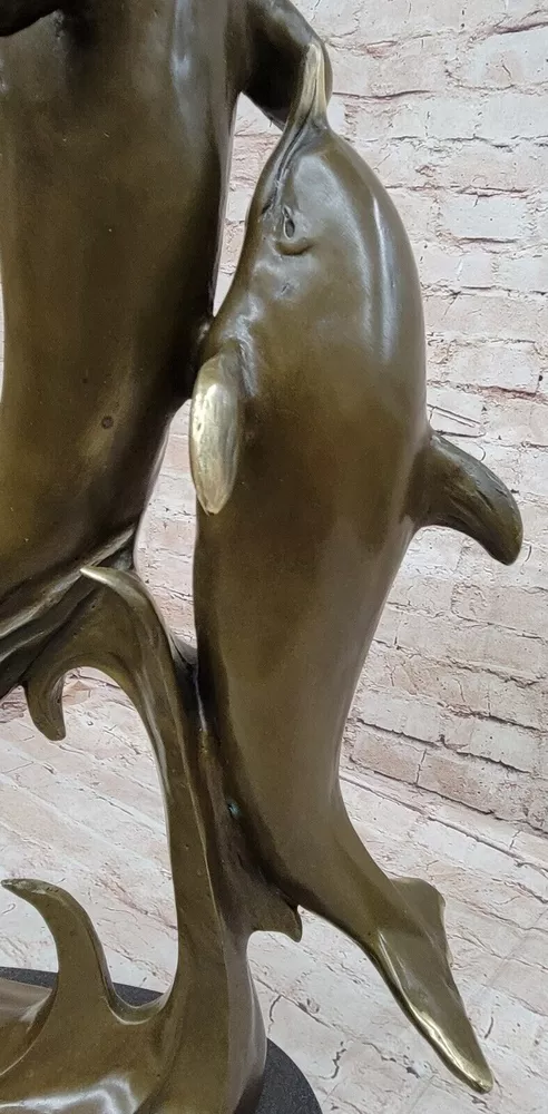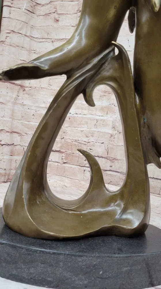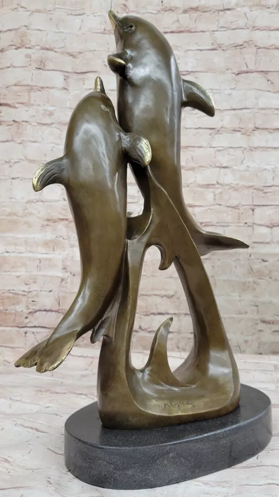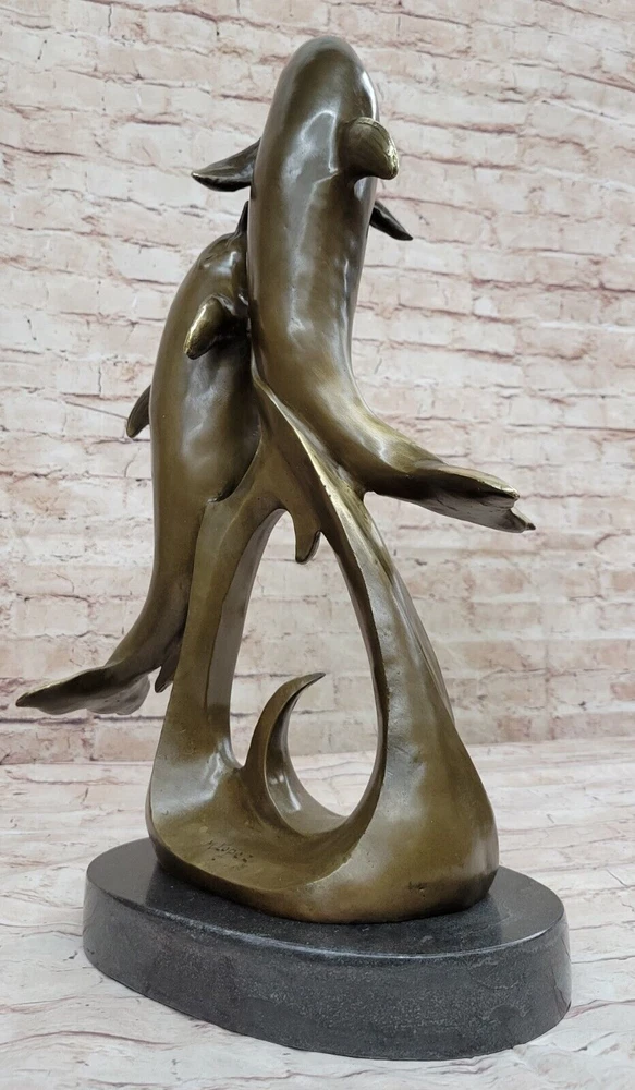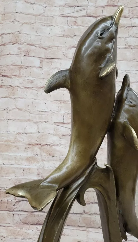 Seaside Serenity: Intricately Detailed Bronze Dolphins Figurine Signed Milo Gift Seaside Serenity: Intricately Detailed Bronze Dolphins Figurine Signed Milo Gift Condition : This sculpture is in perfect condition. Bronze Dimensions with Marble Base: Height 21" X Width 12" Marble Dimensions: Diameter 10.5" Height without base:19" Weight:26 LBS Inventory:19YDW09913991 2 Dolphins Swimming and Dancing Together Create a mesmerizing focal point in your landscape or hardscape design with the captivating "2 Dolphins Swimming and Dancing Together" Bronze Sculpture. This magnificent artwork beautifully portrays the playful nature of dolphins as they leap out of the water, capturing the essence of these friendly marine creatures. Handcrafted with meticulous attention to detail, this sculpture showcases the skill and artistry of renowned artist Miguel Lopez. Every curve and contour of the dolphins' bodies is intricately crafted to evoke a sense of grace and movement. The lustrous brown patina finish adds a touch of elegance, while the expertly applied gold highlights accentuate the fine details and bring an element of enchantment to the artwork. Whether placed in your garden, by the poolside, or as a centerpiece in your outdoor space, this bronze sculpture will add a touch of beauty and tranquility to any setting. The durable construction ensures its longevity, allowing you to enjoy the artistic allure for years to come. As a testament to its authenticity and craftsmanship, this sculpture is signed by the talented artist Miguel Lopez. Each piece is meticulously handcrafted using traditional techniques, including the lost-wax casting method, ensuring that you are acquiring a unique and timeless work of art. Elevate your outdoor environment with the captivating allure of the "2 Dolphins Swimming and Dancing Together" Bronze Sculpture. Let the harmonious presence of these majestic creatures bring a sense of joy, serenity, and wonder to your outdoor oasis. Signed Original Artwork by Miguel Lopez Two Dancing Dolphins Bronze Sculpture www.bronzhaus.com Video will open in a new window Using the eBay App? Paste link into a browser window: [isdntekvideo] Shipping Terms : Most of our items are shipped via USPS (United States Postal Service) mail or UPS. Most orders are shipped within 24-48 hours of purchase. Please be aware that not all items are available for USPS shipping due to size and weight. We do ship to Hawaii, Alaska, Canada, Puerto Rico, APO/AE, and U.S. Virgin Islands, however, an additional charge may be required. Please contact us before making any purchases in these areas. For Non-USA customers, you may be responsible for all duty, tax, brokerage fees that may be due upon delivery (shipping costs cover freight charges only). We also ship internationally. Please refer to the "Shipping and Handling" chart for the rates for each area. Payment : We accept just about any form of payment. PayPal, Master Card, Visa or American Express credit cards. Money orders, cashiers checks, and even personal or business checks. For governmental institutions, we will also accept a purchase order. Please understand that for personal or business checks we have to wait for the check to clear (usually 7 days) before shipping. Condition : New Detailed Hand Crafted Hot Cast Bronze Satisfaction Guaranteed. This is Stock Photo, Slight Color Variation!! Listing and template services provided by inkFrog