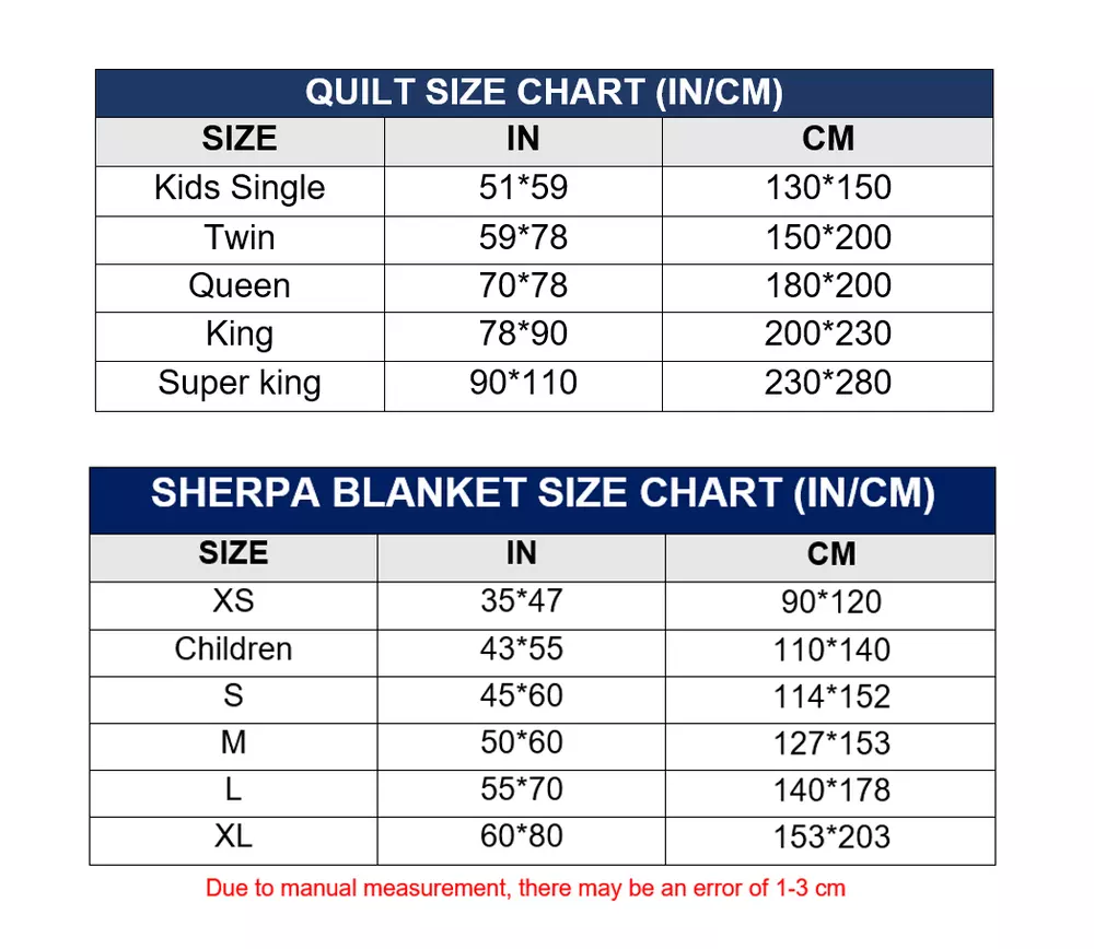 Introducing Sherpa Quilts and Quilt—your perfect choice for a combination of comfort, style, and functionality. Designed to provide exceptional softness and warmth, these blankets are perfect for relaxing after a long day or adding a touch of sophistication to your home decor. Crafted from high-quality materials and using advanced manufacturing techniques, Sherpa Quilts and Blankets ensure optimal warmth while remaining lightweight and breathable. Every stitch and seam is meticulously crafted for lasting durability and beauty. For any customization requests or additional personal touches, such as unique details or adjustments, please include your specifications in the Personalize box or contact us directly. MATERIAL : Sherpa Blanket: 100% Polyester flannel,reversible super soft cozy and magical tie-dyed on one side, plush super warm sherpa fleece on the inside, super soft, eco-friendly, and warm, the best choice for sofa, couch, bed, car, and airplane when snuggling or relaxing. Quilt: High quality polyester fiber. The outer layer of the quilt is made of breathable soft fabric, and the filling material is high-quality silk floss, comfortable to use. SIZE : Sherpa Blanket: XS: 47 x 35 (in) ~ 120 x 90 (cm). Children: 55 x 43 (in) ~ 140 x 110 (cm). S: 60 x 45 (in) ~ 152 x 114 (cm). M: 50 x 60 (in) ~ 150 x130 (cm). L: 55 x 70 (in) ~ 180 x 140 (cm). XL: 60 x 80 (in) ~ 200 x 150 (cm). Quilt : Kids Single: 130 x 150 (cm). US Twin: 150 x 200 (cm). US Queen: 180 x 200 (cm). US King: 200 x 230 (cm). US Super King: 230 x 280 (cm). Note: Due to manual measurement, there will be an error of 0.3 - 0.5cm. Please be understanding. As a result of the production batch, the light intensity photography effect will have a color difference. Care Instructions: Machine washable colors separately in cold water with a gentle cycle. Tumble dry on low heat. Avoid direct heat. Tip: Hang dry if you want to keep the Sherpa side extra fluffy! CUSTOMER SATISFACTION: We try our best to ensure every customer is completely satisfied. If you have any problems, please message us! We are happy to help. All messages will be answered within 24 hours, however there may be a delay in getting back to you due to various factors. NOTE: Please check our size chart carefully before checking out! Any custom colors, sizes, designs? Feel free to contact me. We offer a 100% happiness guarantee. Please visit our store to see more beautiful designs Frequently asked Questions: I JUST PLACED AN ORDER, WHEN WILL IT DELIVER? Please note that the processing time of your order may be affected if the information initially provided to us is incomplete or inaccurate, for example if payment is incorrect or incomplete; Address information is incorrect and product measurements are insufficient. We ask for your understanding and support should this occur. COMMENT Please contact us if you have any questions about the goods. If you are satisfied with the product, please leave positive feedback and give us a full star rating! Your satisfaction is the most important thing to us. Please contact us first if you cannot leave positive feedback! Just let us know what the problem is and we'll be happy to help CONTACT US If you have any questions or suggestions, please email us immediately. Your message will be replied within 24 -48 hours. We will try our best to solve your problem to your satisfaction. Have a nice day! Thank. On Sep 17, 2024 at 09:15:20 PDT, seller added the following information:
