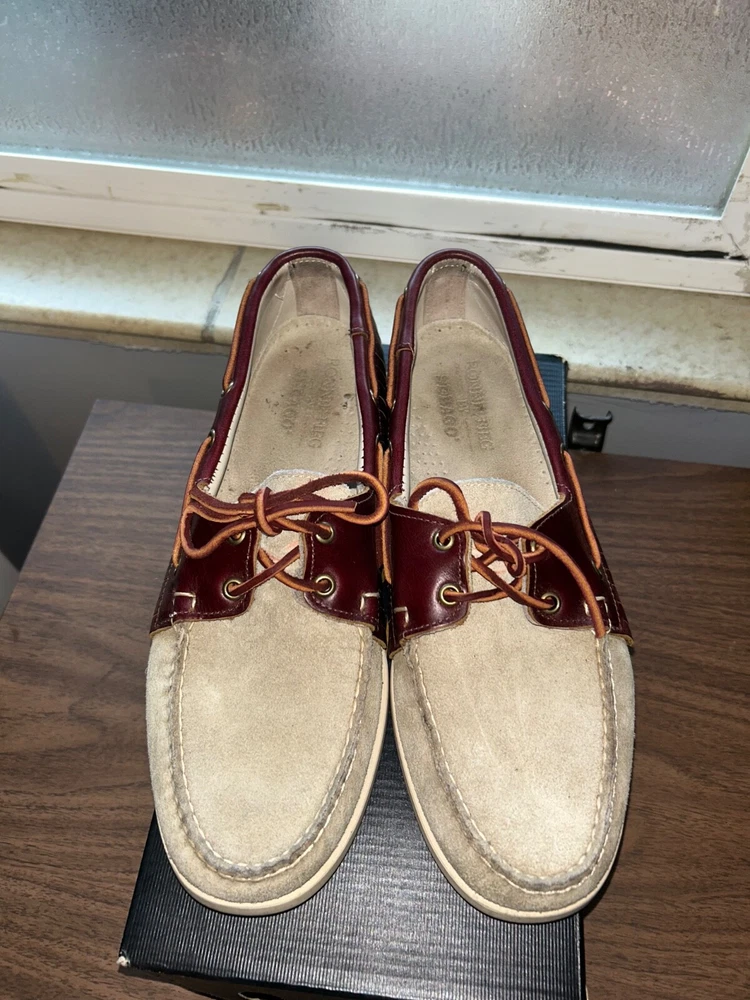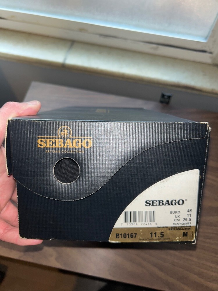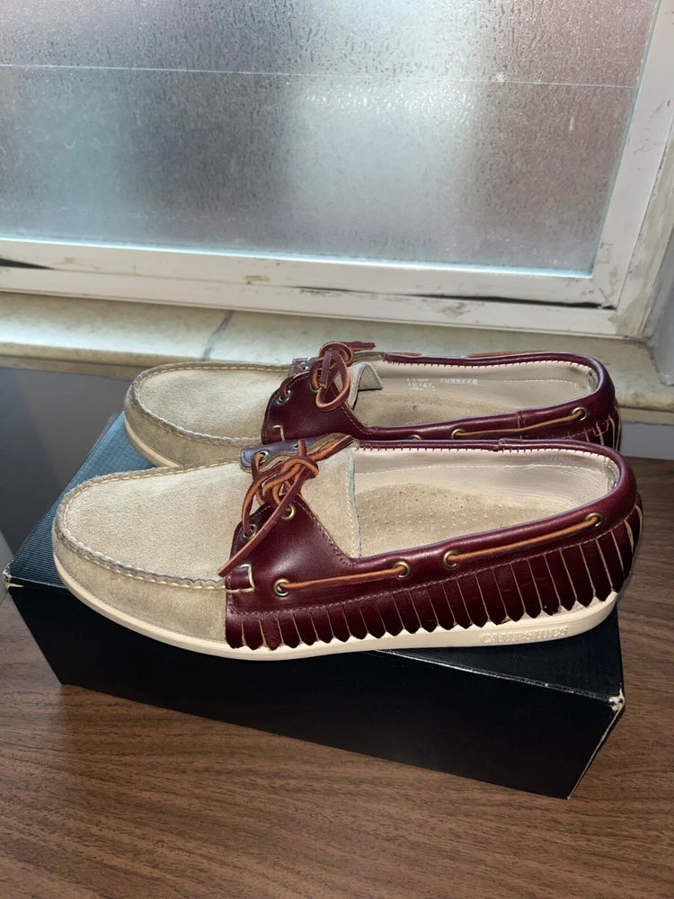 The Sebago Campsides - Artisan Collection - Ronnie Fieg - KITH in size 11.5 are a stylish pair of men's casual loafers designed by Ronnie Fieg. These brown suede loafers feature a classic penny loafer style with a medium width, making them a versatile and comfortable option for everyday wear. Part of the collaboration between Sebago and Ronnie Fieg's KITH brand, these shoes are a blend of classic design and modern flair, perfect for adding a touch of sophistication to any casual outfit.