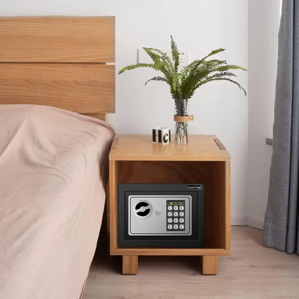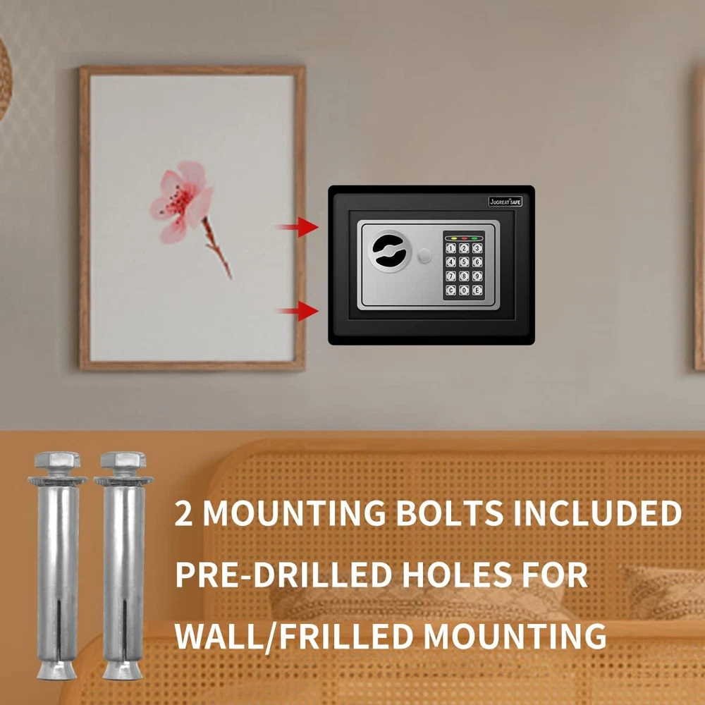 √The Latest Unique Intelligent Lighting Design: This safe box is equipped with the latest humanized lighting design. As soon as you open the box with the numeric keypad, the light will light up, even in the dark, you can see the internal items, hidden and safe.When the door is opened, its brightness reaches the brightest for 30 seconds, then slowly dims and goes out automatically. √Exquisite Capicity:0.23-cubic-feet, Exterior :9" x 6.7"x 6.7", Interior size: :8.6" x 6.4" x 6.4" (Please pay full attention to the dimension for this smart safe box before you buy it ).In order to better serve customers, we have used better mechanical devices on the door, but when this device is used for the first time, it is sometimes not easy to open easily, and it takes patience to try a few more times. √2 Ways to Open It:This lockable storage box can be opened in two ways, making it more flexible and convenient to use, one way is override keys+turning knob, When inserting the key into the keyhole, make sure it is in place, then turn it counterclockwise to open.The other is personal code/master code +turning knob-it accepts two different access codes for multiple access. √Safe and hidden: Made using solid Thickened steel that will last for years and years,this security safe features two live-door bolts, a pry-resistant steel door and concealed pry-resistant hinges to offer you complete peace of mind.Our smart security safes have a smart, concealed design that fits easily into your home or office environment. With two bolts, you can hide it in a shelf ,on a wall or in a cabinet. √Personalized Keypad Access - You can program two own personal access code used the digital access pad. The safe with automatic lock and automatic warning function, when 3 continuously wrong entries will activate the warming beep for 20 seconds and 3 continuously wrong entries again will activate the warming beep for 300 seconds. Product Description The video showcases the product in use. The video guides you through product setup. The video compares multiple products. The video shows the product being unpacked. Methods to Unlock 1:override keys+turning knob 2: personal code/master code +turning knob Note! 1:When opening the safe for the first time, it is opened intelligently with a key. 2: Never put the key in the safe . If you forget the password or the battery is dead, you will not be able to open it JUGREAT Induction Light Safe Box Unique Intelligent Lighting Design Internal capacity:0.23-cubic-feet Exterior :9" x 6.7"x 6.7" Interior size: :8.6" x 6.4" x 6.4" JUGREAT Safe Box Safe Box with Induction Light, Just Great For You Lighting Design Open the safe box , the light will light up, even in the dark, you can see the internal items, hidden and safe. Fixed anti-theft Open the safe box Remove Override Key Cover Open Safe With Override Key Installing the batteries Open the battery compartment and insert four AA alkaline batteries (included). Make sure that the batteries match the + and - in the compartment Reset button With the door open, press the Reset button. You will hear two beeps. Set new code Input the new code (3-8 digits) on the keypad, press "E" button to confirm. confirm light turns on, complete setup. MULTI SIZE VERSATILE HOME SAFE FOR PEACE OF MIND 1 2 3 4