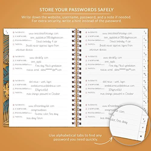 30 Days Return Policy Fast Delivery Trusted seller Password Book – Internet Address Organizer with Alphabetical Tabs – Alphabetized Website & Computer Password Keeper – 5.7x7.5″, Softcover (Golden Jungle) Product Description ✓ KEEP YOUR LOGIN DETAILS EXTRA SAFE – Hacker attacks are becoming incregly frequent, making it difficult to securely store any information on digital devices. T is also an unfortunate risk of losing your login details due to device breakage. To help, we created the Internet Password Book with alphabetical tabs – an easy-to-use password organizer to keep your login details safe and organized, far out of hackers’ reach. ✓ FIND PASSWORDS EASILY WITH CONVENIENT LETTER TABS – You can store up to 396 passwords in this password keeper and easily locate any password you need using convenient alphabetical tabs. T is also a separate section at the back for 12 of your most visited websites, so you can access these quickly whenever needed. ✓ STORE ALL COMPUTER INFO IN ONE PLACE – We’ve added separate pages to store your wireless and email settings, software license information, and additional empty pages for notes. This way, you will never waste time looking for any computer-related info again because it’s all in your password log book. ✓ THICK NO-BLEED PAPER, SIZE & OTHER FEATURES – This log in password book is made using only high-quality materials to ensure it withstands everyday use. The internet password logbook has a durable softcover with rose gold detailing, thick 120gsm bleed-resistant paper, sturdy double wire binding, and 2 pockets for loose notes. This password notebook with tabs comes in a medium format and measures 5.7 by 7.5 inches, which is slightly smaller than A5. ✓ GUARANTEE & RETURNS – We hope our password notebook with tabs will help you keep your passwords organized; otherwise, you can get a full refund of this computer password book organizer with no questions asked. We will exchange or refund your password journal if you have any quality issues or are not completely satisfied with your password book with a-z tabs for any other reason. Reach out to us via an message for an easy refund of this website password book. Shipping Returns Payment Shipping Shipping is FREE to all addresses other than APO/PO boxes in the lower 48 states. All our stock ships from US-based warehouses. Shipped via USPS or UPS (depending on location and package weight) Unless stated otherwise, all orders will ship within 24-72 hours of your payment being processed. Check our feedback to see the great reviews of FAST shipping we offer. Returns As our valued customer, we will do our best to make sure the product you receive arrives to you on time and as expected. If you are not satisfied with your purchase, please contact us within 30 days of receiving your order to process a return. Payment We currently accept payment via eBay managed payments only. Once payment is cleared, we will dispatch your shipment within 1-3 business days. Please refer to the "Shipping" tab for more information regarding shipping speed to your destination.