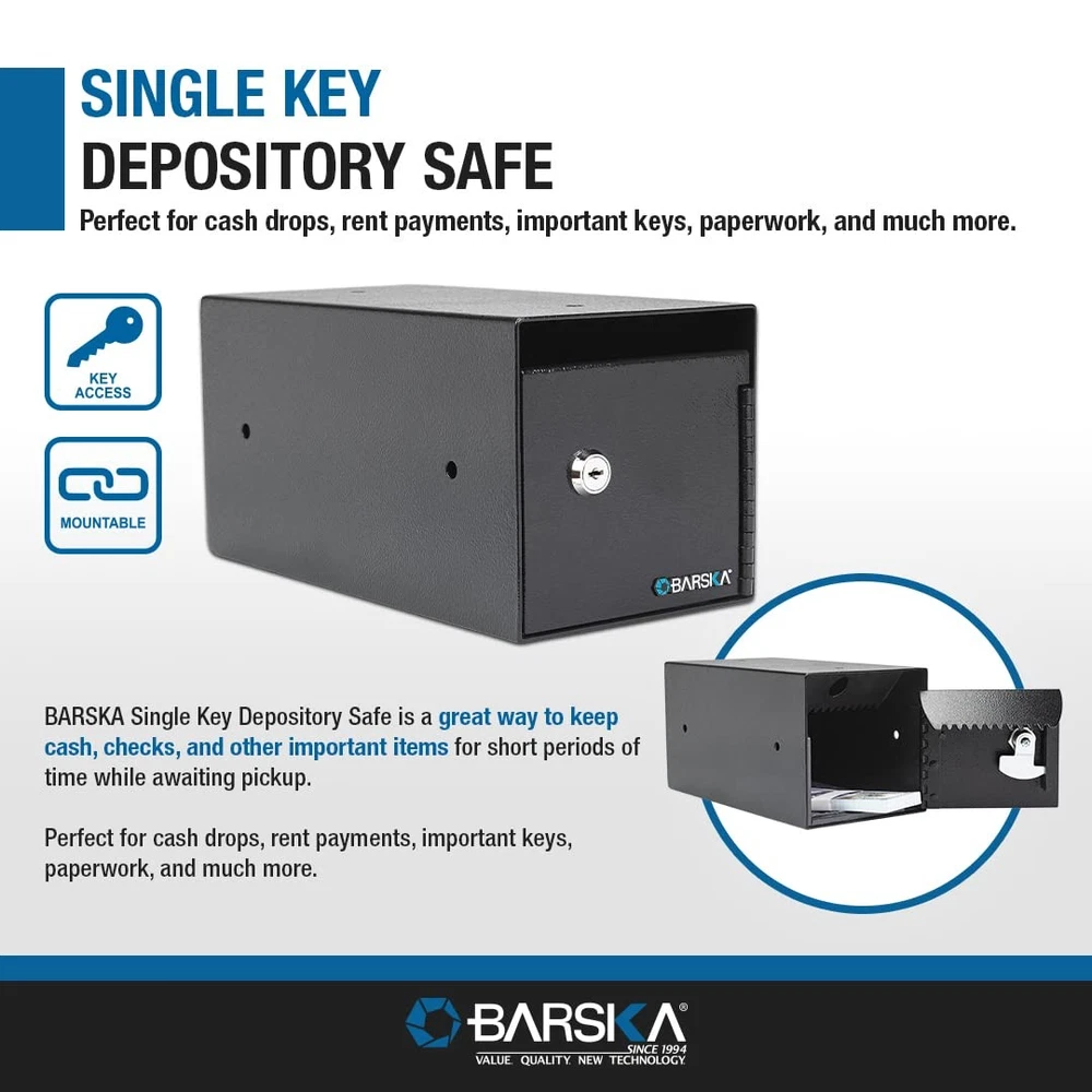 Key Lock Depository Drop Safe Lock Box for Cash, Receipts and Keys Key Lock: The All steel depository safe features a key operated lock. Secure Design: Anti-fishing baffle prevents theft through the front loading deposit slot. Solid Protection: The lock box comes with solid steel body construction. Mounting: The safe comes with anchor holes and mounting hardware, provided to secure your safe to the floor or counter. Shipping We offer FREE shipping on all orders! We ship within Three business days of payment, usually sooner. We use a selection of shipping services such as UPS, FedEx, USPS etc. We only ship to the lower 48 states, no APO/FPO addresses or PO Boxes allowed. Local pickups and combined shipping options are not provided at this time. Return You can return a product for up to 30 days from the date you purchased it. Any product you return must be in the same condition you received it and in the original packaging. Please keep the receipt. Payment We accept payment by any of the following methods: PayPal Please pay as soon as possible after winning an auction, as that will allow us to post your item to you sooner! Feedback Customer satisfaction is very important to us. If you have any problem with your order, please contact us and we will do our best to make you satisfied. Contact Us If you have any queries, please contact us via ebay. We usually respond within 24 hours on weekdays. Please visit our eBay store to check out other items for sale! Thank you for shopping at our store.