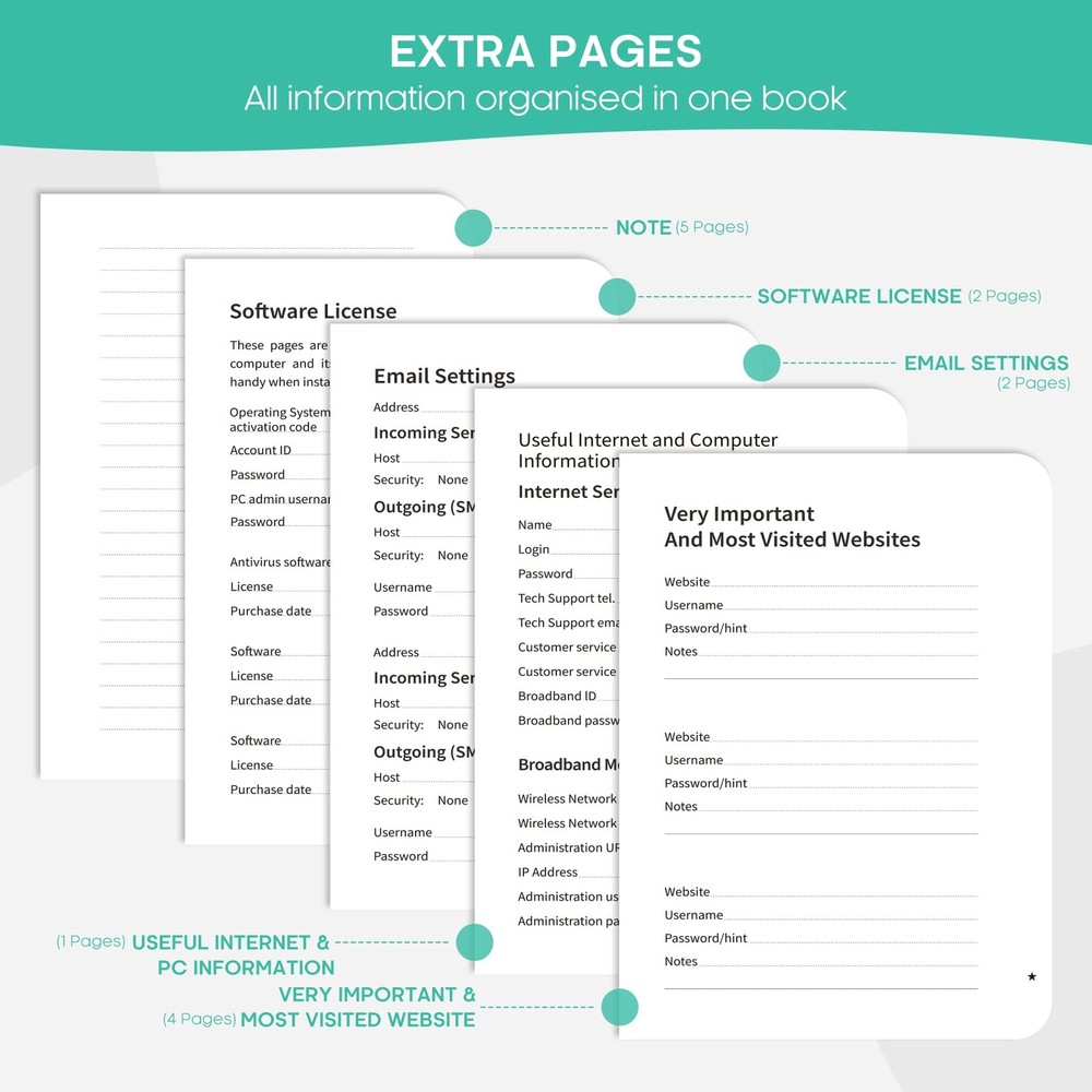 Password Book with Alphabetical Tabs for Internet Website Address Login Features: Never Forget a Password Again - Always forget your password? Taja password keeper book provides an opportunity to create secure passwords and store them safely in one place, where no hacker can reach. Now, you won't have to fry your brain in search of that password. Easy-to-Find Passwords - Our password book with alphabetical tabs helps you quickly and easily find the password you need. With the alphabetically organized tabs, you can easily flip to the right section, saving you time and hassle searching for passwords. Plenty of Room To Write - This 136-page password logbook provides ample space to record your passwords and other important information. It can store up to 480 passwords, as well as details for one wireless router and your internet service provider. In addition, you can record up to four email accounts, eight software licenses, and eleven crucial websites. Finally, the logbook includes four pages for additional notes. Premium Design - This password keeper has been designed to be anonymous without an obvious title on the cover with an elastic band, 1 pen holder, 2 bookmark, 1 inner pocket at the end of the logbook and thick no-bleed 100gsm paper. Great Present for Everyone - Need a practical present for seniors? Our password notebook for seniors is designed for them with a 5.5" x 6.7" size and durability. Keep all passwords organized and easily accessible without digital storage. It's a thoughtful present for any occasion that shows you care about their security and convenience. SHIPPING We are always working hard to ensure your package arrives as soon as possible. Please understand that some factors like weather, high postal traffic, and the performance of shipping companies are outside of our control. We offer free shipping to the lower 48 states and ship within 3 business days of payment, usually sooner. We do not accept P.O. Boxes. Please provide a physical address.