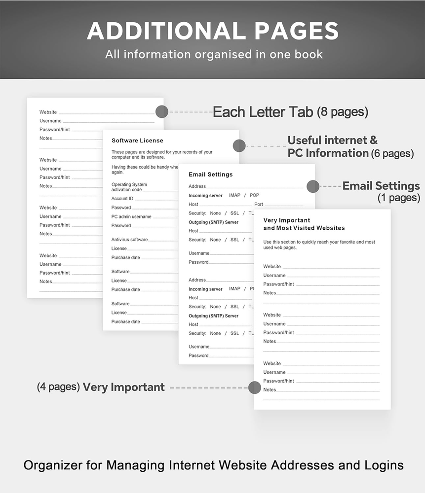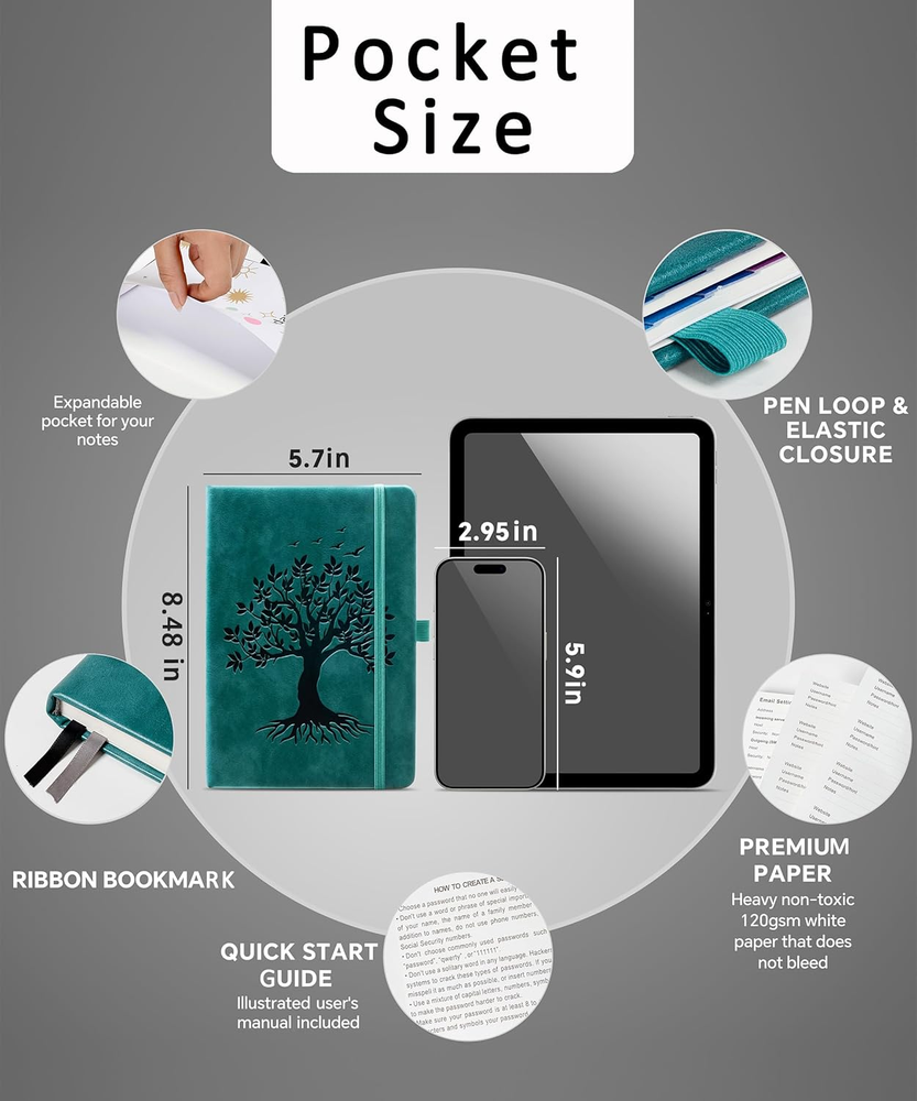 Store New Arrivals Add to Favorite View Feedback Contact Password Book with Colorful Alphabetical Tabs, 8.4" X 5.8" Hardcover Password Keeper Book for Organized Internet Website Address Logins, Ideal for Home Office - Sea Green Description Item model number ZXUSPasswordBook01 Sheet Size A5 Calendar Type Non Dated" or "NA Number of Items 1 Format Organizer Color SeaGreen Binding Hardcover Cover Material Faux Leather Material Faux Leather Material Type Faux Leather Manufacturer Part Number ZXUSPasswordBook01 Pages 240 Pages Item Weight 15.8 ounces Product Dimensions 8.4 x 5.7 x 0.7 inches Target Audience Adult Size A5 Never Forget a Password Again: Tired of forgetting your passwords? Say goodbye to the frustration of constantly juggling and resetting passwords. Our Password Book with Colorful Alphabetical Tabs helps you easily store and keep all your passwords in one secure place, saving you from the hassle of managing multiple passwords, with no visible labels or titles, protecting your sensitive information. Find Your Passwords Quickly & Easily: Need to find a password in seconds? This password keeper with alphabetical tabs makes it simple. With vibrant colors and clear A-Z prints, you can quickly locate what you need, making it a breeze to access your accounts. Easily Store Up to 900 Passwords: This password notebook features 240 pages of 120gsm thick paper, offering the capacity to store up to 900 passwords. Additionally, it provides ample space for internet service providers, wireless router settings, software licenses, email settings, frequently visited websites, and extra notes. Intimate Add-Ons for Enhanced Functionality: Measuring 8.4" x 5.8", this password keeper includes 2 ribbon bookmarks for easy navigation, a fine inner pocket at the back for additional storage, an elastic pen holder for convenience, and 120gsm paper to prevent ink bleeding. It's perfect for managing your passwords and more. A Thoughtful Gift for Any Occasion: Looking for a practical gift for your loved ones or colleagues? This Password Book is an ideal choice to alleviate the stress of password memorization. Suitable for both men and women, it's a considerate gift for family, friends, and colleagues on birthdays, holidays, or any special occasion. Product Description Never Forget a Password Again Password Book with Colorful Alphabetical Tabs, 8.4" x 5.8", 240 Pages Find Your Passwords Quickly & Easily Never Forget a Password Again Password Book with Colorful Alphabetical Tabs, 8.4" x 5.8", 240 Pages Find Your Passwords Quickly & Easily Never Forget a Password Again Password Book with Colorful Alphabetical Tabs, 8.4" x 5.8", 240 Pages Find Your Passwords Quickly & Easily Never Forget a Password Again Password Book with Colorful Alphabetical Tabs, 8.4" x 5.8", 240 Pages Find Your Passwords Quickly & Easily Never Forget a Password Again Password Book with Colorful Alphabetical Tabs, 8.4" x 5.8", 240 Pages Find Your Passwords Quickly & Easily Never Forget a Password Again Never Forget a Password Again Password Book with Colorful Alphabetical Tabs, 8.4" x 5.8", 240 Pages Find Your Passwords Quickly & Easily What is the size and capacity of the Password Book? The Password Book measures 8.4" x 5.8" and includes 240 pages of 120gsm thick paper, allowing you to store up to 900 passwords along with additional information like internet service providers, wireless router settings, software licenses, and more. How does the Password Book help in organizing and finding passwords? The Password Book features colorful alphabetical tabs and clear A-Z prints, making it easy to quickly locate any password. This design helps you find your passwords in seconds without any hassle. What additional features does the Password Book include? The Password Book comes with 2 ribbon bookmarks for easy navigation, an inner pocket at the back for additional storage, an elastic pen holder, and 120gsm paper to prevent ink bleeding, enhancing its functionality and convenience. Is the Password Book a good gift option? Yes, the Password Book is a practical and thoughtful gift suitable for both men and women. It's perfect for family, friends, and colleagues on birthdays, holidays, or any special occasion, helping them manage and secure their passwords efficiently. How does the Password Book protect my sensitive information? The Password Book is designed without any visible labels or titles on the outside, ensuring that your sensitive information remains secure and protected from prying eyes. ABOUT US We offer the best prices around on high quality products. Our E-store includes media such as books, movies, music and games while offering electronics, toys, sporting apparel, clothing, tools, general home, garden items and more. SHIPPING We are always working hard to ensure your package arrives as soon as possible. Please understand that some factors like weather, high postal traffic, and the performance of shipping companies are outside of our control. We offer free shipping to the lower 48 states and ship within 2 business days of payment, usually sooner. We do not accept P.O. Boxes. Please provide a physical address. For shipping outside of the continental USA, we only use eBay's Global Shipping Program.The item is shipped to KY and then sent to the rest of the world. International customers are responsible for all duties and taxes. Continue to check out in order to calculate costs for shipping the item to your country. Messages regarding eBay's Global Shipping Program MUST be directed at eBay EXCLUSIVELY. RETURNS We offer a 30-Day Return Policy on items which you are not completely satisfied with. You have the option for a full-refund or an exchange of the item. No returns are available on items shipped outside of the USA. PAYMENT We accept PayPal. CONTACT US This page content is yet to come Please ad us to your favorite seller and visit again later Thank You CUSTOMER SATISFACTION We try our very best to make sure every customer is completely sati