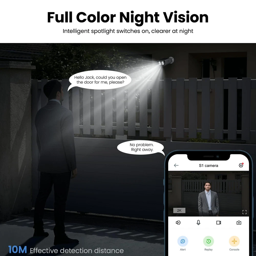 Wireless Solar Charging & Easy installation: Built-in solar panel, security cameras wireless outdoor allow you to truly get rid of tangled wires, just place the outdoor camera under the solar energy to charge, realizing 365 days of solar energy use continuously. Simply press the power button and follow the in-app instructions to connect the security camera to your 2.4GHz Wi-Fi easily. Not support 5GHz WiFi Crystal 2K Image & Color Night Vision: Compared with 1080P image, the wireless camera outdoor provides you with a sharper image at 2K Resolution, which reproduces the lifelike images, allowing you to view every detail of your outdoor area and prevent threats or intruders. During the nighttime, the security camera outdoor spotlight turns on automatically, offering you clear images even in pitch black. Only work with 2.4Ghz WiFi AI Human Detection Siren & Intelligent Spotlight: The wireless security camera outdoor with PIR motion sensor and automatic spotlight provide you and your family a full-protection on your safety and property. When the wireless camera outdoor detects unexpected visitors approaching your house, it will trigger an audible alarm and automatically turn on the night spotlight to scare the intruders and send you instant notifications, so you can maintain a peace of mind even when you're not at home SD Card & Cloud Storage (optional): The outdoor security camera supports 24/7 motion recording to a micro SD card (up to 128GB, not included) and Cloud Storage service (optional). Additionally, it is compatible with Alexa or Google Home, so you can ask their assistants to show you any location where the Wi-Fi camera outdoor wireless is recording. Not support 24/7 continuous recording Two-Way Audio & Muti-User Sharing & All weather protected: The outdoor cameras for home security with microphone and speaker to ensure clear and real-time remote calls to your family or friends, and even warn off intruders at the door. You can share your camera remotely with your family from anywhere, and they can also access to the solar security cameras with you simultaneously. It is waterproof to withstand any bad weather