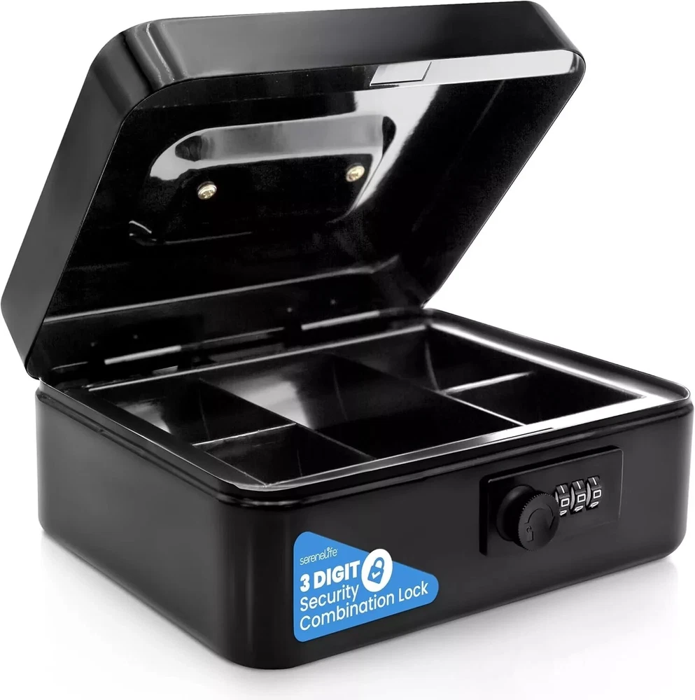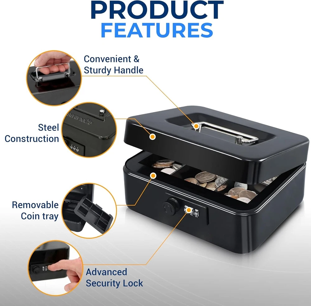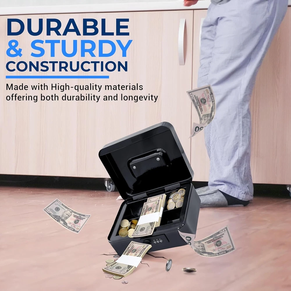 ROBUST SECURITY AND DURABILITY - Rely on the lasting protection of this 8" cash box, meticulously crafted from strong steel. Our advanced lock, featured in this lock box for money, stands guard over your valuable items. EFFICIENT ORGANIZATION FOR YOUR VALUABLES - Experience hassle-free organization with the removable inner money drawer and a cash tray thoughtfully designed with five compartments. Accessing your cash and belongings from this cash box with a money tray. AMPLE STORAGE CAPACITY WITH PORTABILITY - Embrace the convenience of abundant storage space that this mini safe box for money provides. The spacious interior, designed for a cash box with money tray, accommodates your valuable items securely. PREMIUM SECURITY FOR PEACE OF MIND - Entrust your valuable possessions to the high-level security features of this cash holder. The advanced combination lock ensures that your items remain safeguarded in this money box. COMPLETE PACKAGE OF SECURITY AND CONVENIENCE - Unveil the perfect combination of security and convenience with this steel cash box. Measuring 7.8” x 6.2” x 3.5”, it's compact yet capacious, making it an exceptional money safe for cash-saving.