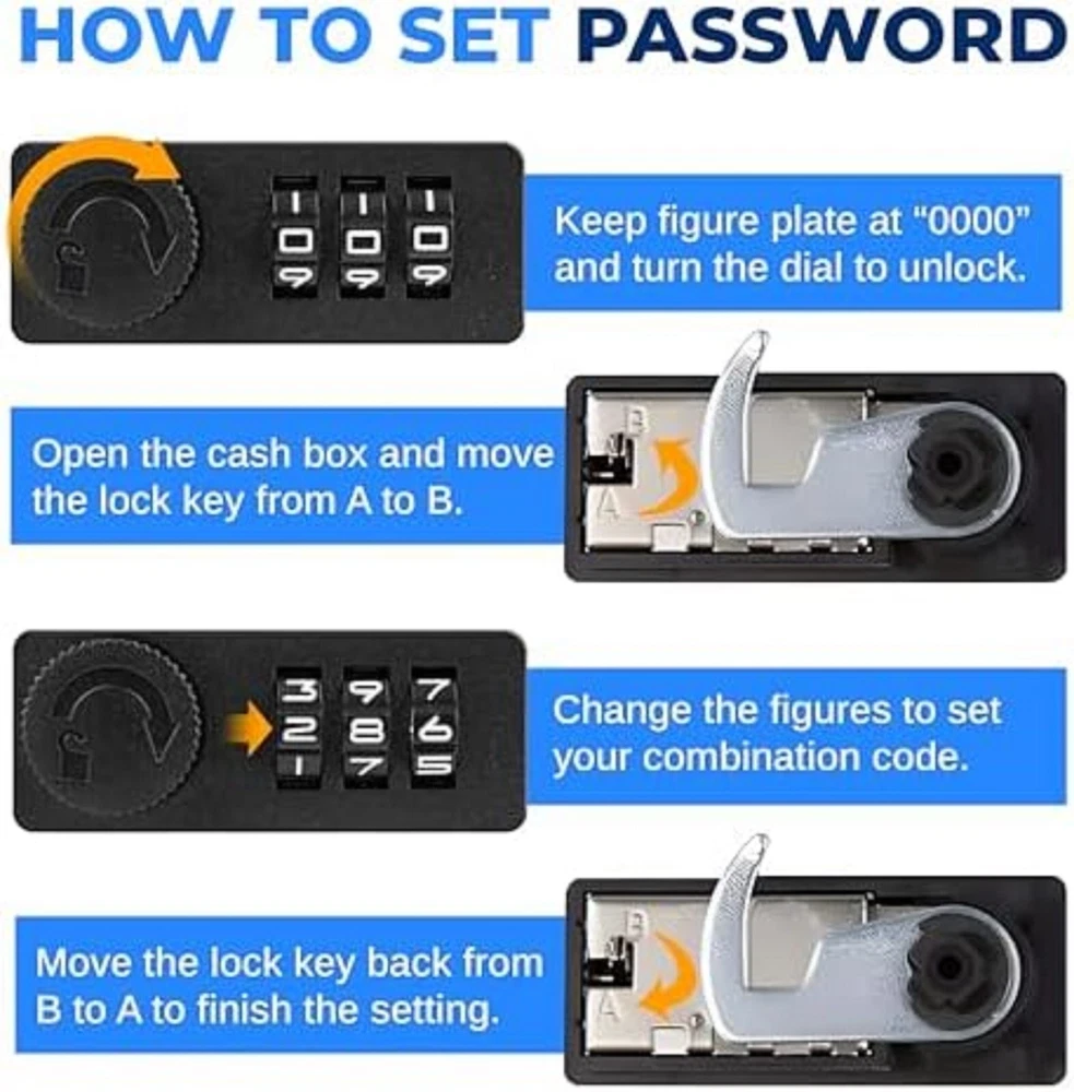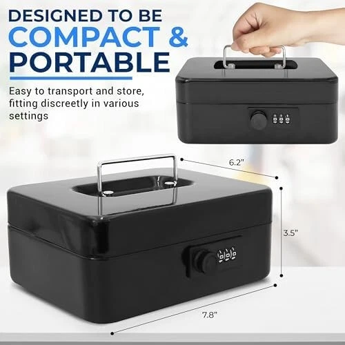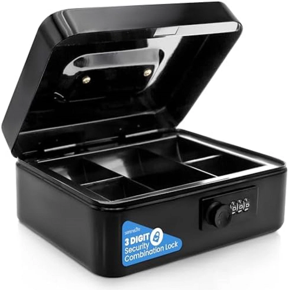 Serenelife 8" Metal Cash Box with Lock | Cash Safe Lock Box with Money Tray | 5 Lockable Drawers | Five Compartment Cash Tray | Storage for Valuables | 8” x 6.2” x 3.5” IN | Black DESCRIPTION ROBUST SECURITY AND DURABILITY - Rely on the lasting protection of this 8" cash box, meticulously crafted from strong steel. Our advanced lock, featured in this lock box for money, stands guard over your valuable items. EFFICIENT ORGANIZATION FOR YOUR VALUABLES - Experience hassle-free organization with the removable inner money drawer and a cash tray thoughtfully designed with five compartments. Accessing your cash and belongings from this cash box with a money tray. AMPLE STORAGE CAPACITY WITH PORTABILITY - Embrace the convenience of abundant storage space that this mini safe box for money provides. The spacious interior, designed for a cash box with money tray, accommodates your valuable items securely. PREMIUM SECURITY FOR PEACE OF MIND - Entrust your valuable possessions to the high-level security features of this cash holder. The advanced combination lock ensures that your items remain safeguarded in this money box. COMPLETE PACKAGE OF SECURITY AND CONVENIENCE - Unveil the perfect combination of security and convenience with this steel cash box. Measuring 7.8” x 6.2” x 3.5”, it's compact yet capacious, making it an exceptional money safe for cash-saving.
