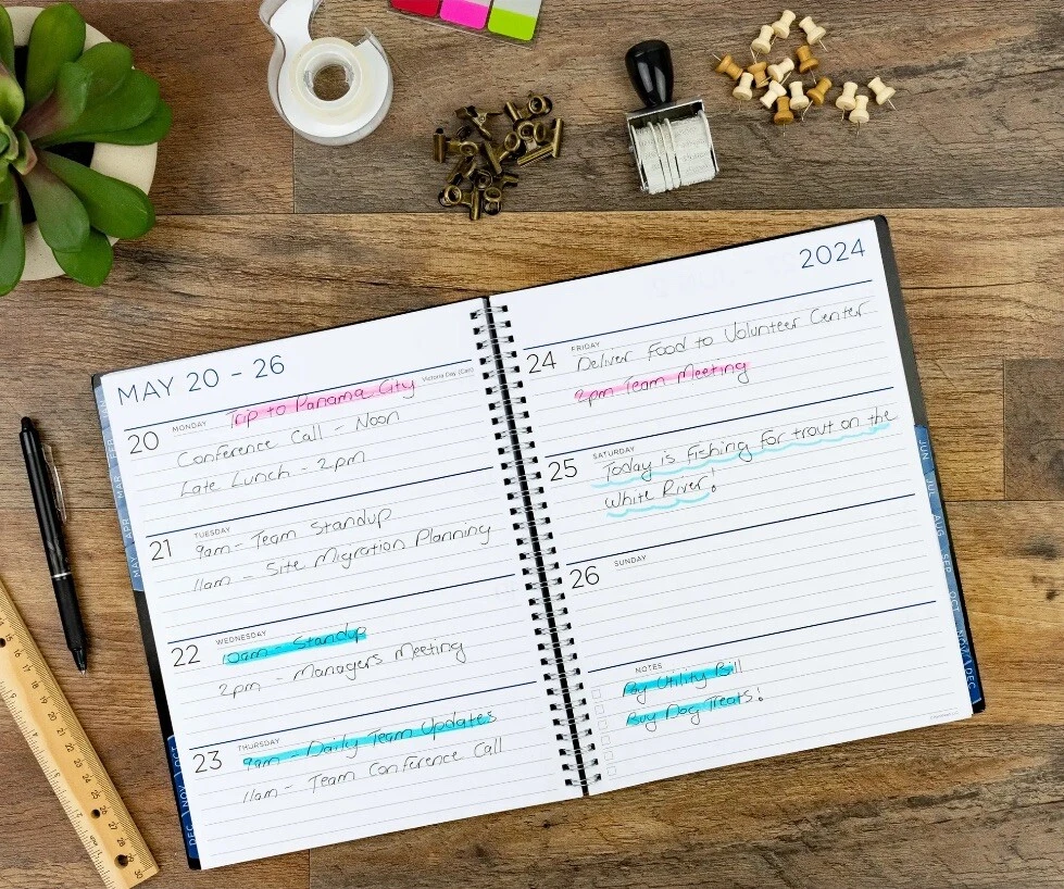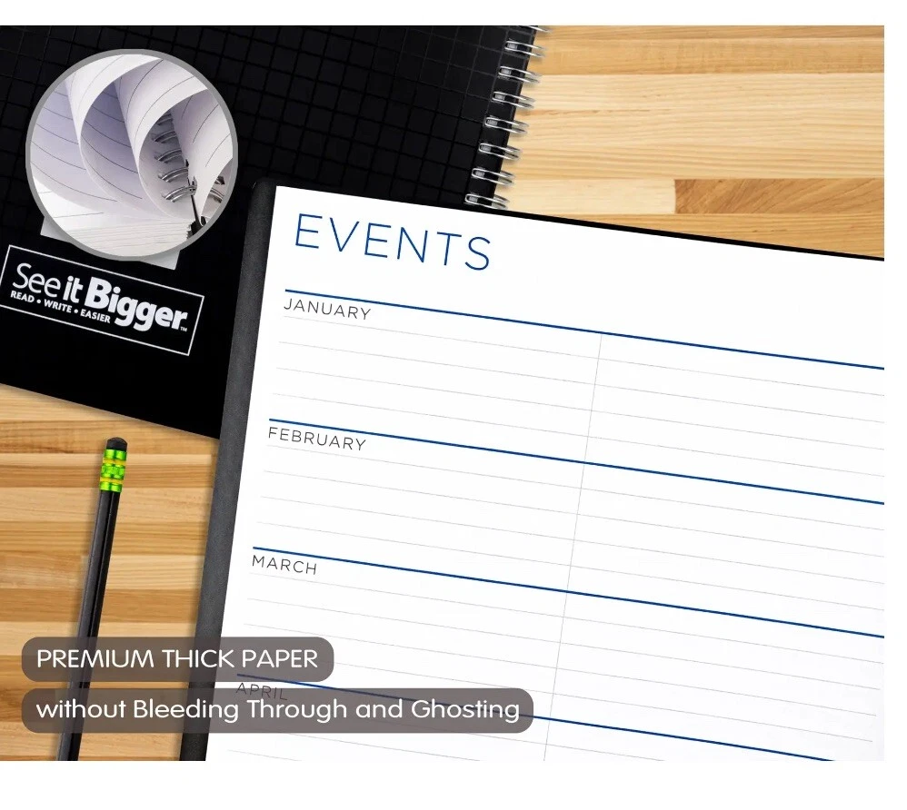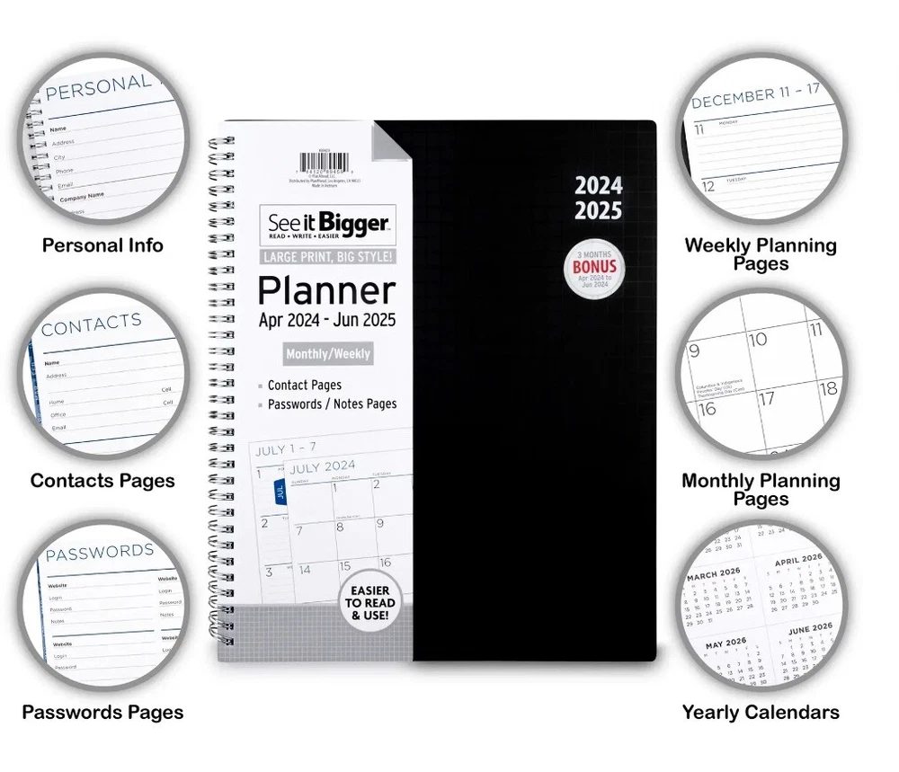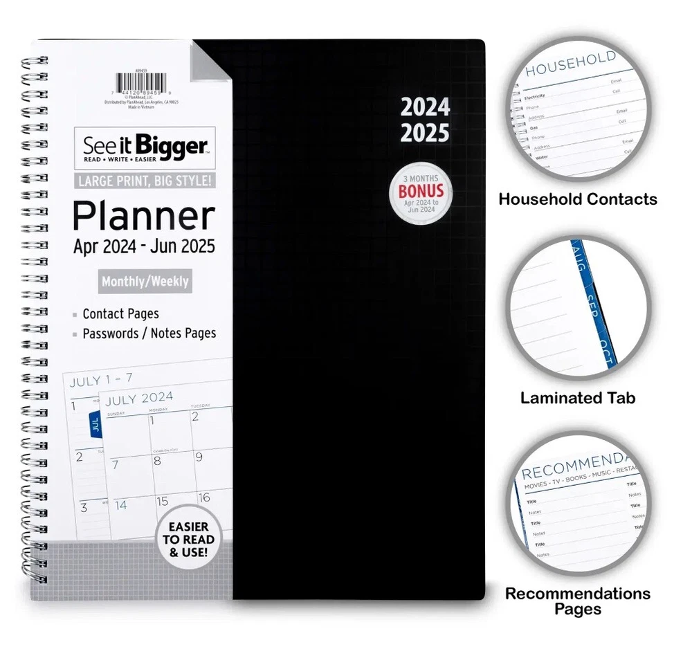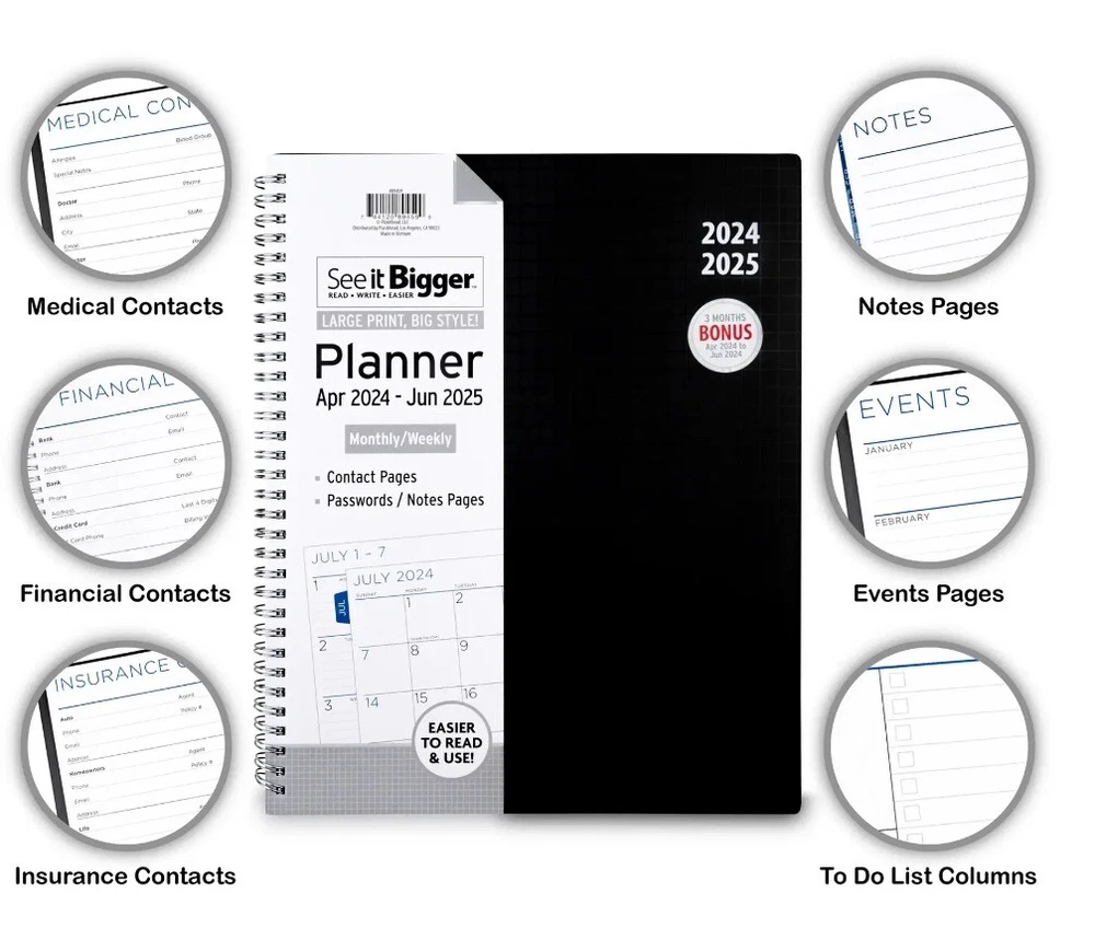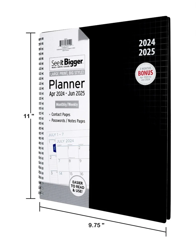 The See It Bigger planner covers 15 months, featuring monthly and weekly dated pages for easy planning. Individual monthly tabs allow for quick access to separate monthly calendars that open flat in side-by-side pages. A defined space along the right margin provides room for notes and tasks. Dated weekly view pages so each week may be viewed in its entirety with ample space to jot down information for each day. Monthly view pages show Yearly Reference Calendars and Holiday Listings making future planning simple. A dedicated Note, Contact, and Password Record Pages put all information at your fingertips. New. • See it Bigger dated planner covers 15 months from April 2024 to June 2025 • Printed on premium quality thick paper without bleeding through or ghosting • Monthly and weekly format with individual laminated monthly tabs allow for quick access • Durable, flexible cover with double wire binding • Includes a list of holidays, reference calendars, to-do list columns, passwords, events, contacts and extra notes pages to accommodate your scheduling requirements • Contacts section includes the following categories: household, insurance, medical, and financial