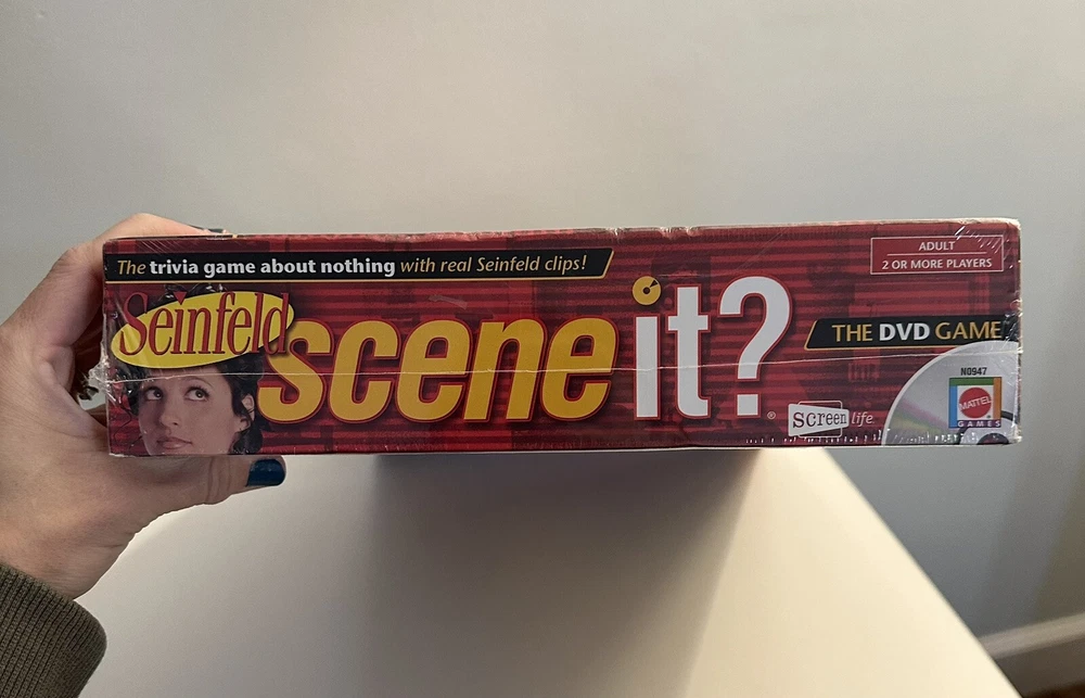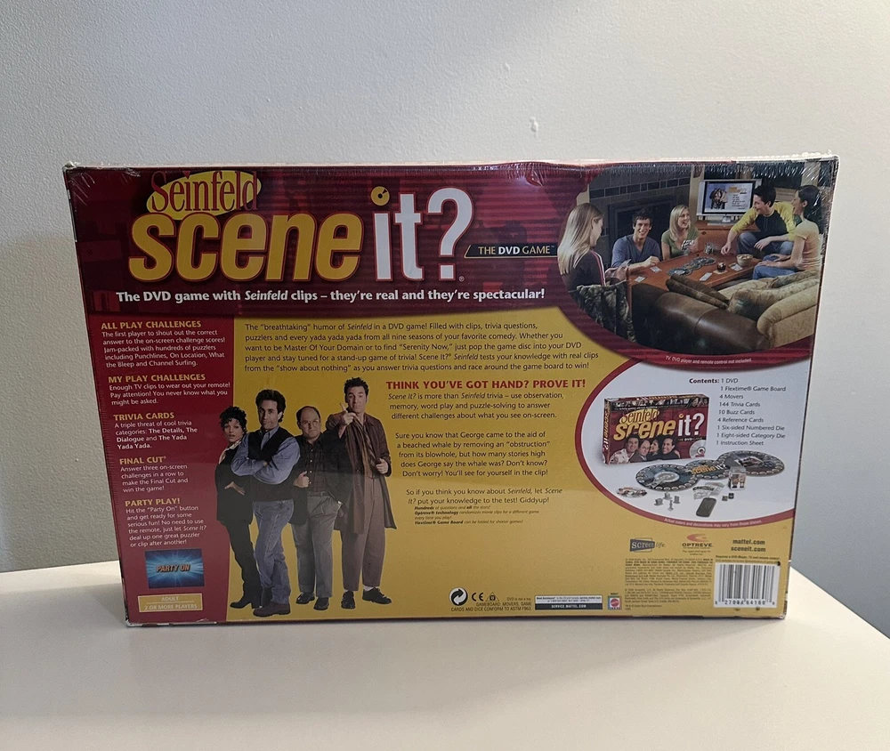 Game Type:Board GameGame Title:Scene ItAge Level:12-16 Years, 17 Years & UpCharacter Family:SeinfeldCustom Bundle:NoBrand:MattelAward:Games 100Min. Number of Players:2 playersgtin13:027084641608Year:2008Type:Game BoardTitle:Scene ItUPC:027084641608Theme:Movie & TV