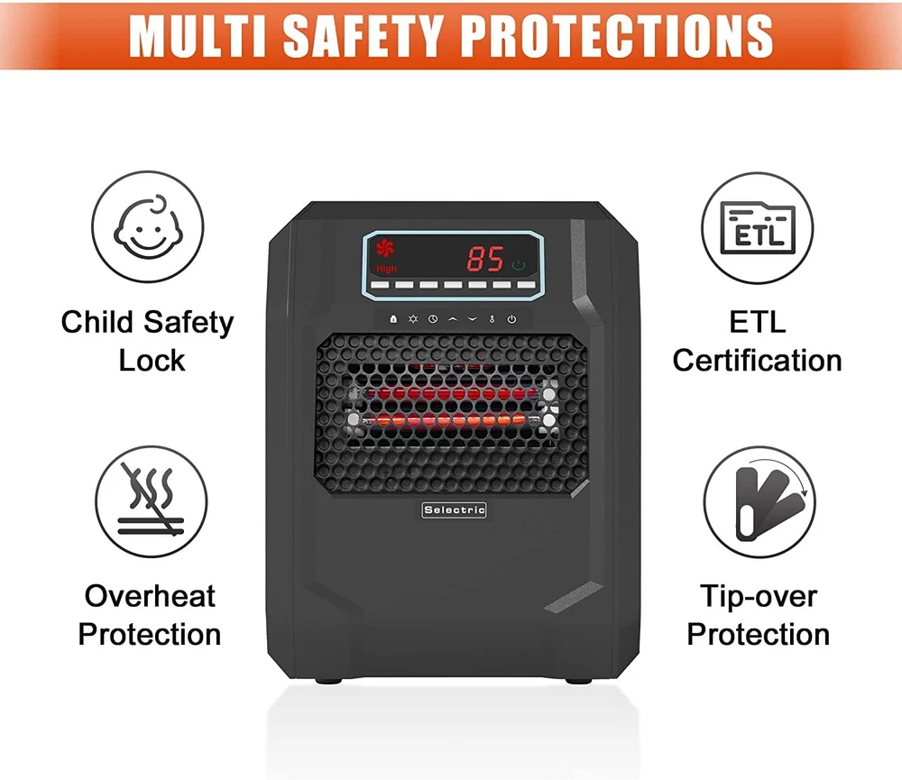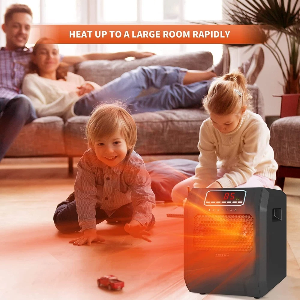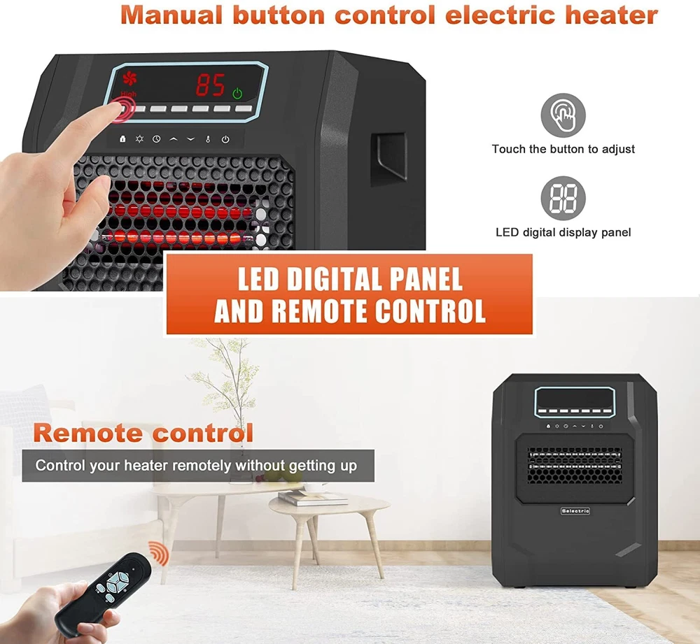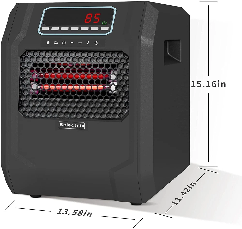 This freestanding electric fireplace stove could warm up your home within the shortest time with 3 heat settings, 1,000W/1,500W and ECO. Super quiet work around you, feel warmth without disturbing. You can use the remote control to adjust the temperature, no need to walk over. Overheat and tip-over safety shutoff considered for family use safe and harmless. Features Size: 15.24 X 13.27 X 16.34 in (L x W x H) 3 heat settings: 1,000W/1,500W and ECO-maintains a constant 68°F Six infrared quartz heat element Fan only mode Thermostat control system Power indicator light Overheat and tip-over safety protection 12 hours programmer timer Large LED display UV air purification Package Includes: 1 x Infrared Space Heater 1 x Remote control Tips: 1. The working condition is that the set temperature is higher than room temperature 2. Before performing any maintenance task, turn off the power, unplug the unit, and allow it to cool completely 3. To keep the heater clean, clean the outer shell with a soft, damp cloth. Use a mild detergent if necessary. After cleaning, dry the unit with a soft cloth 4. DO NOT let liquid enter the heater 5. DO NOT immerse the heater in water 6. Wait until the unit is completely dry before use 7. Store the heater in a cool, dry location when not in use. To prevent dust and dirt build-up, use the original packaging to repack the unit 8. Do not use the heater without all assembly in place After Service. Please feel free to contact us if you encounter any problems with our products, we promise to provide you with a satisfied solution. Electric Space Heater Indoor Use: Efficient and portable electric heater is a powerful and innovative solution to your heating needs and can warm up your home within the shortest time Energy Efficient Space Heater Settings: Includes 3 heating settings with 6 built-in quartz heating tubes, warming up to large rooms faster with less energy consumption Indoor Space Heater Extra Safety: Features overheat and tip-over safety protection functions, as well as a child safety lock design to ensure the security of your family and pets Large Room Heater Display: Large LED display and thermostat control system make temperature adjustment a breeze, offering user-friendly controls for easy operation Space Heater with Remote Control: Includes a 12-hour programmable timer to set the portable heater according to your schedule and a remote control to adjust settings from a distance