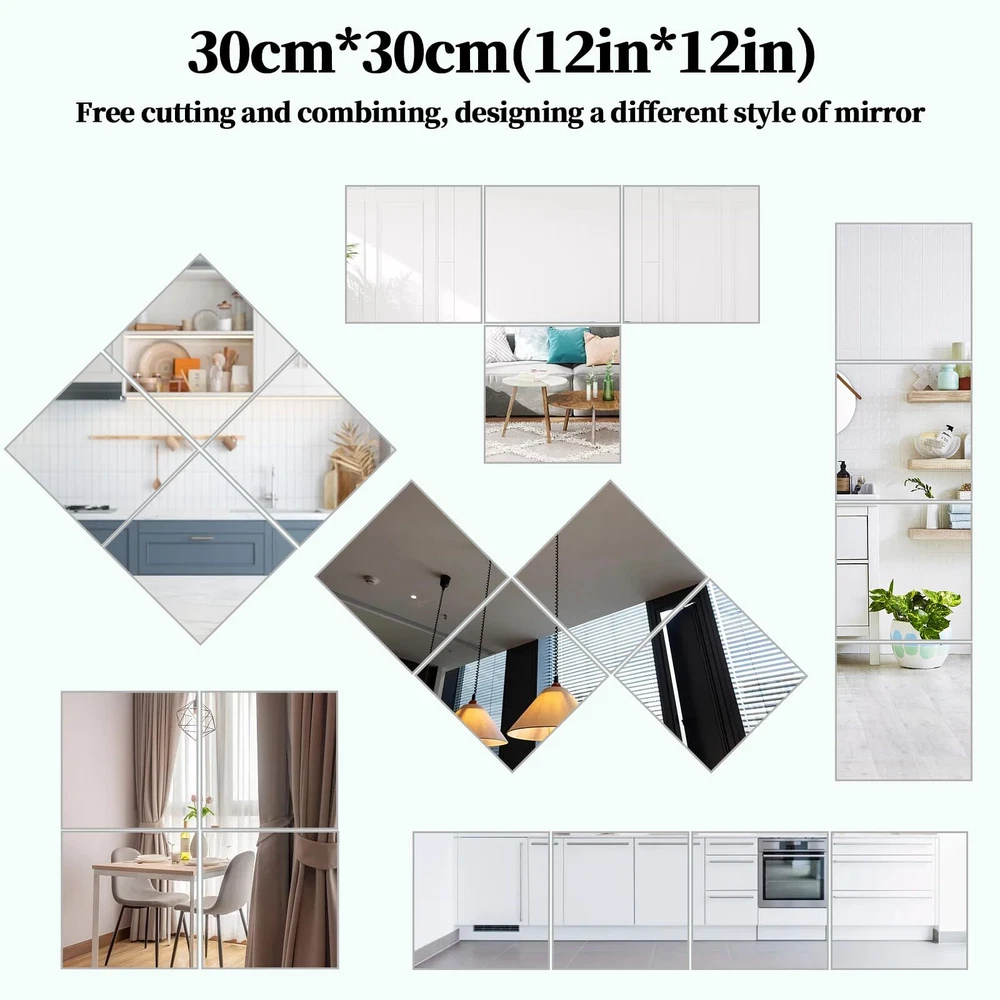 【Acrylic Material】:The mirror is made of acrylic material,with a smooth surface and good texture,which can avoid scratches and is safer than ordinary glass mirrors. 【Reflective Effect】:Our acrylic mirror has a reflective effect, which can be used for exquisite decoration. Reflective surfaces can make the space look larger and brighter.Use mirror stickers on smooth surfaces, the flatter the wall, the better the reflective effect. 【Easy To Install】:Just tear off the white tape on the back and stick it where it needs to be,without tools,no need to punch & no damage walls.It can be easily installed on smooth walls,latex paint walls or wooden doors.but don't use for uneven wall.Each mirror is covered with a protective film to avoid scratches, just peel it off to get a high-definition mirror. 【Safe and Unbreakable Mirror】: The acrylic mirror tiles is not glass,can be bent freely,unbreakable and safe.You can cut the mirror plate into any shape to DIY decorate the wall as you like.Don't worry about hurting the . 【Wide Applications】: Flexible mirror sheets stickers mirrors can be used as full-length mirrors,wall mirrors,fitness mirrors,yoga mirrors.Suitable for bathrooms,bedrooms,living rooms,dressing rooms,doors,offices,hotels and any place where mirrors are needed.