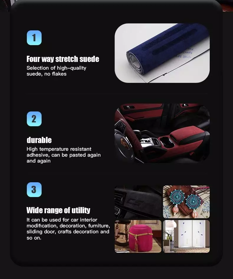 Suitable For: Crafts Features: Self Adhesive Brand: DEALUX-1 Feature: Adhesive Theme: Car/Auto Technics: Woven Unit of Sale: Roll Suede Fabric Type: Suede Style: Plain Knitted Type: Warp Material: Flannel Length/Amount: As shown Origin: Mainland China Pattern: Flocked