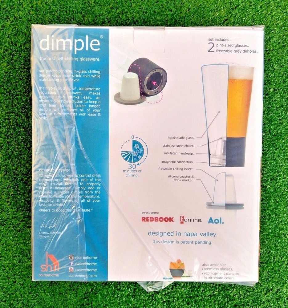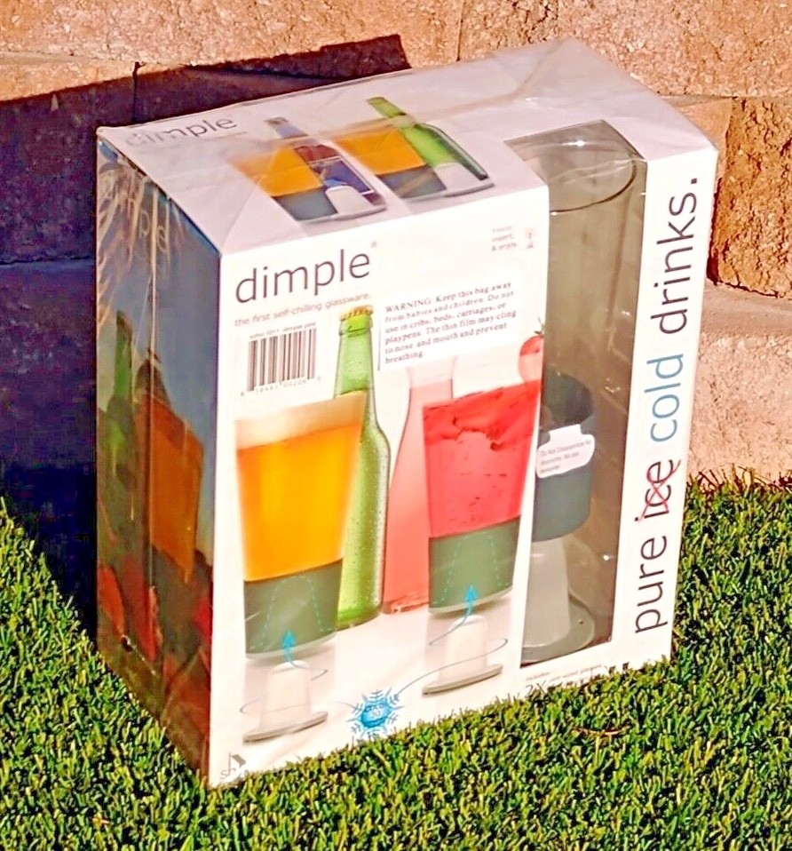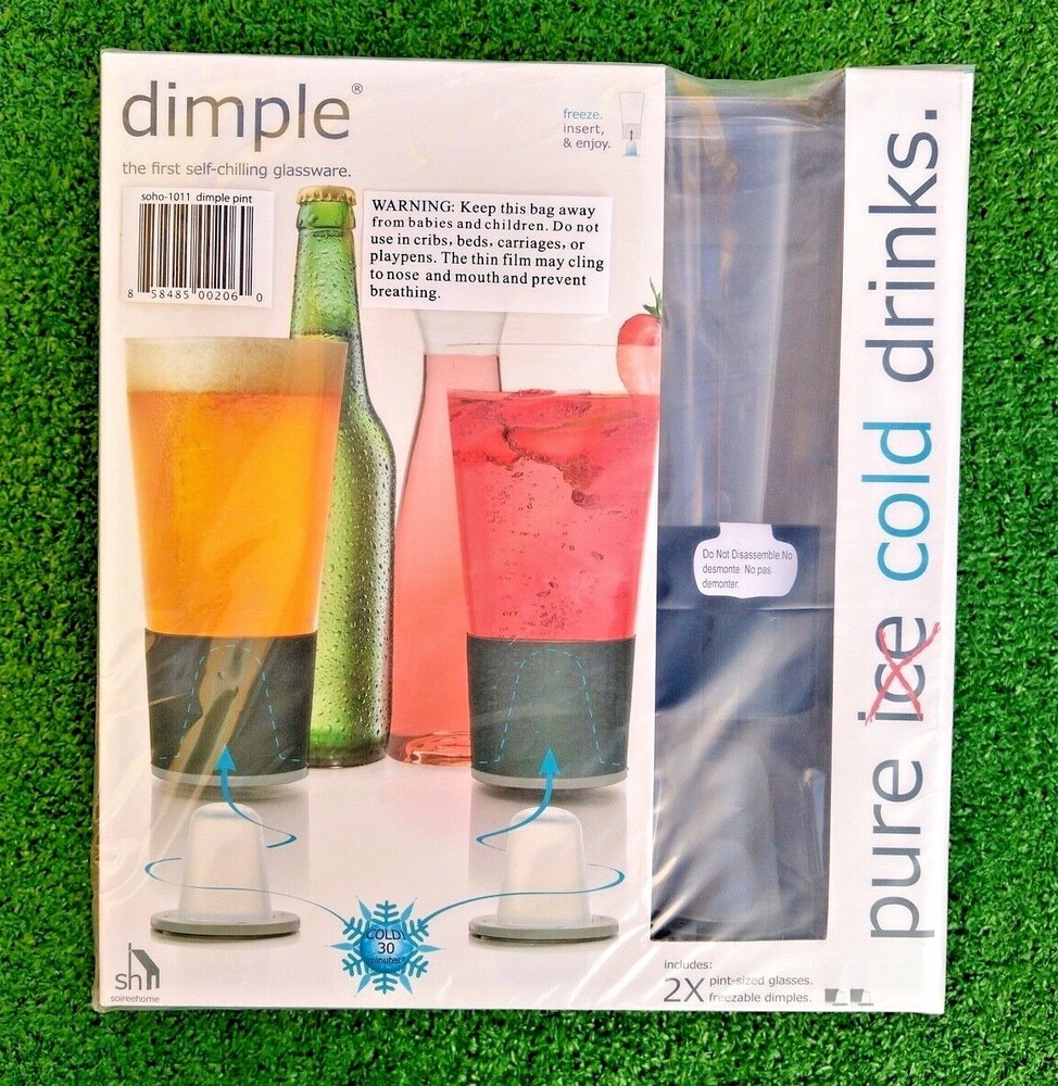 Brand new, mint, unused condition. P air of the first self-chilling glassware. Dimple’s patented integrated chilling technology keeps pint-sized beverages cold to the last drop without ice diluting your drink. simply pre-freeze the gel-filled dimples and they magnetically affix into the base of the custom designed lead-free borosilicate glassware. The set has a classic pint-sized shape and each glass can hold up to 16oz. with grey insulating hand-grip. 2 grey dimple freezing cones included. each glass is 3.5” diameter and 7” tall. package of two.