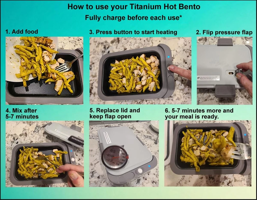 Enjoy the Warmth of a Home-Cooked Meal Anywhere. Take to work, outdoor recreation or travel and enjoy a delicious, heated meal on-the-go. applies recent developments in battery technology to improve the efficiency and speed of meal prep. Our proprietary lithium battery pack is rechargeable, safe and offers unparalleled on-demand convenience. Charge after each use (light on wall charger turns from red to green when fully charged). Do not immerse in water or liquids (not water proof). Wipe nonstick surface with cloth or sponge not steel wool or scrubby. Lid can be washed normally. Comes with a Full Year Limited Waranty. PRESSURE RELIEF VALVE: Equalizes pressure caused by steam and altitude to prevent vacuum and ensure easy opening. ON-DEMAND CONVENIENCE: Simply Double Press the power button to heat your meal to 145-165 °F in 10-15 minutes, depending on its contents CORDLESS, BATTERY POWERED: The ideal meal prep system for your busy lifestyle. offers unparalleled portability. Take it to work, travel, outdoor recreation and more. Upgraded electronics for added protection and water resistance. HEALTHY EATING: Meal prep with healthy ingredients that suit your taste. ENVIRONMENTALLY FRIENDLY: Reusable so that you can reduce the consumption of single use plastic. Hand wash and recharge after each use to reuse over and over again.