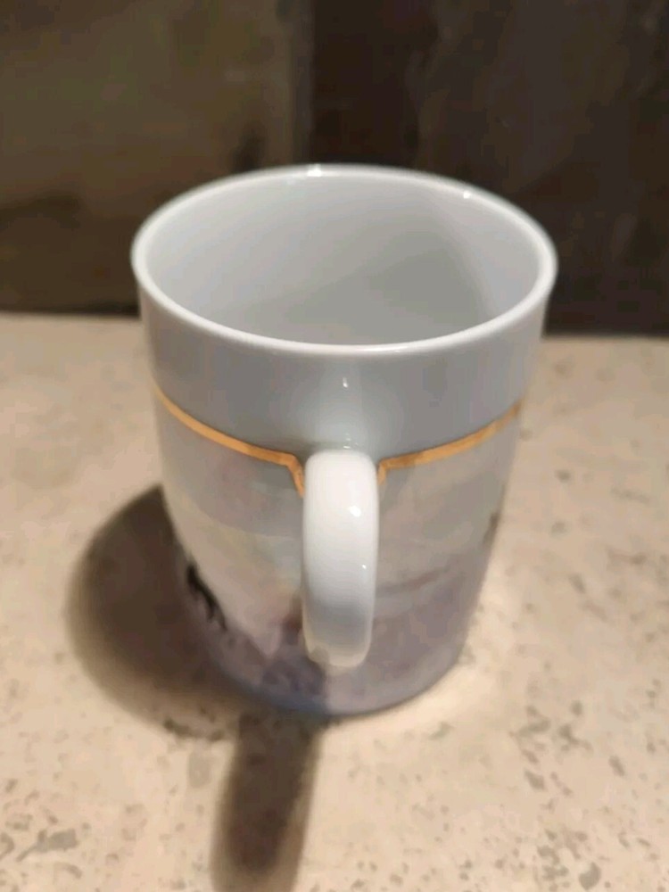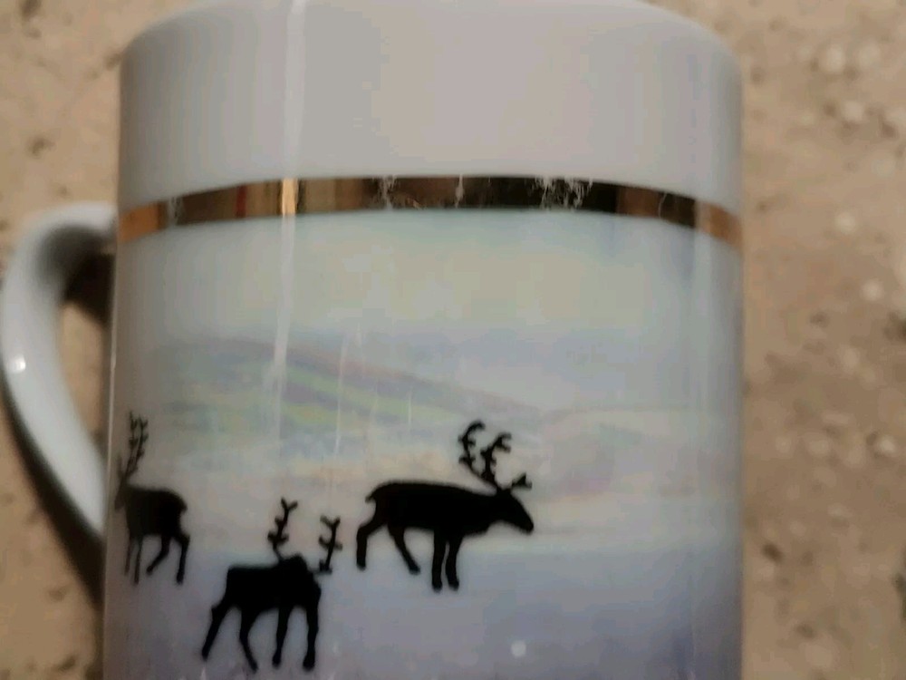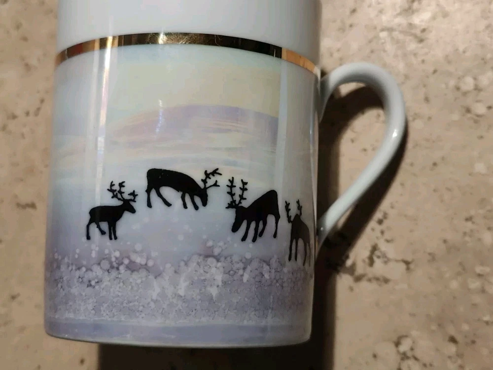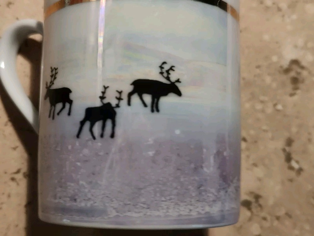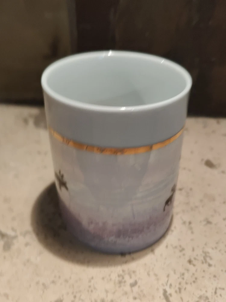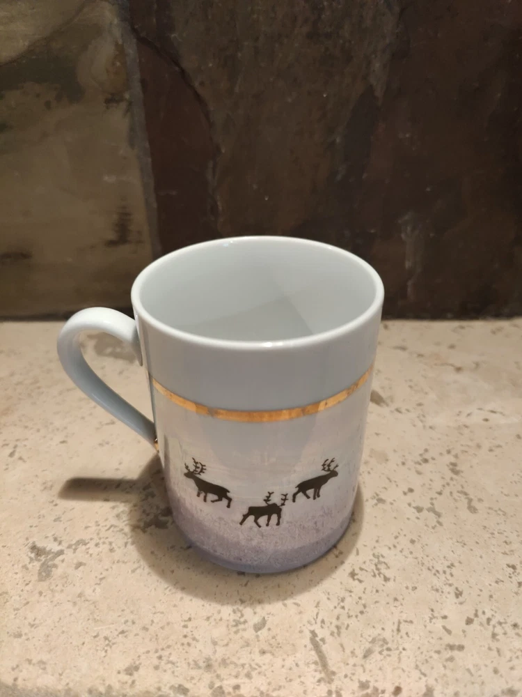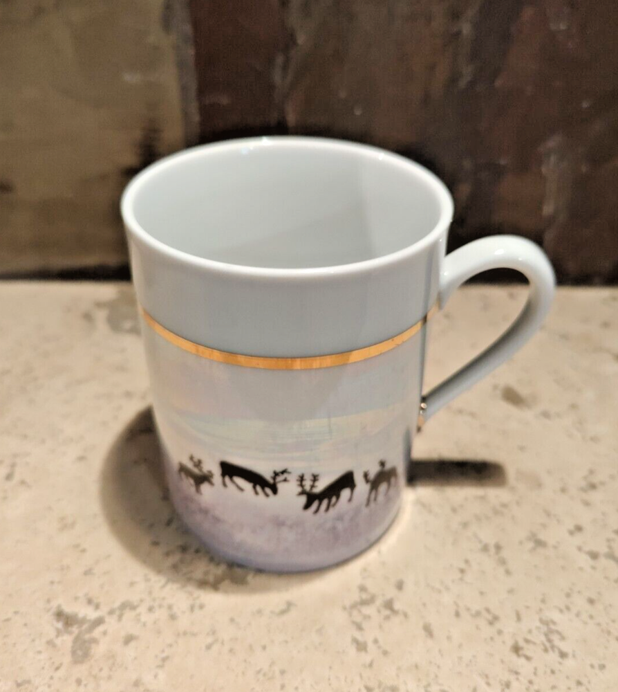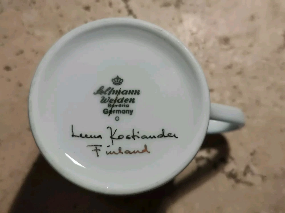 This unique coffee mug features a beautiful reindeer design by Seltmann Weiden, crafted in Bavaria, Germany. The round, petite small-sized mug stands at 3.5 inches tall and 2.75 inches wide. This is preowned and is does show wear specifically to the gold band around the cup and the colored areas. This is signed on the bottom by Laura Koshander Finland. I THINK that is what the name is, but I might be wrong. Take a look.