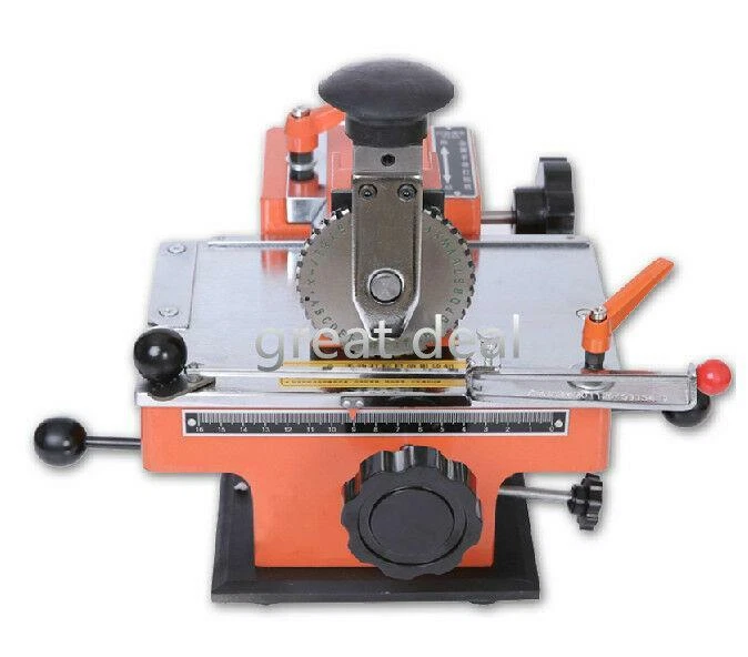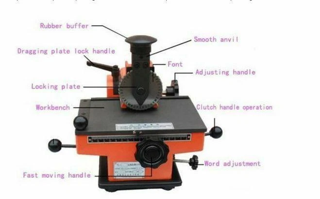 Application: Emboss on all types of aluminum, copper, stainless steel, plastic tag for mechanical, electrical, pumps, valves, automobiles, motorcycles, electrical appliances. It embosses variable parameters: such as dog tag, specific model, date, batch number, serial number, serial number and so on. Principles: 1.The external force (hand pressure or a rubber hammer) will emboss letters or numbers on the metal plate with a certain depth (0.1 ~ 0.3mm deep). Its stepless adjustment agent will adjust the embosser position, word spacing, and line spacing. The character heights can be adjusted by changing different. Different letters and numbers can be easily changed by turning around the plate. 2.Maximum label size: 200*130mm 3.Print characters: uppercase letters, digits, and simple symbols 4.Font size: 2 mm, 3mm, 4mm, 5mm, 6mm(This item Font size is 4MM,if you need other size,please tell us) 5.Print speed: about 2-4 characters / 10 seconds 6.Printing content including: A B C D E F G H I J K L M N O P Q R S T UV W X Y Z 123456789 . x / - Instructions for use: 1.The placing of signs methods, Signs placed in the work surface as shown upper left corner, with the signs and magnet clip without compression plate loosening. 2.Wheel loading and unloading, first used the word wheel wrench to remove the wheel nuts, and selected the right wheel, wheel lock fitted to the nut, aligned pointer. 3.Print, and start position adjustment, good signs placed to separate the clutch, turn the hand wheel spacing and kerning hand wheel so that wheel aligned characters printed on the box location just above the lock extension units, release the clutch lever, under pressure for a few kerning feed handles can be seen feeding on the caliper spacing density (hand wheel with a good tune kerning) depress the clutch, turn the hand wheel, release the clutch lever back in situ, with the palm of your hand slap of rubber parts, spacing after the feed handle pressure, to achieve printing. Note : 1,All our items will be shipped from China,our price doesn't include any tax fee 2,P O BOX address can not be shipped 3,Post code and your phone number are necessary for a smooth delivery eBay Cross Border Trade powered by ChannelEffect