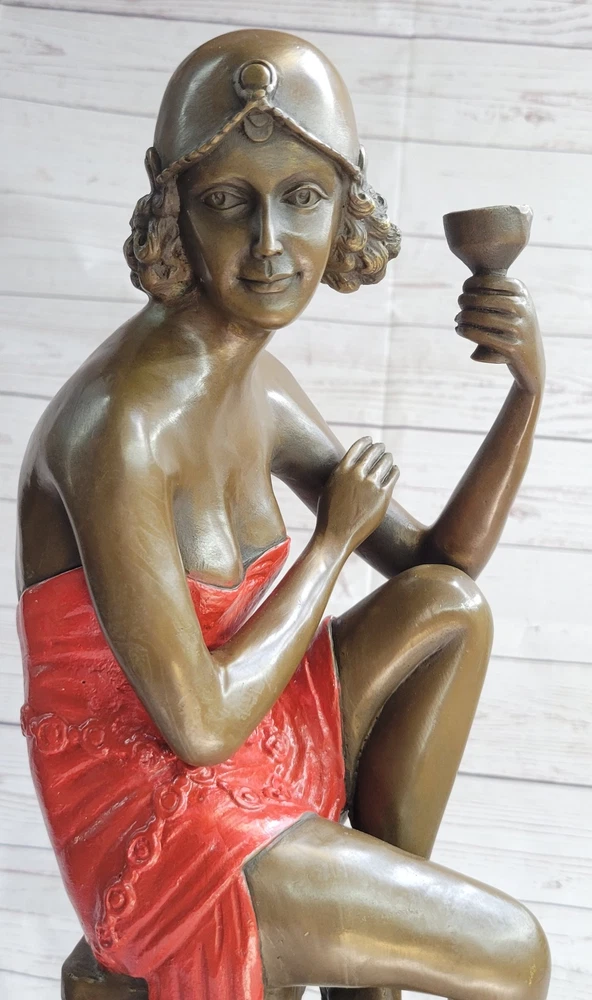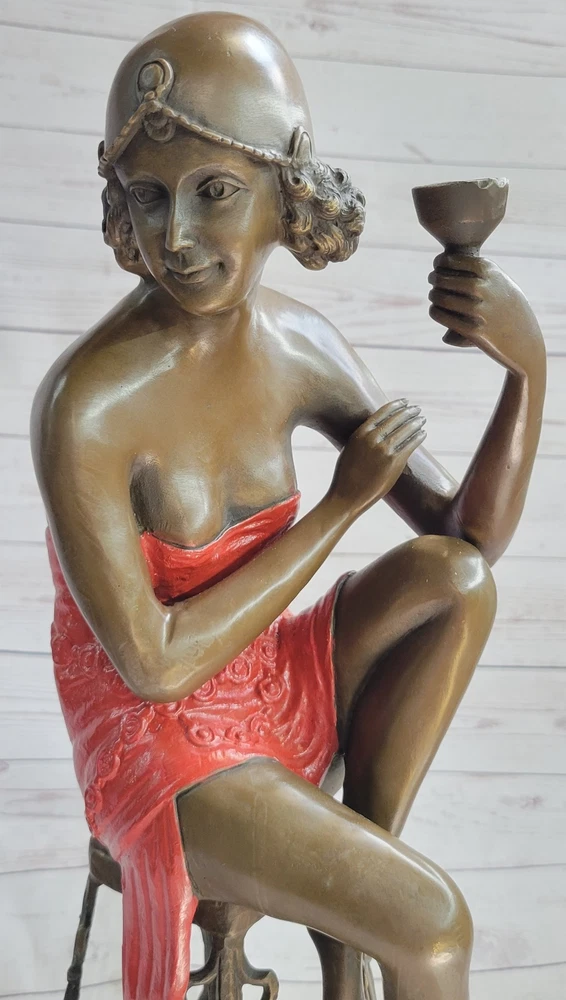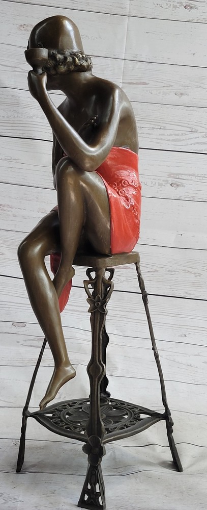 Condition : This sculpture is in perfect condition. Bronze Dimensions: Height 21.5" X Width 6.5" Weight:12 LBS Inventory:71EP266B12017 Step back in time to the Roaring 20s, the era of jazz, F. Scott Fitzgerald, and the fearless Flapper. These young women, known as the "New Breed," defied societal norms with their rebellious behaviors, including smoking, drinking, and yes, even driving. This exquisite bronze sculpture captures the spirit of these free-spirited individuals, making it a must-have for any aficionado of this iconic period. The Flapper is poised confidently on a black patina stool, embodying the era's spirit with her loose reddish patina short dress that drapes elegantly over her curves. Her gold beaded belt accentuates her waist, and a bow at the back adds a touch of flair to her attire. This sculpture impeccably portrays her relaxed demeanor as she rests a hand on her pulled-in knee, while her other leg swings down, revealing her voluptuous thighs in a rich brown patina. Her black bobbed hair peeks from beneath her fitted cloche hat, adding to her allure. This 100% handmade bronze sculpture, meticulously detailed and crafted using the time-honored "Lost Wax Method," is a true work of art. It proudly bears the signature of the artist J.E. Mir, a testament to the skill and dedication invested in this piece. Whether you're a fan of the 1920s, jazz music, or simply appreciate the beauty of this bygone era, this sculpture is a captivating and evocative addition to your collection or living space. Gorgeous Champagne Lady Sculpture by J.E Mir Brown Red Patina Figurine Sale Video will open in a new window Using the eBay App? Paste link into a browser window: [isdntekvideo]