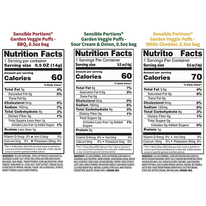 Sensible Portions Garden Veggie Puffs โ Baked Snack Variety Pack โ Sour Cream & Onion, White Cheddar, Barbecue โ 30% Less Fat ๐ฅฆ Delicious, Crunchy & Guilt-Free Snacking Satisfy your cravings the smarter way with Sensible Portionsยฎ Garden Veggie Puffs โa light, airy, and flavorful snack made with real vegetables. These snacks are baked, never fried , offering a healthier alternative to traditional puffed snacks without sacrificing taste. ๐ Healthier Choice with 30% Less Fat Enjoy your favorite puffs with 30% less fat than the leading puffed snack brand. Whether you're watching your diet or just prefer lighter snacks, Garden Veggie Puffs are a perfect choice for kids, adults, and anyone looking for a wholesome treat. ๐ 3 Irresistible Flavors in One Pack ๐ง Sour Cream & Onion โ creamy, tangy, and savory ๐ง White Cheddar โ cheesy and smooth ๐ฅ Barbecue โ smoky and bold Each bite is packed with flavor, making them ideal for lunchboxes, on-the-go snacking, parties, or movie nights. Product Highlights: โ Baked, not fried โ healthier snacking option โ 30% less fat than regular puffed snacks โ Made with real garden vegetables โ Includes 3 bold flavors in one variety pack โ Great for adults and kids alike Perfect For: Healthy snacking School lunches Family gatherings On-the-go munching Snack smart and snack tasty with Sensible Portions Garden Veggie Puffs โ Add to your cart today!
