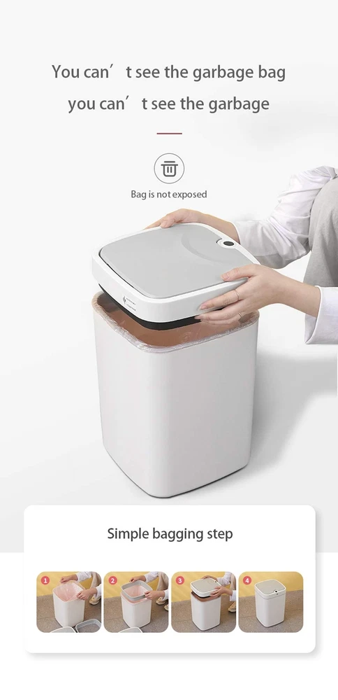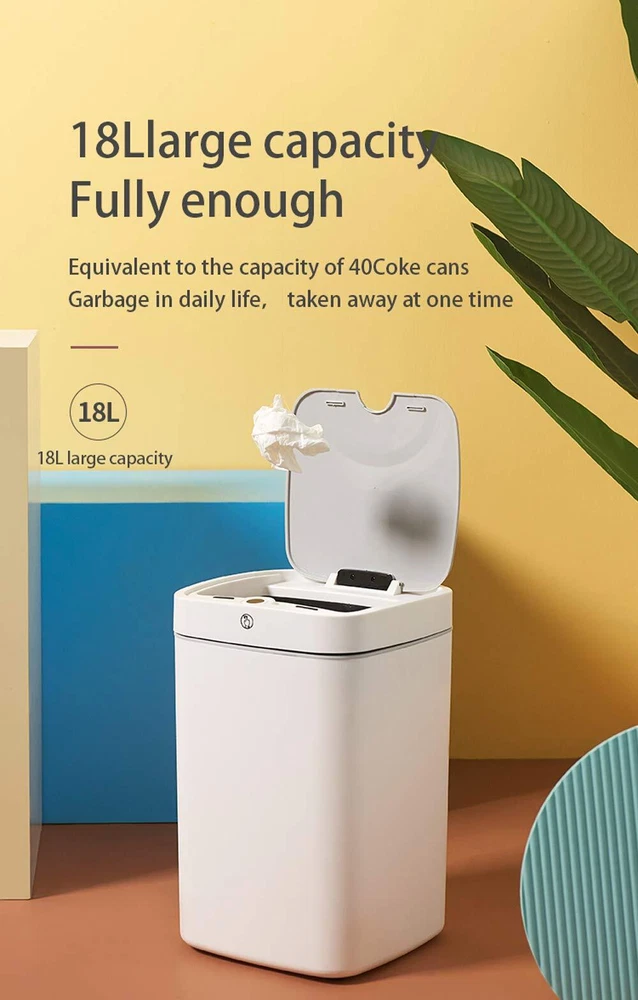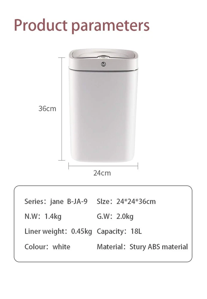 Material :Stury ABS material Capacity:18L Liner weight:0.45kg New weight:1.4kg Grow weight:2.0kg Size:24*24*36cm/9.4*9.4*14.1 inch Package: 1x Sensor Trash Can ❖Touchless Automatic Trash Can - Study ABS Material&18L Large Capacity Fully Enough,Once molding ,High-strength material ,let the strong one stay at home longer.Equivalent to the capacity of 40 coke cans garbage in daily life,taken away at one time ❖Touch Sensing Garbage Can -Any angle,open at the touch ,free from touching the lid ,no need to bend ove ❖Automatic Trash Can ,Sealing Odor -Good sealing ,odor does not spread ,trash bin is well sealed ,Effectively prevent the spread of odor ,Give you a fresh ,cozy home ❖9 Major Upgrades Leading A New Era Interlligence Trash Can -Not only will it only automatically open and close. Automatic induction ,Touch sensing ,Sealing odor ,Long open function,Two ways of using ,Bass slow down,Sturdy ABS material ,Bag is not exposed ,18L large capacity . ❖One button on/off &Rechargeable available dry battery -One button is always open ,Easy to throw garbage,The built-in lithium battery is protected by overcharge and over discharge ,Make sure the battery lasts.