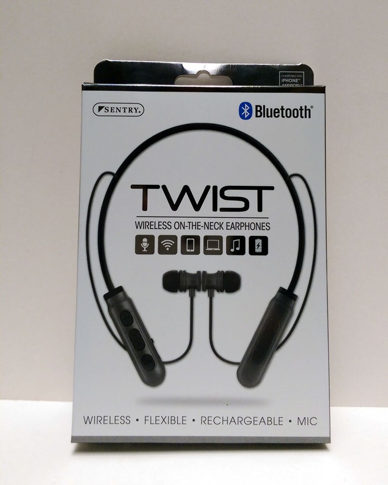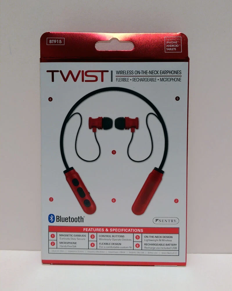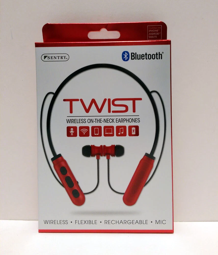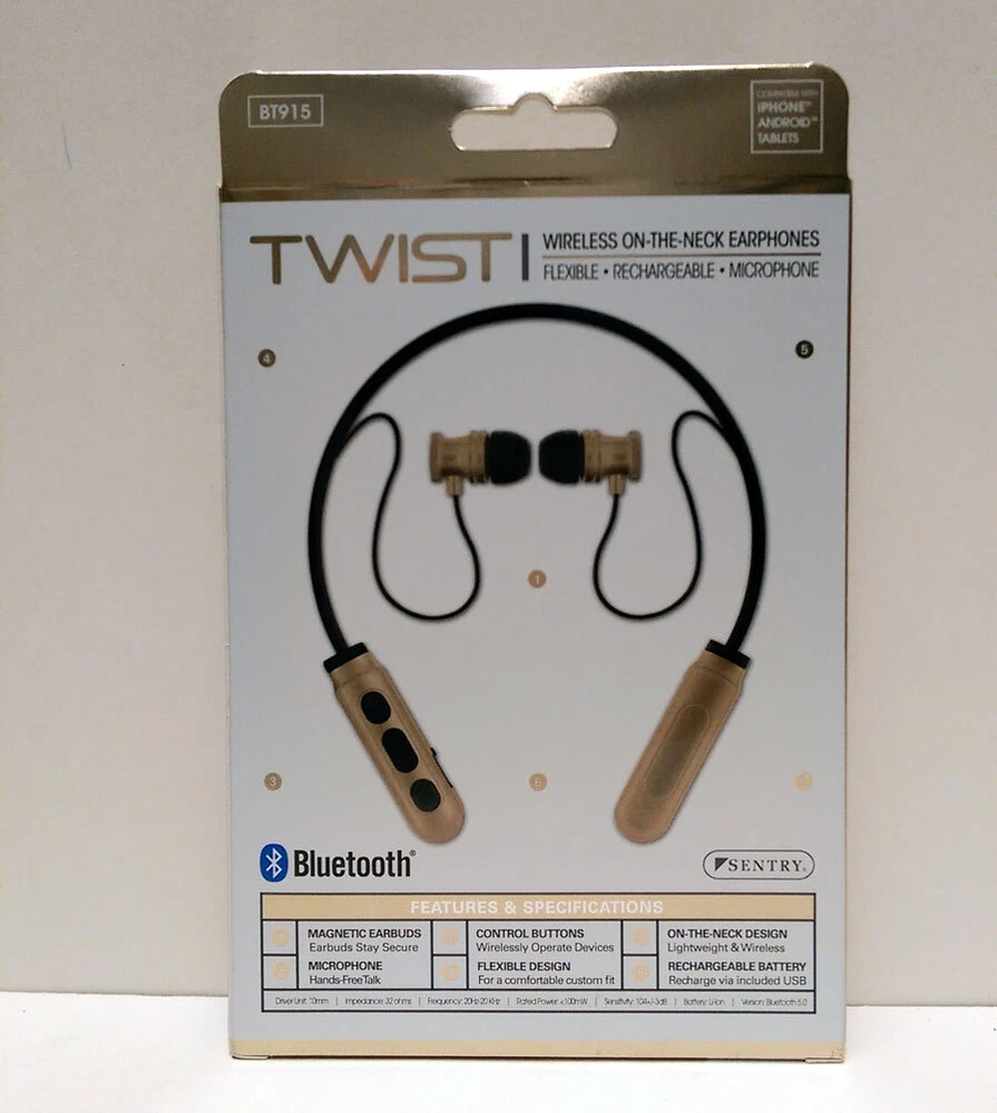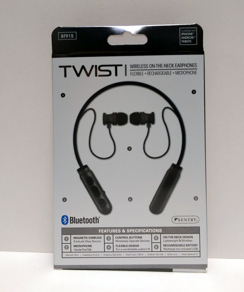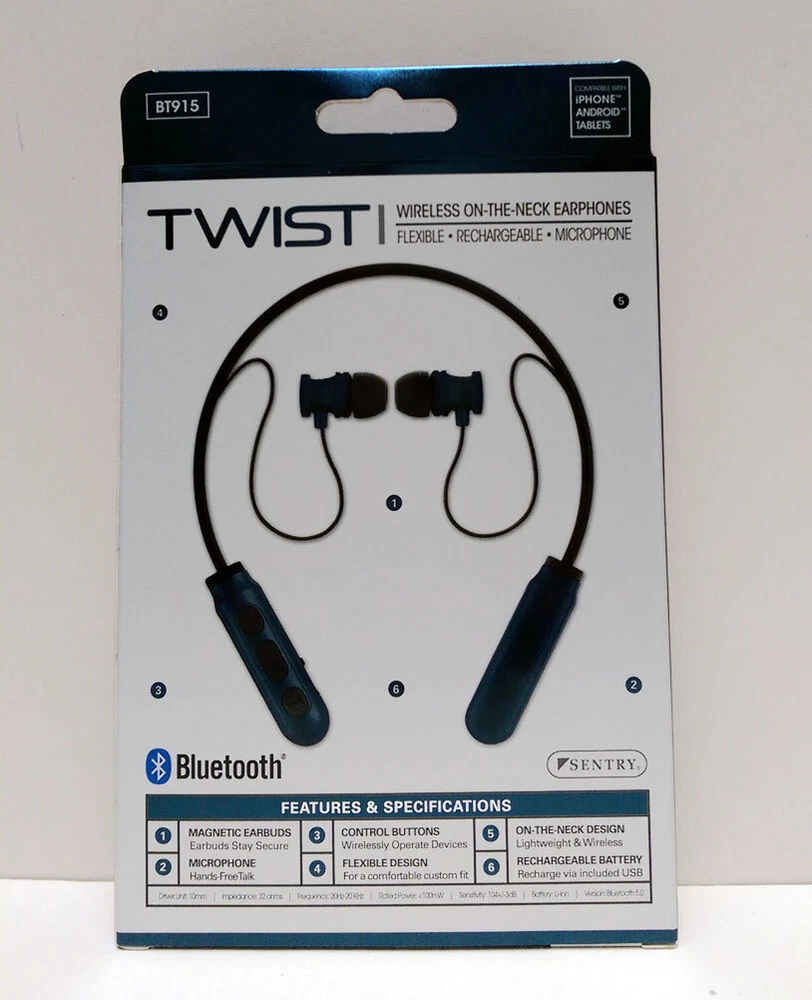 BRAND NEW Sentry Bluetooth TWIST Wireless ON-THE-NECK Earphone Headphones Earbuds Wireless-flexible-Rechargeable-Mic Key Features: One Sentry Bluetooth TWIST Wireless ON-THE-NECK Earphone Compatible with iPhone, Android and Tablets Stereo - Phones, Wireless, Controls, Computers, In-Line Mic, Recharge, Comfort Magnetic earbuds: Earbuds stay secure Microphone: hands Free talk Control Buttons: Wirelessly Operate devices Flexible Design: For a comfortable custom fit On-The-Neck Design: Lightweight and wireless Rechargeable Battery: Recharge via included USB Brand New Item # JC343471 Specifications: Driver Unit: 10mm Sensitivity: 104+/3dB Impedance 32 ohms Battery Li-ion Frequency: 20Hz-20KHz Version: Bluetooth 5.0 Rate Power:<100mW Playtime: Up to 2 hours of 50% volume VISIT OUR EBAY STORE FOR MORE ITEMS