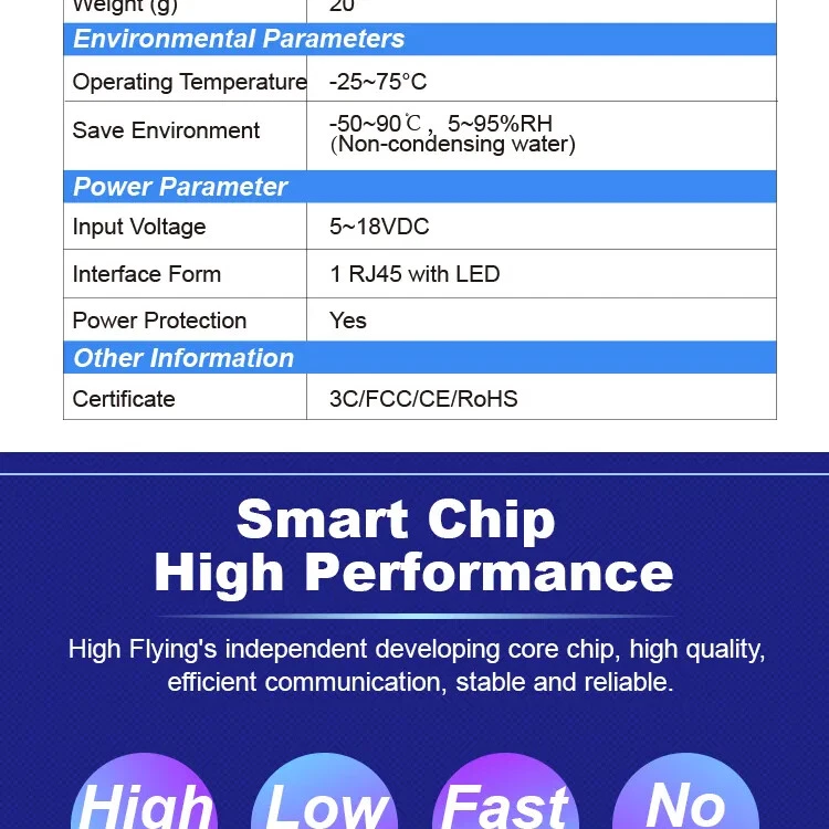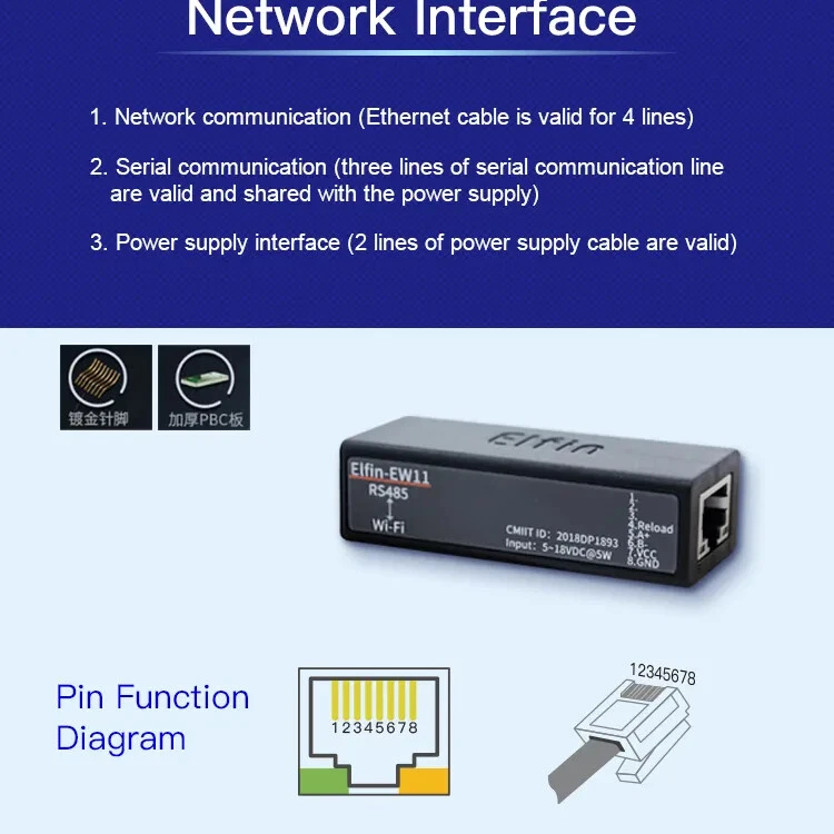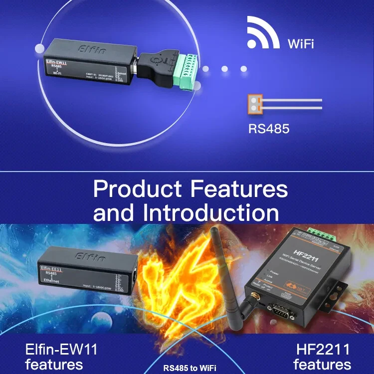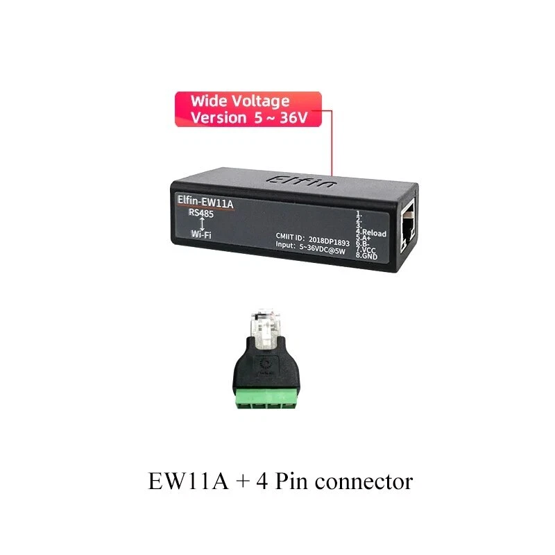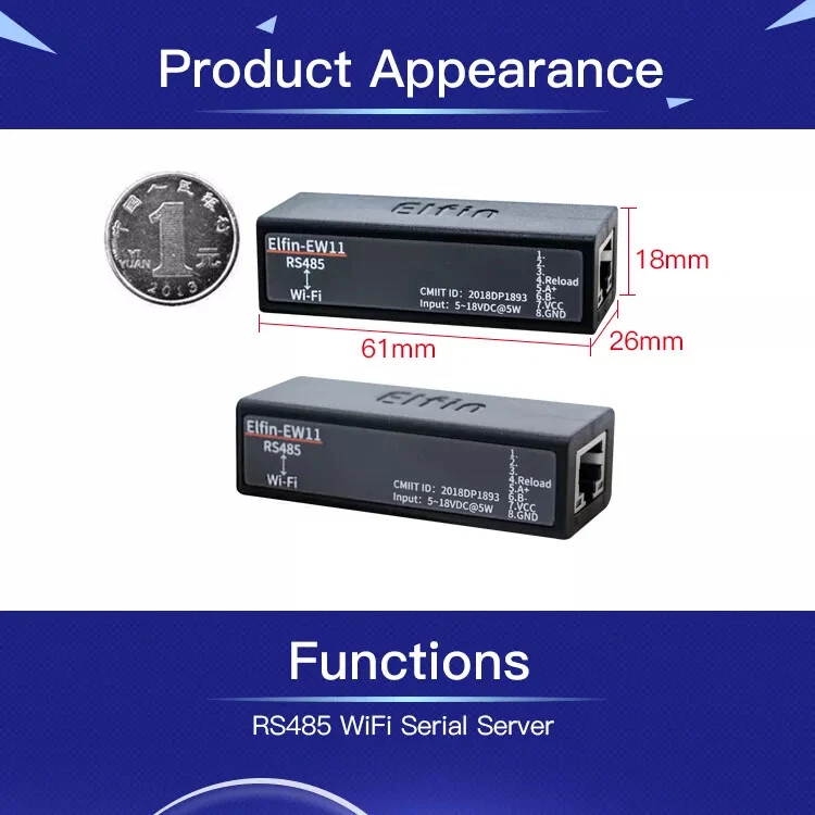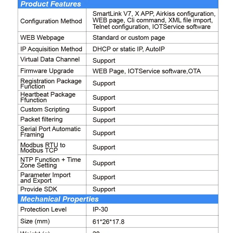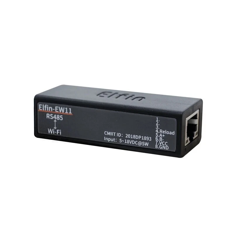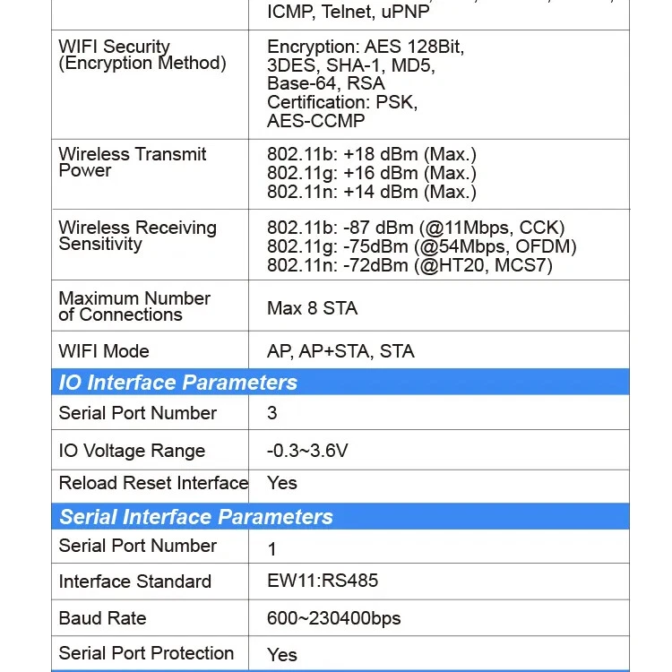 The Elfin-EW1X unit is a complete solution for serial port device connecting to network. This powerful device supports a reliable and proven operating system stored in flash memory, an embedded web server, a full TCP/IP protocol stack, and standards-based (AES) encryption. Elfin-EW1X serial server for data transfer via Wi-Fi, which makes the data transformation very simple. Overview of Characteristic: Support 802.11bgn Wireless Standard Support TCP/UDP/Telnet /Modbus TCP Protocol Support RS485 to Ethernet/Wi-Fi Conversion, Serial Speed Up to 460800 bps Support STA/AP/AP+STA Mode Support Smartlink V8 Smart Config(Provide APP) Support Easy Configuration Through Web Interface or PC IOTService Tool Support Security Protocol Such As TLS/AES/DES3 Support Web OTA Wireless Upgrade Support Internal PCB Antenna Wide DC Input 5~18VDC Size: 61 x 26 x 17.8 mm (L x W x H) FCC/CE/SRRC Certificated Item Parameters System Information Processor/Frequency 160MHz Flash/SDRAM 2MB/448KB Operating System mbed Protocol Network Protocol IP,TCP,UDP,DHCP,DNS,HTTP Server/Client,ARP, BOOTP, AutoIP, ICMP,Web socket, Telnet, uPNP, NTP, Modbus TCP Security Protocol TLS v1.2 AES 128Bit DES3 Wi-Fi Interface Standard 802.11 b/g/n Frequency 2.412GHz-2.484GHz Network Mode STA/AP/STA+AP Security WEP/WPAPSK/WPA2PSK Encryption WEP64/WEP128/TKIP/ AES Tx Power 802.11b: +18dBm(Max.) 802.11g: +16dBm(Max.) 802.11n: +15dBm(Max.) Rx Sensitive 802.11b: -89dBm 802.11g: -81dBm 802.11n: -71dBm Antenna Internal:PCB Serial Port Port Number EE10:1 RS232 EE11:1 RS485 Data Bits 7,8 Stop Bit 1,2 Check Bit None,Even,Odd Baud Rate TTL: 600 bps~460800 bps Flow Control No Flow control Software Xon/ Xoff flow control Software Web Pages Http Web Configuration Customization of HTTP Web Pages Configuration Web CLI XML import Telnet IOTService PC Software Basic Parameter Size 61 x 26 x 17.8 mm Operating Temp. -40 ~ 85degC Storage Temp. -45 ~ 105degC, 5 ~ 95% RH(no condensation) Input Voltage 5~18VDC Working Current ~200mA Power <700mW Other Information Certificate FCC/CE/SRRC/RoHS