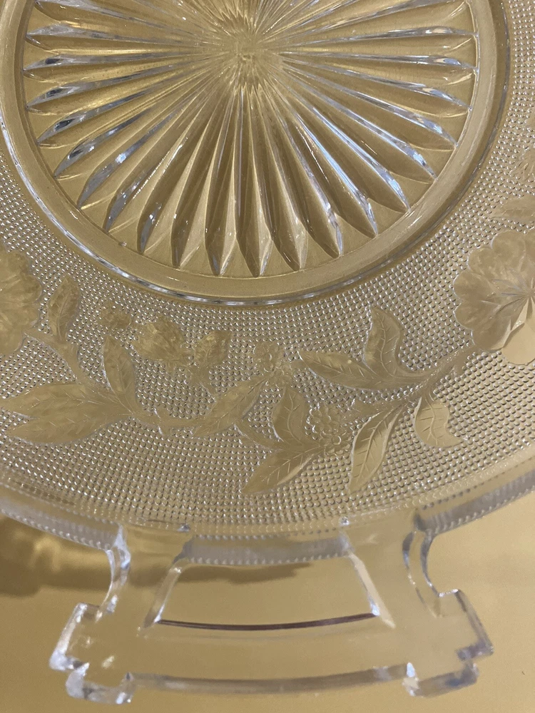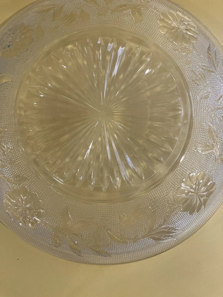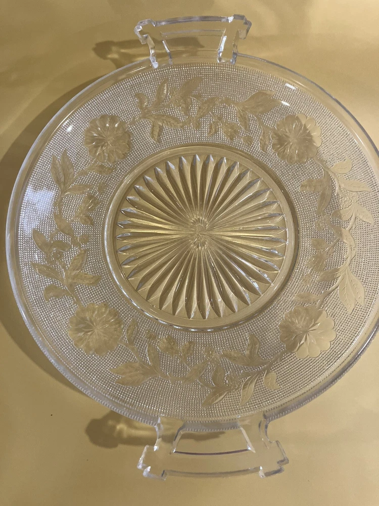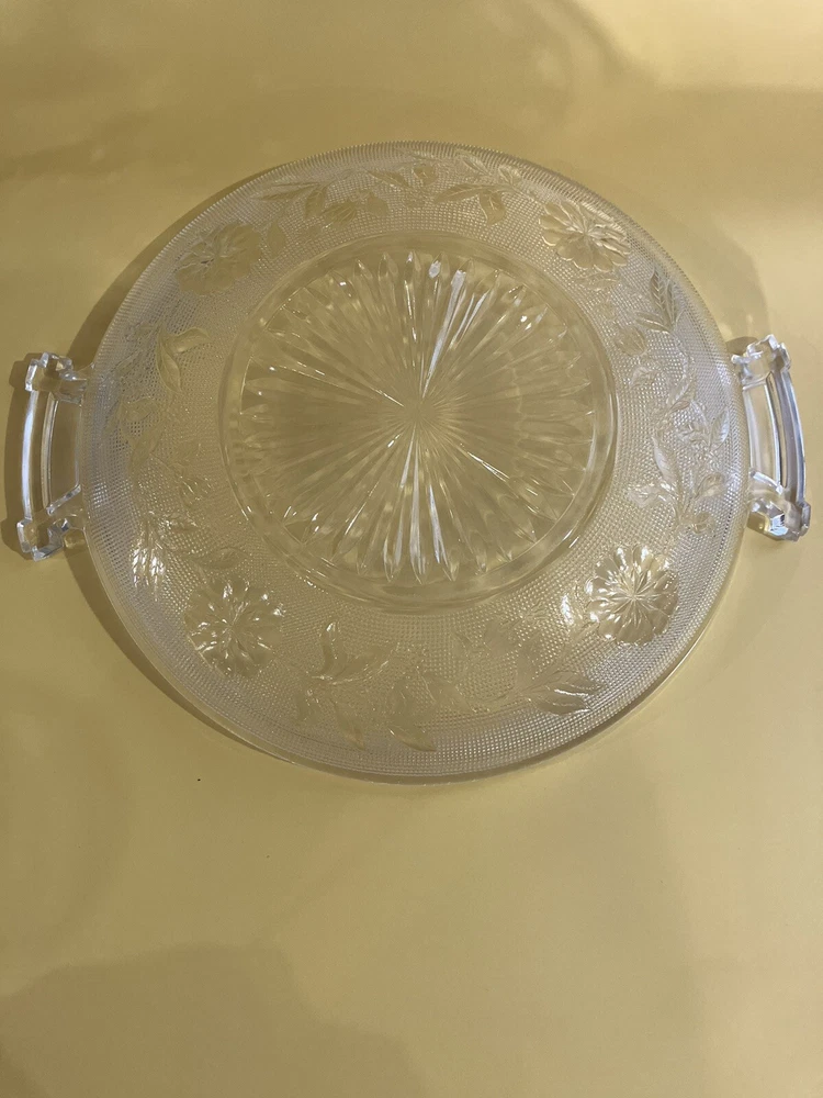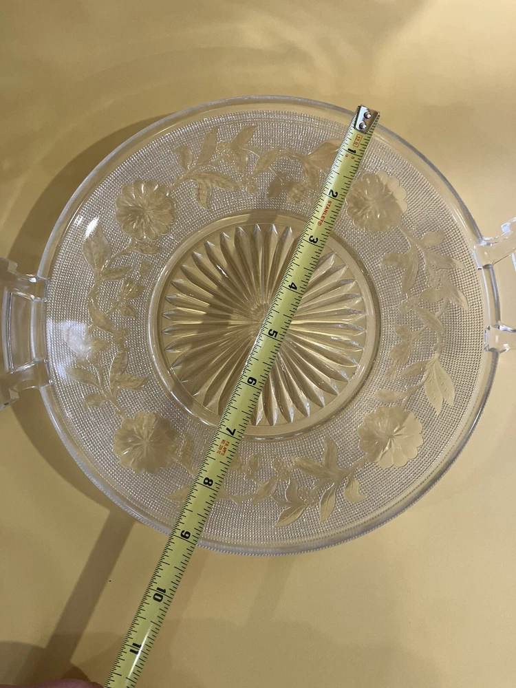 Serving Dish 9 inch Clear Glass Etched Flowers 2 Handles. Condition is Used. Shipped with USPS Ground Advantage.