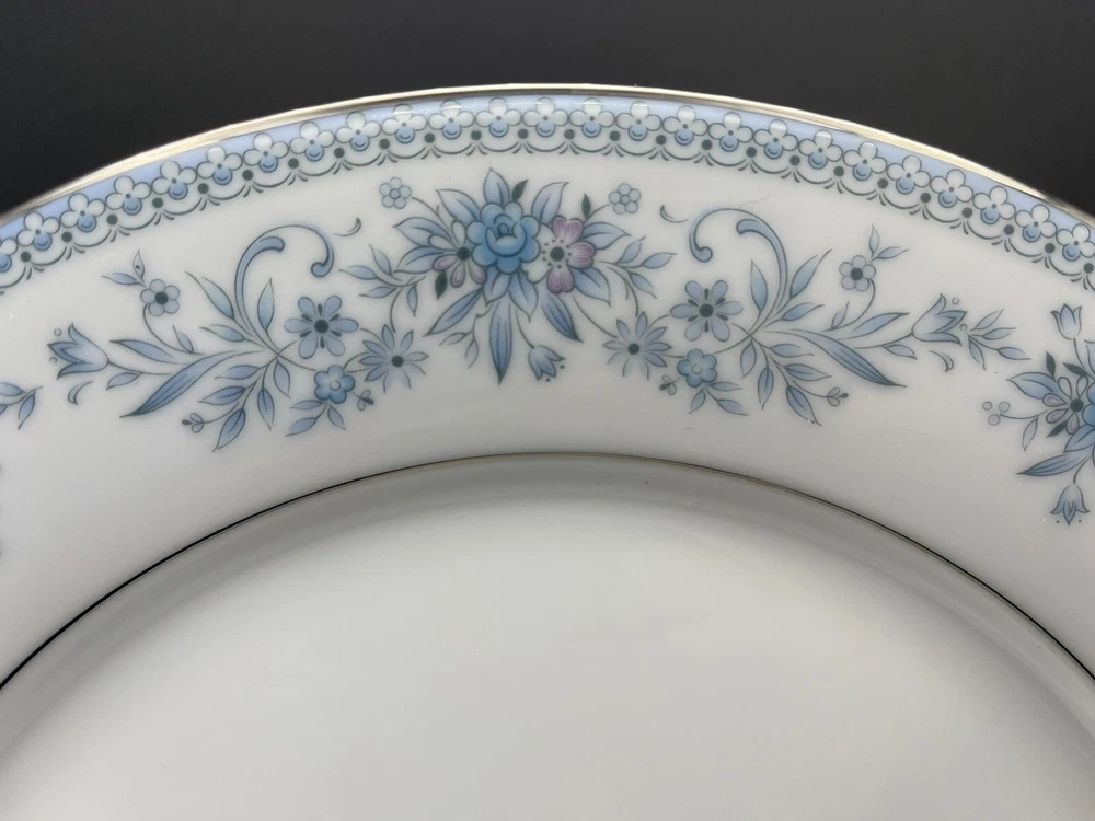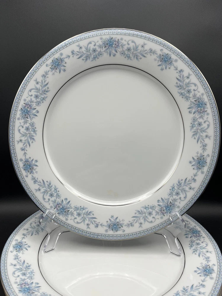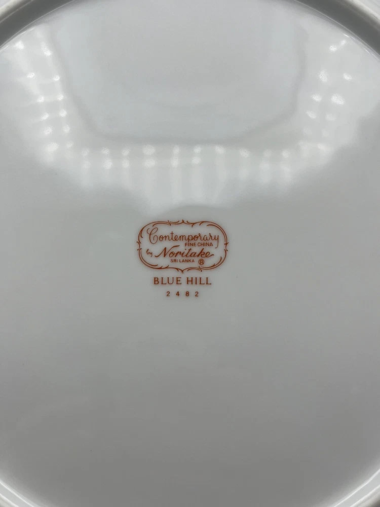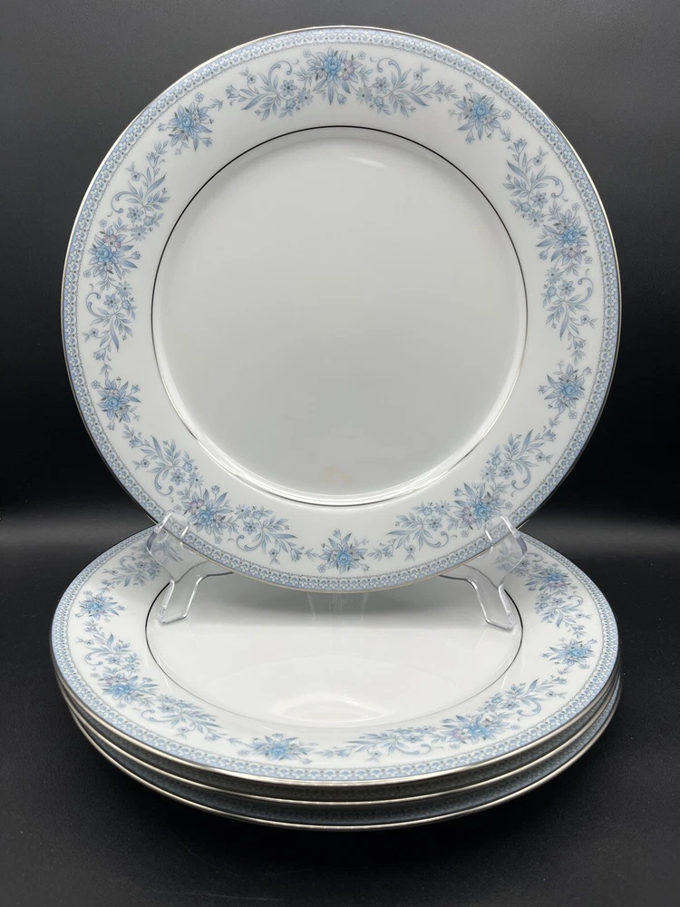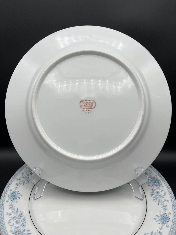 This set of four contemporary fine china porcelain dinner plates from Noritake's Blue Hill collection is a beautiful addition to any dining experience. The plates measure 10.5 inches in diameter and feature a stunning floral pattern in shades of blue. They are perfect for all occasions, whether you are hosting a formal dinner party or a casual family meal. Crafted in China with precision and care, these plates bear the Noritake brand name and are an original production line. The set includes both dinner plates and regular plates, making it a versatile option for any table setting. The backstamp is printed and the plates are not antique or vintage. They are perfect for those who appreciate contemporary style and design. Like new condition.