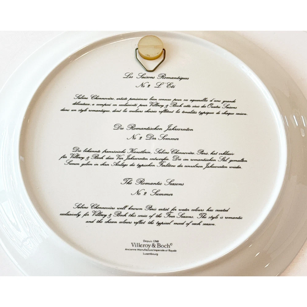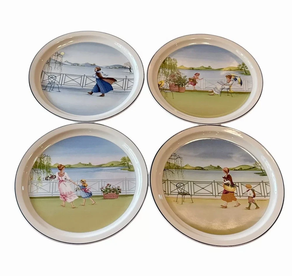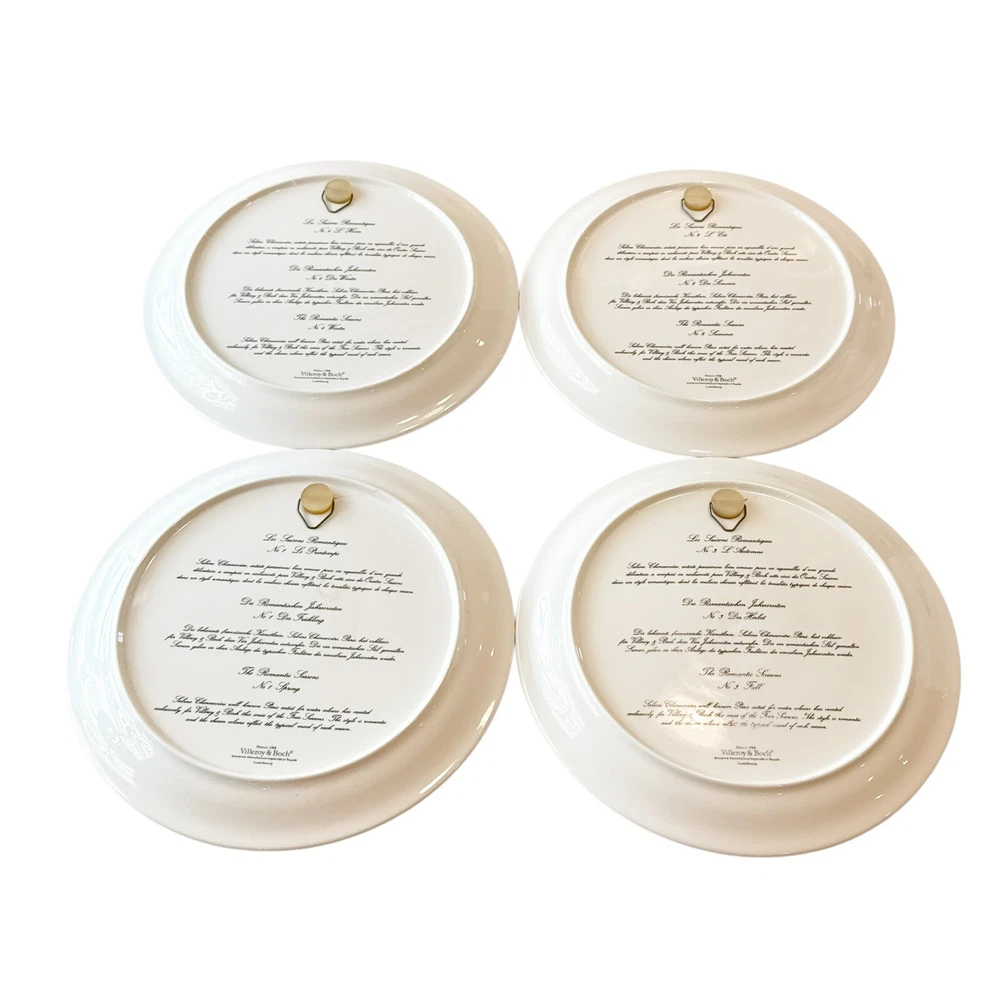 This is a set of four Villeroy & Boch decorative plates with a romantic 4 seasons theme. Each round plate measures 9 inches in diameter and features a multicolor floral design. The plates are vintage from the late 20th century and are part of a limited edition collection. They are made of porcelain, have a glossy finish, and are ideal for all occasions. Each plate is adorned with a different design representing each season. Smoke free home Please visit my store at https://www.ebay.com/str/theuniqueredhead . Thank you for your consideration. Please message me if you have any questions. I do combined shipping on my items in the store.