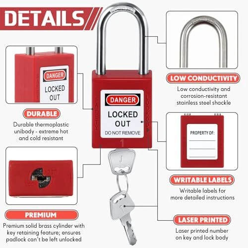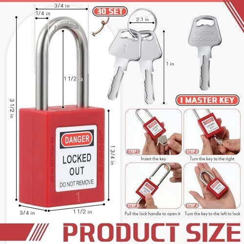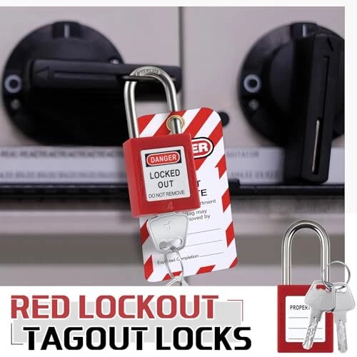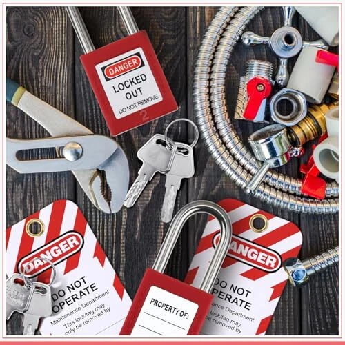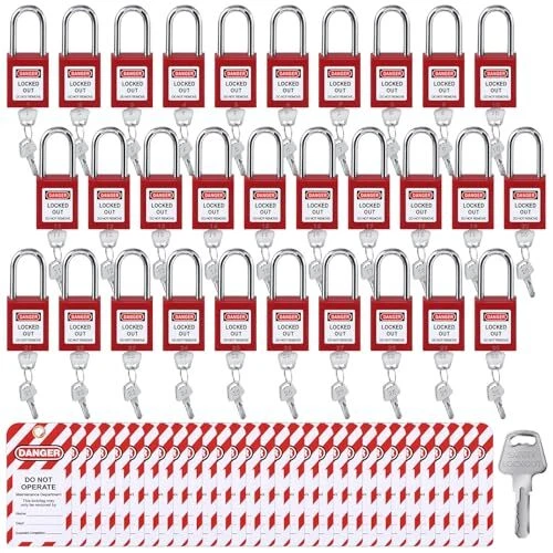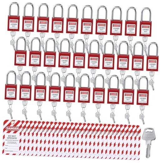 Return Policy Fast Delivery Trusted seller 30 Set Lockout Tagout Locks Kit, Safety Keyed Padlocks with Loto Locks Differently and Lock Out Tag Out Tags for Lock Out Tag Out Stations and Devices Electrical Lockout Tagout Kits, Red Product Description Easy Packing: you will receive 30 sets of set loto product safe padlocks with a total of 61 keys in which each lock is equipped with 2 keys and one master key, and 30 labels; Spare keys can prevent the trouble of losing keys; Before choosing one of our products, please ask the security guard if spare keys are allowed Safety Management System: different key cylinder, ensures that the number of each lock is different; Each loto lock and key is etched with a different laser printed number ensuring clear identification and making it difficult to erase; These safety features are designed to facilitate your loto safety management effortlessly Standard Industrial Size: the lock body's width is about 1-1/2 inch; The shackle is about 1/4 inch diameter with 1-1/2 inch length, 3/4 inch width Quality Lockout Tags: our lock out locks come with practical, industrial grade lockout tags crafted from resistant PVC material, they're ideal for indoor and outdoor, thus furnishing a nice combination of durability and convenience; The lock out tag allows for a clear record keeping of crucial information; Utilize a permanent marker or wax, grease pencil to record these details as they don't work with ordinary pens Wide Application: experience security with our lockout locks made of robust stainless steel and featuring a brass lock cylinder; These materials ensure the longevity of the locks, assuring you of their ability to withstand regular use and tense environments; Thus these locks are suitable for industrial grade places including industrial, coal, electric power, flammable and explosive places Shipping Returns Payment Shipping Shipping is FREE to all addresses other than APO/PO boxes in the lower 48 states. All our stock ships from US-based warehouses. Shipped via USPS or UPS (depending on location and package weight) Unless stated otherwise, all orders will ship within 24-72 hours of your payment being processed. Check our feedback to see the great reviews of FAST shipping we offer. Returns Seller does not accept returns Payment We currently accept payment via eBay managed payments only. Once payment is cleared, we will dispatch your shipment within 1-3 business days. Please refer to the "Shipping" tab for more information regarding shipping speed to your destination.