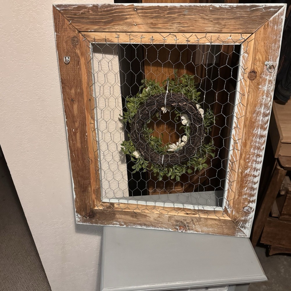 This farmhouse wood/wire window frames with greenary is a charming addition to any rustic wall decor. The large rectangular frames are made of wood and, featuring a green color with a printed decorative finish. The farmhouse style and hanging/wall-mounted design add a touch of home sweet home to any space, making it a unique and eye-catching piece of wall decor for your home.