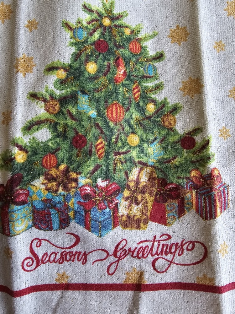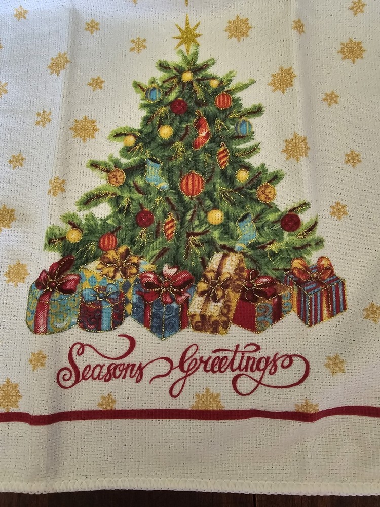Set Of 2 Kitchen Hand Towels Christmas Tree "Seasons Greetings " 100% Polyester
