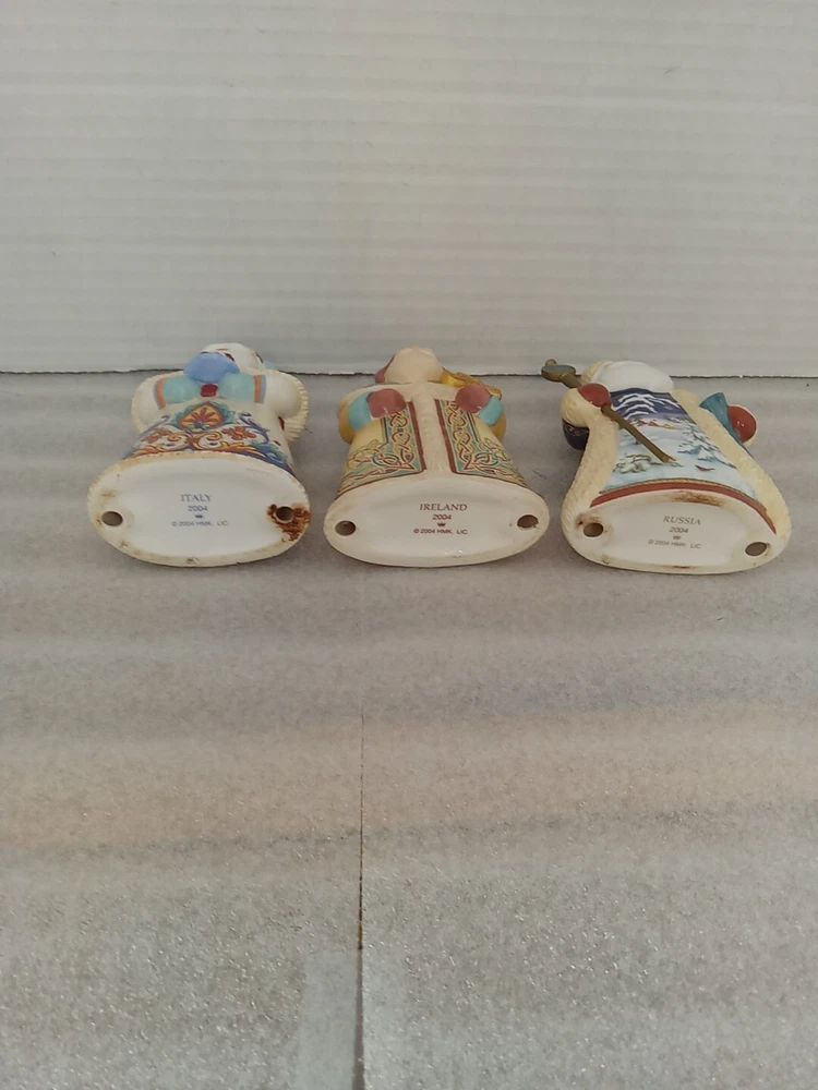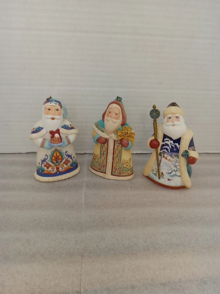 The product is a set of 3 vintage Hallmark ornaments featuring Old World Santas from Italy, Ireland, and Russia. Each ornament measures 4 inches and showcases a vintage design. Made in Ireland, these Christmas ornaments are collectibles that evoke a sense of nostalgia and holiday charm.