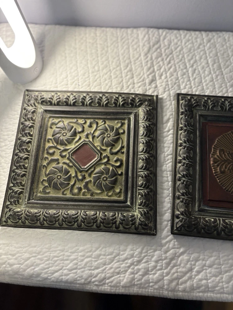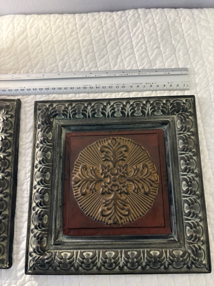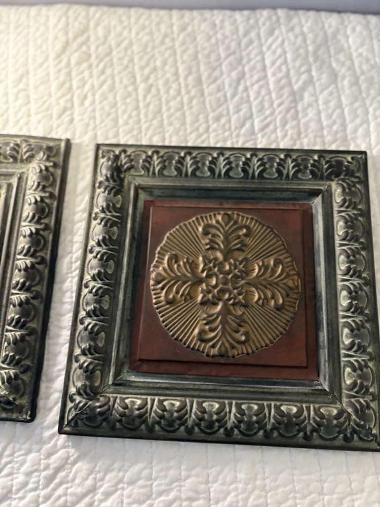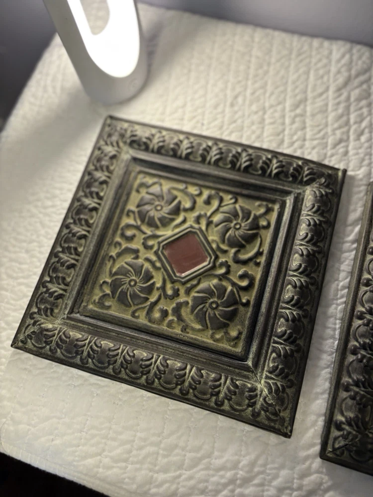 This set of metal wall art hangings features a bronze tone with a green square design, adding a rustic and distressed look to any room. The metallic finish and hanging mounting make it a perfect addition to any adult's living space. Easy to clean with a damp cloth, this wall art set is a unique and stylish choice for those looking to add a touch of art to their home. Approximately 9” x 9”