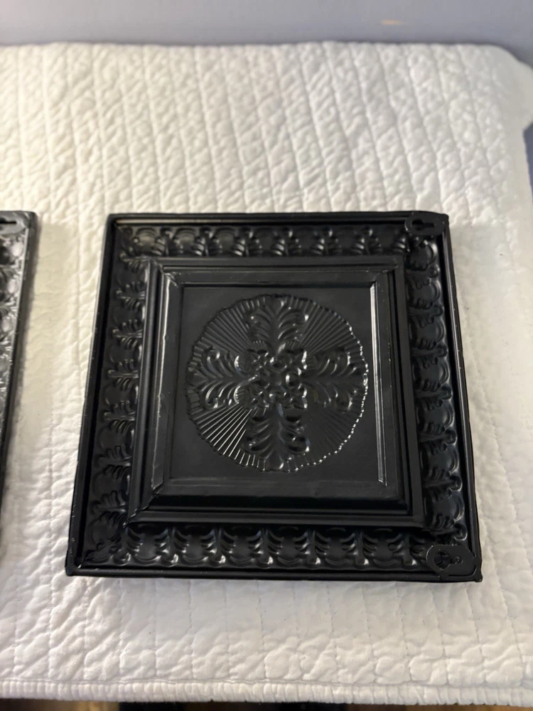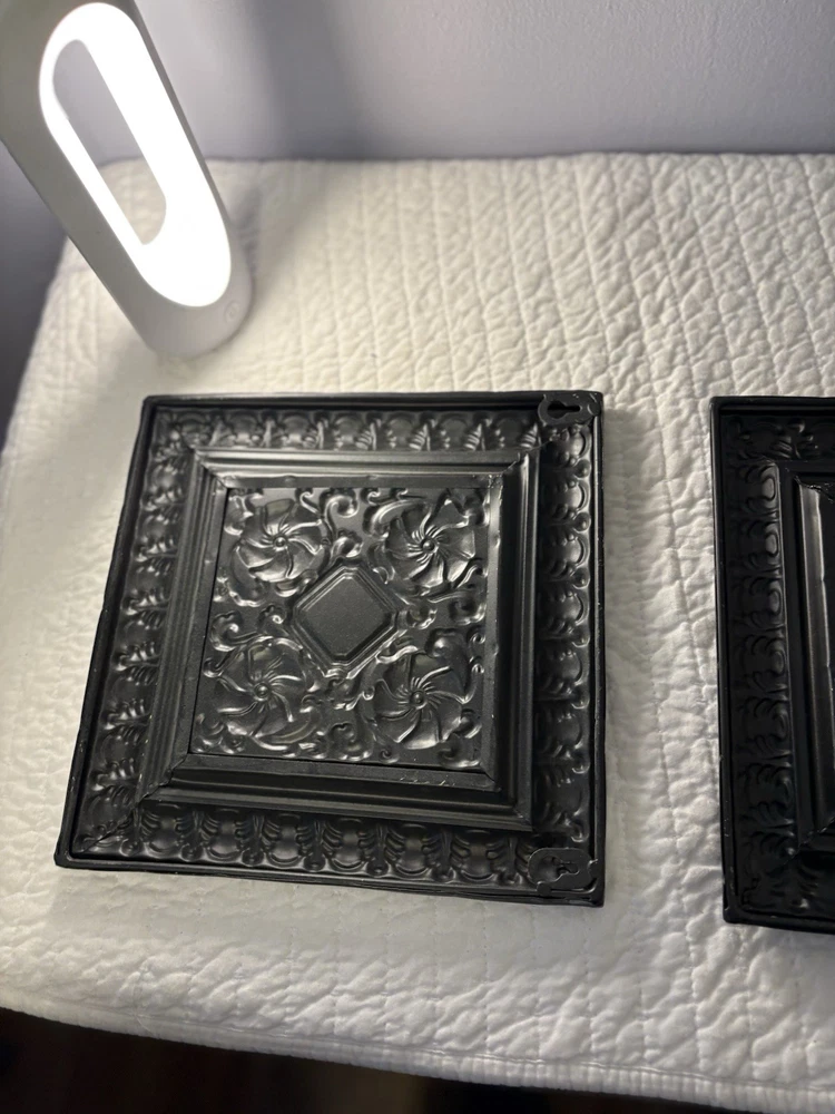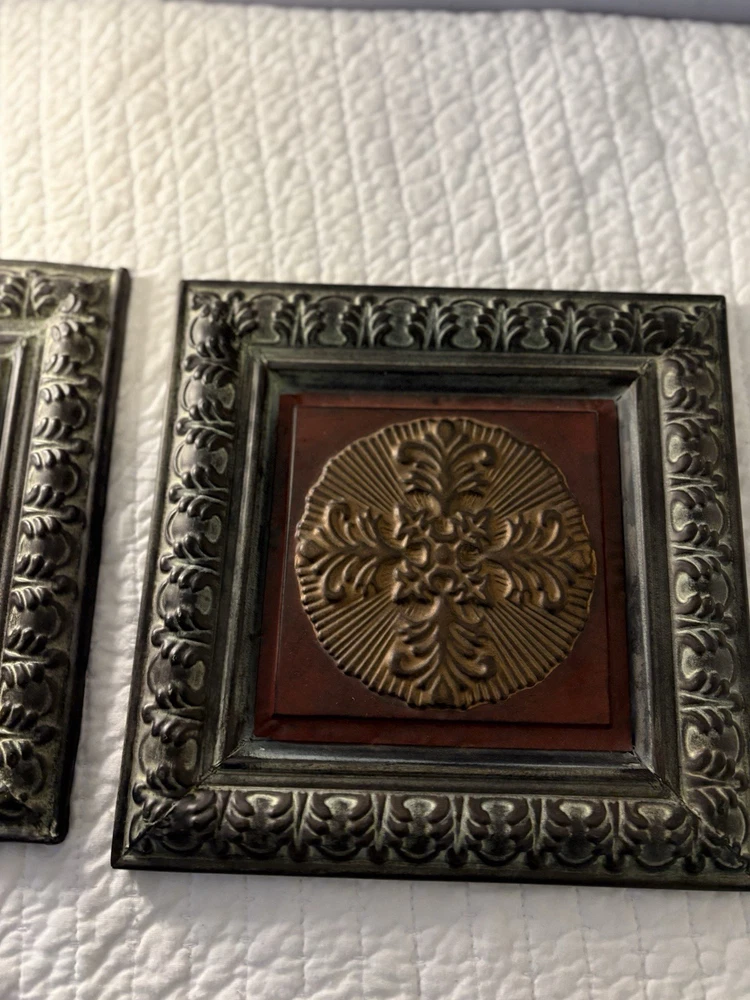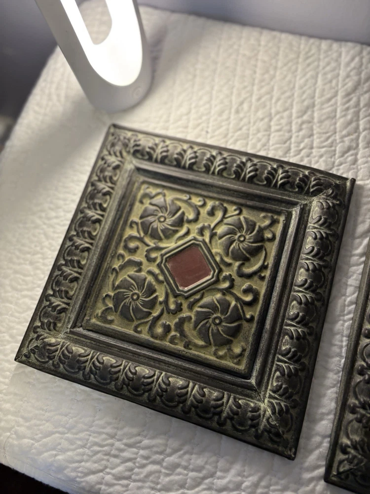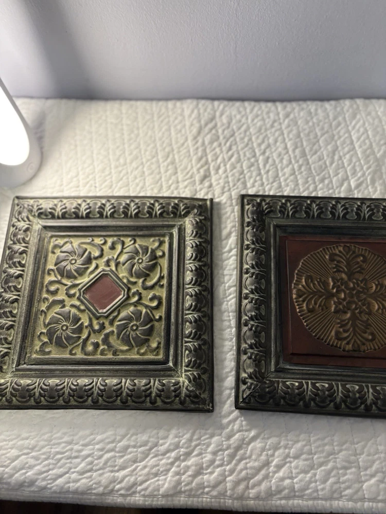 This set of metal wall art hangings features a bronze tone with a green square design, adding a rustic and distressed look to any room. The metallic finish and hanging mounting make it a perfect addition to any adult's living space. Easy to clean with a damp cloth, this wall art set is a unique and stylish choice for those looking to add a touch of art to their home. Approximately 9” x 9”