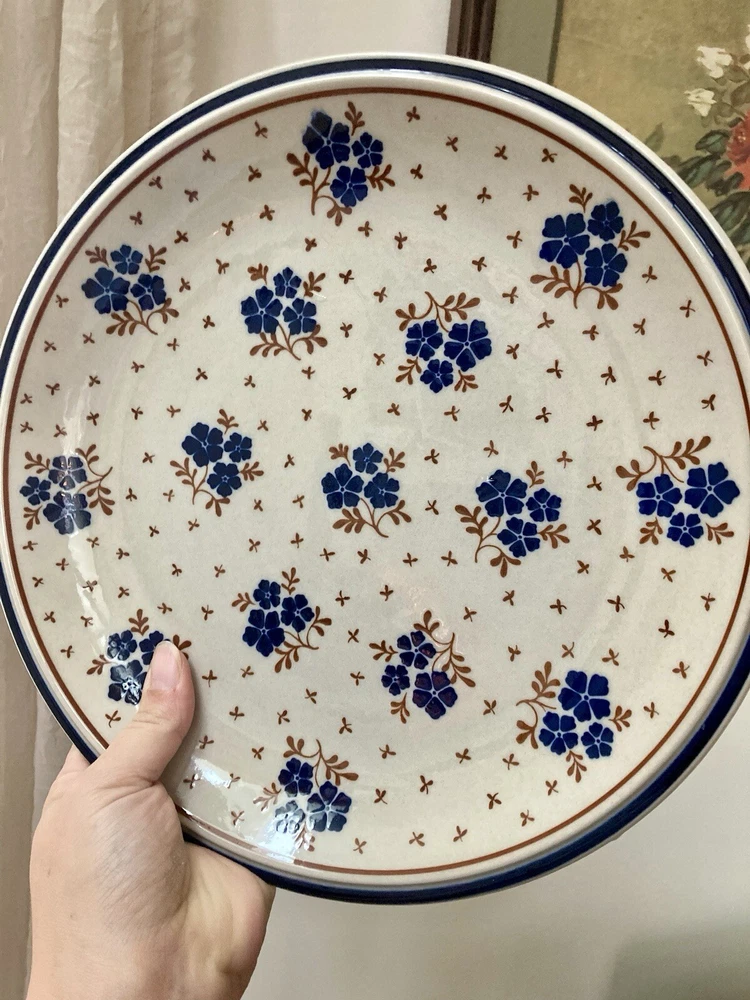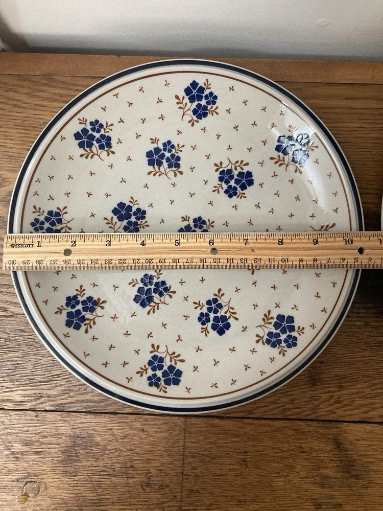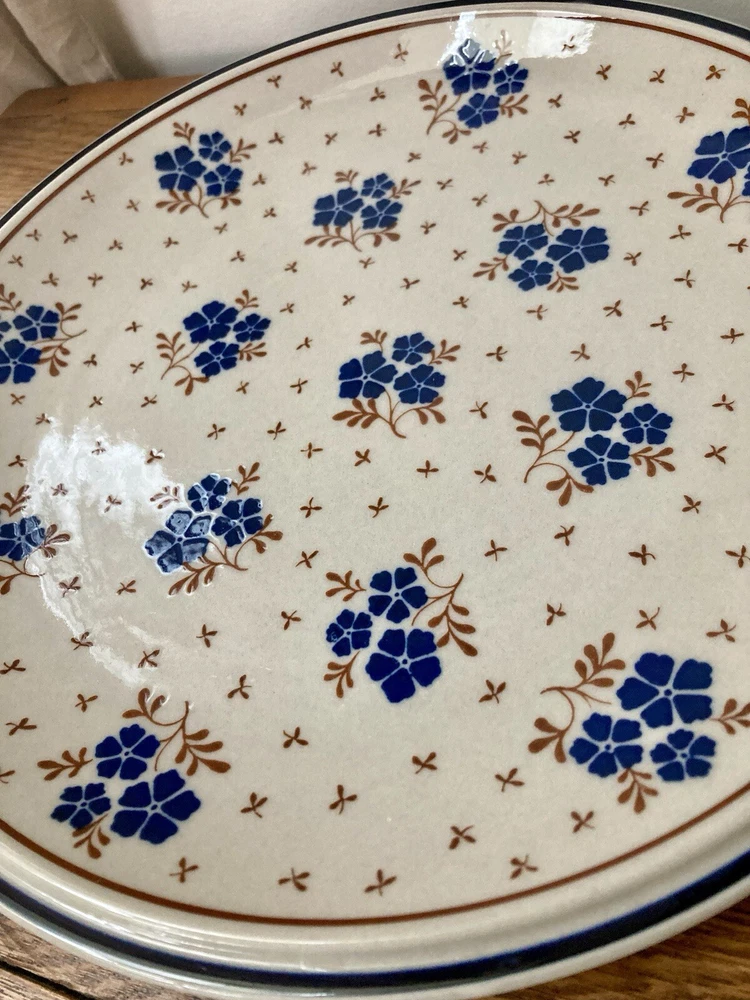 Set of two lovely Newcor Stonrware dinner plates, in Country Field pattern. Beige background with royal blue flowers and brown accents. Measures 10.5” wide. In excellent condition, no chips or cracks. Some very minor surface scuffing from what appears to be cutting with a dinner knife. Not even visible in photographs but I thought I should mention it!