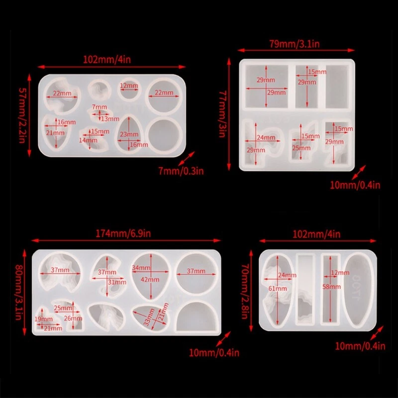 brand new and high quality Features: Made of silicone, eco-friendly, non-toxic, flexible, reusable and durable. Non-stick, easy to separate, temperature resistant, easy to clean, eco-friendly, low carbon, can be recycled. Simple and useful, healthfulness, corrosion resistant and adaptability Perfect for jewelry pendant making, making, soap making, clay and epoxy resin crafting projects Included claw nails, open rings, rope accessories, which are be perfect for you and your family DIY together. Unique Gift for Someone You Value: Give your gifts to your loved ones, on birthdays, Christmas, New Years, weddings, Silicone Mold and DIY Accessories Set only, other accessories in the picture is not included. Specification: Mold Material: Silicone Mold Size: app.10.2x5.7x0.7cm/4.02x2.24x0.28in 2 Mold Size: app.7.9x7.7x1cm/3.11x3.03x0.39in 3 Mold Size: app.17.4x8x1cm/6.85x3.15x0.39in 4 Mold Size: app.10.2x7x1cm/4.02x2.76x0.39in Mold Color: Transparent Quantity: Set Note: No retail package. Please allow 0-1cm error due to manual measurement. pls make sure you do not mind before you bid. Due to the difference between different monitors, the picture may not reflect the actual color of the item. Thank you! Package Contents: 4 Pcs x Silicone Molds Set x DIY Accessories